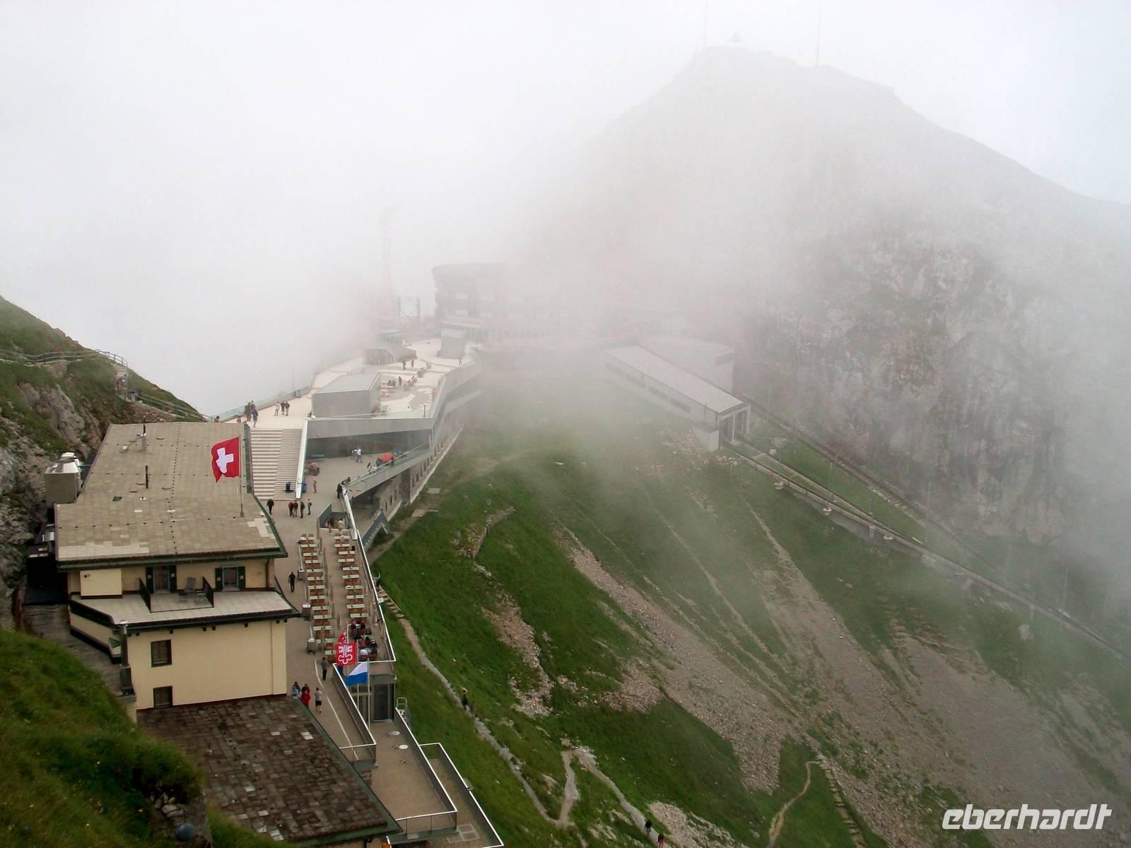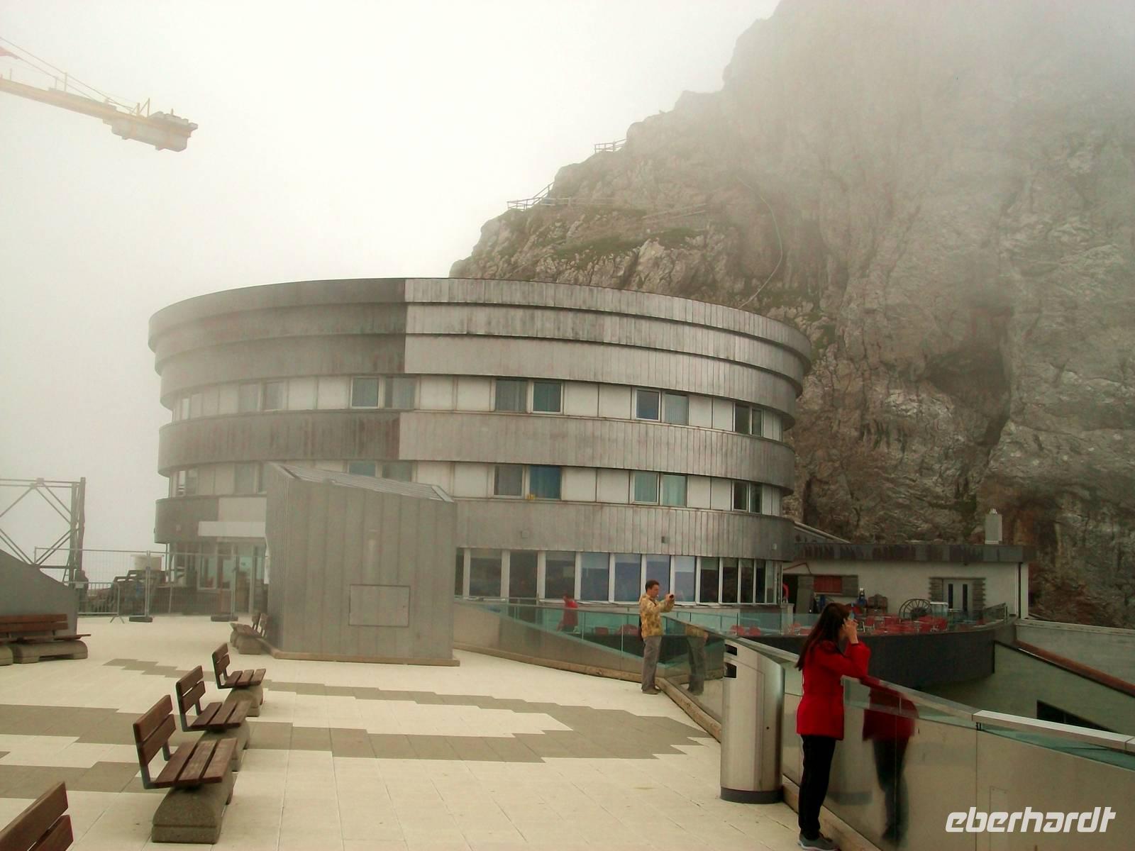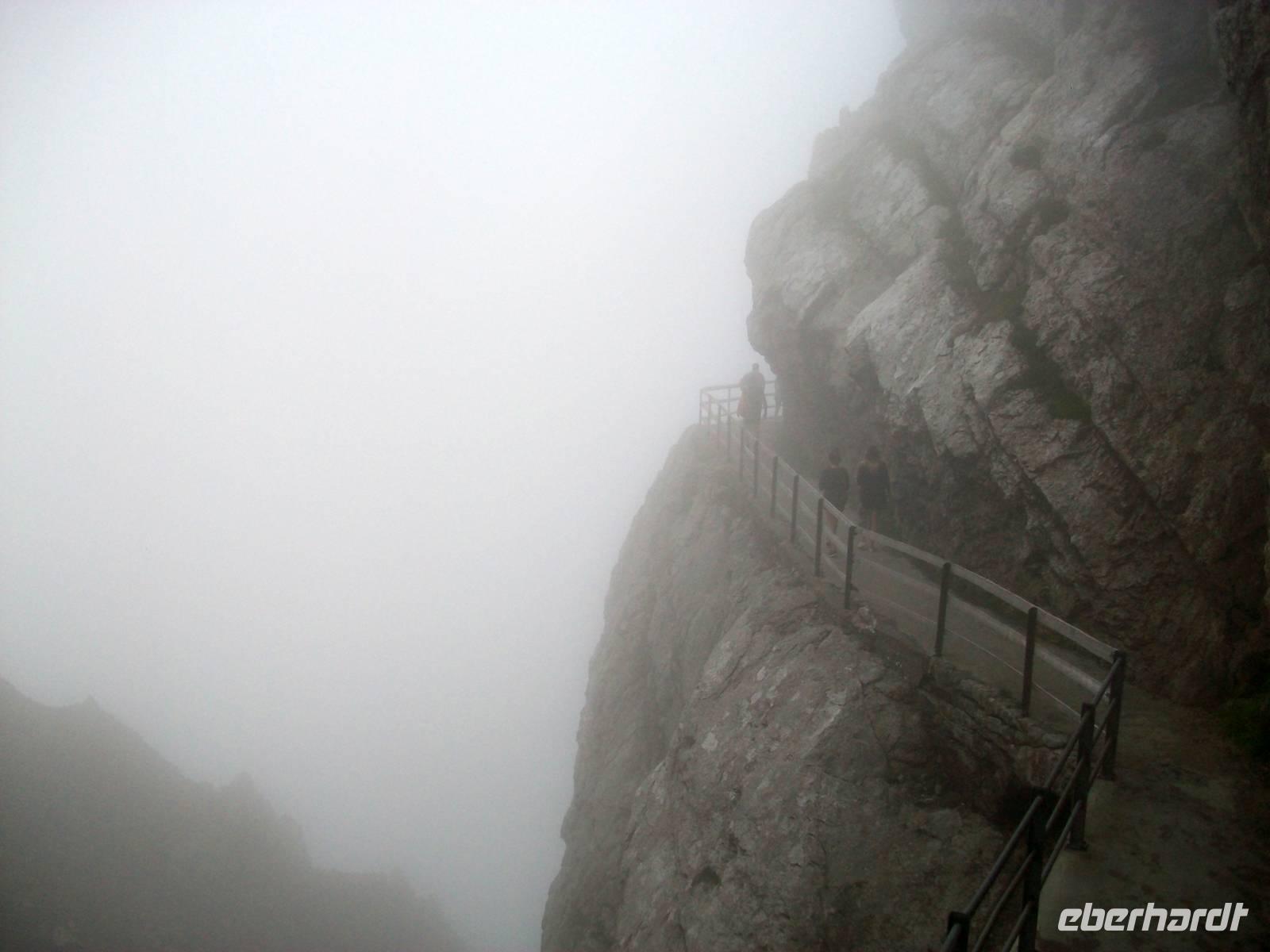 Dann tauchen wir ein in die Wolken die uns jede Sicht unmöglich machen; zunächst langen wir aber am Hotel an, die Zimmer werden verteilt und dann verbleibt bis zum Abendessen noch Zeit für die verschiedenen Aussichtspunkte des Berges.