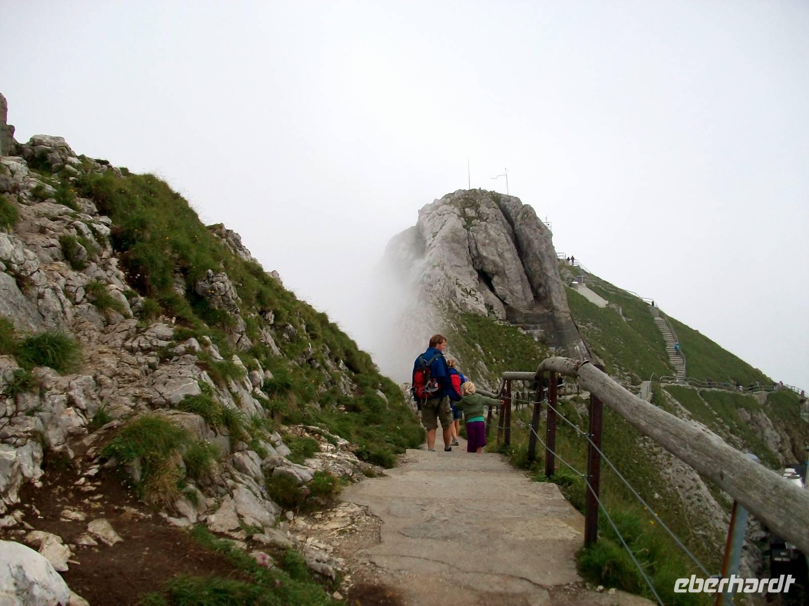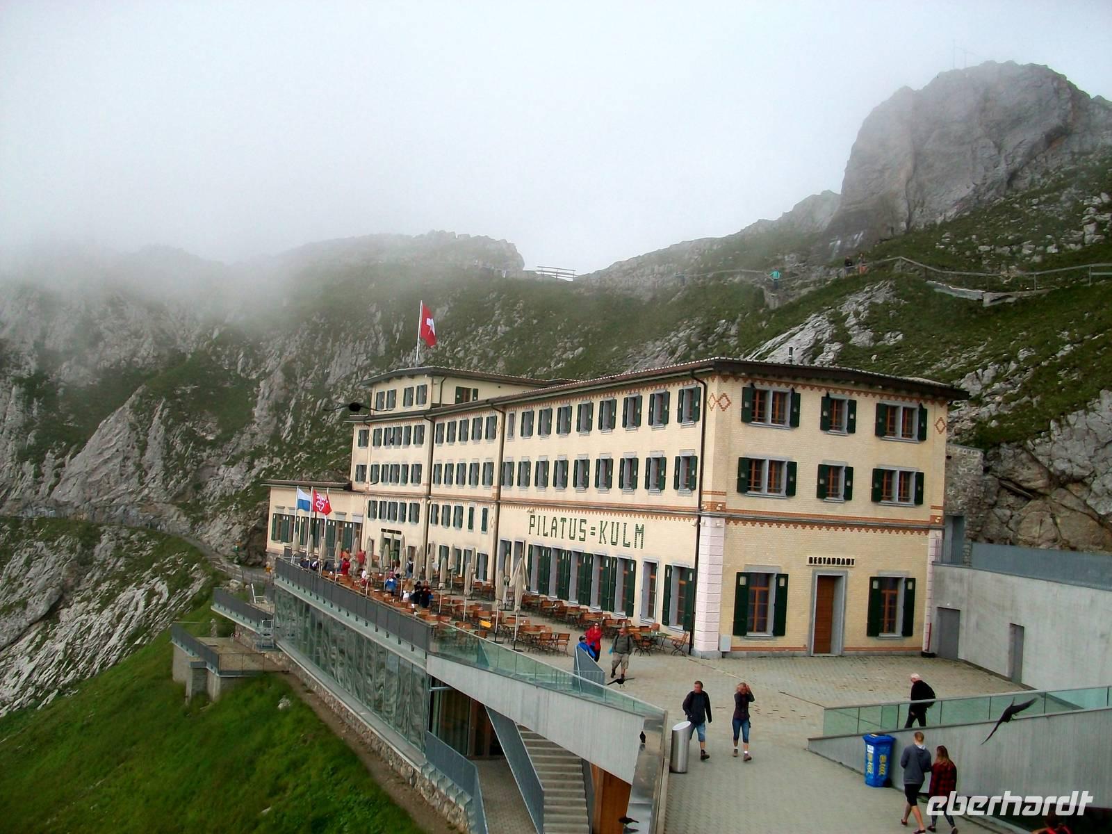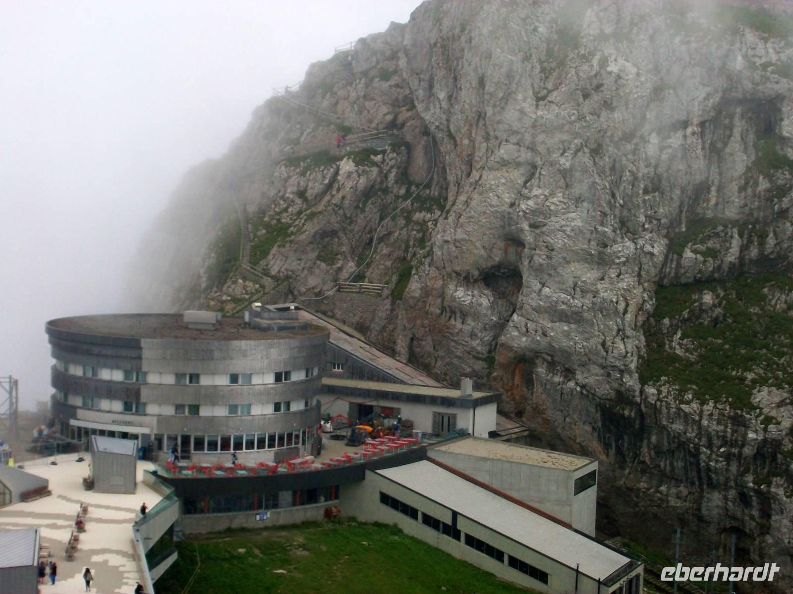 Dann tauchen wir ein in die Wolken die uns jede Sicht unmöglich machen; zunächst langen wir aber am Hotel an, die Zimmer werden verteilt und dann verbleibt bis zum Abendessen noch Zeit für die verschiedenen Aussichtspunkte des Berges.