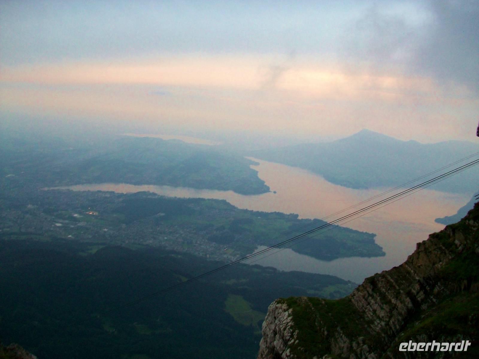 Zunächst gelangen wir mit der Luftseilbahn zu Tal; erst mit der großen Gondel welche unsere kleine Gruppe komplett aufnimmt, dann steigen wir in die kleinen Kabinen ein die jeweils vier Personen fassen. Das ist nun noch einmal sehr beschaulich; leise ruckelnd überqueren wir die Bergwiesen des Pilatus auf denen Kühe grasen, sie machen sich bemerkbar mit dem Gebimmel ihrer Glocken, das ist Schweizer Romantik pur!