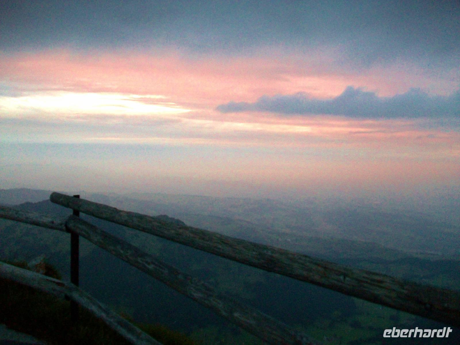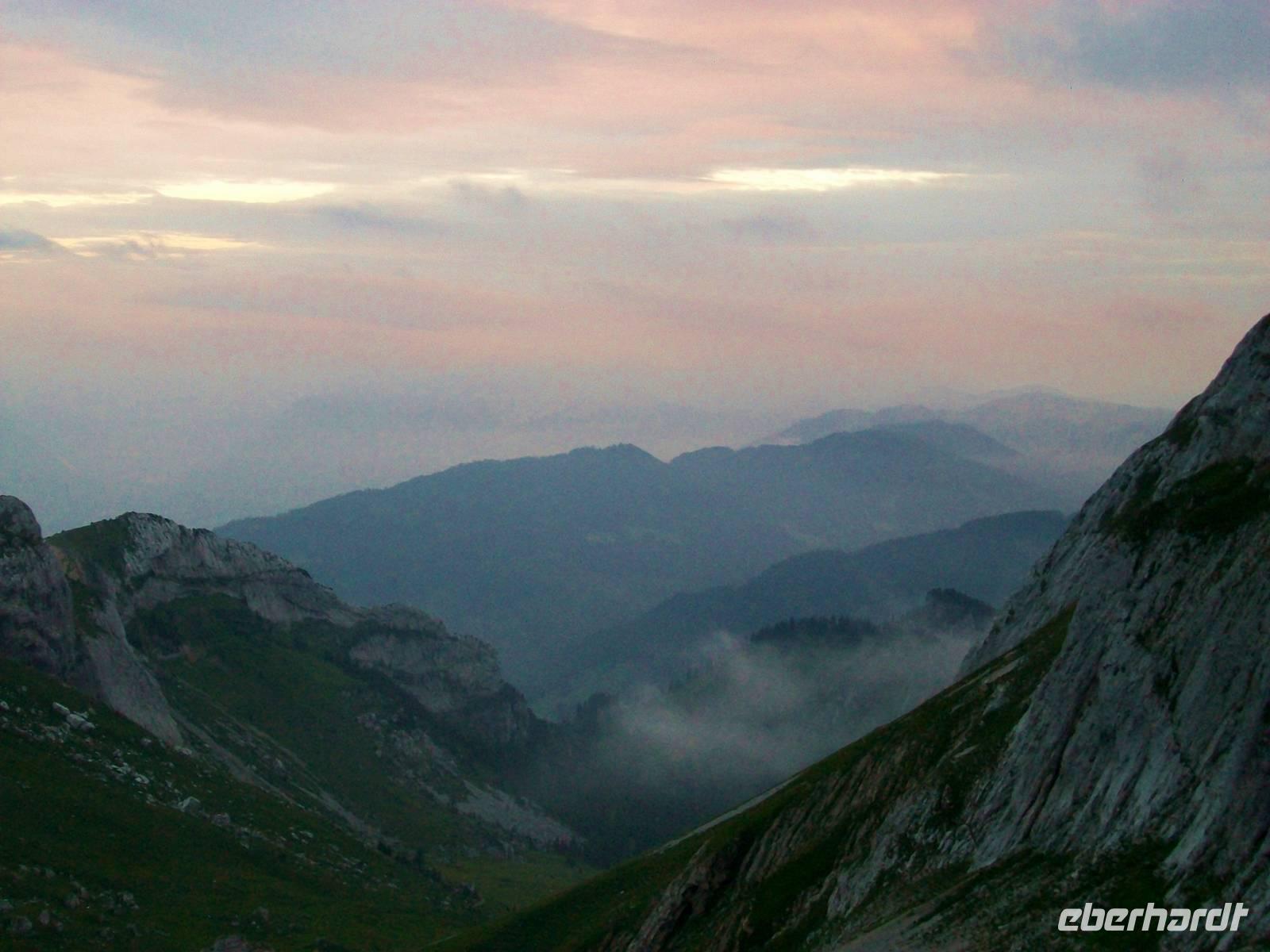 Danach hat Petrus die Wolken weggeräumt und der Blick kann hinunter gehen; die Sonne hat ein leichtes Abendrot auf den Himmel gezaubert und das ist nun doch noch ein wirklich schöner Abschluss des Tages!