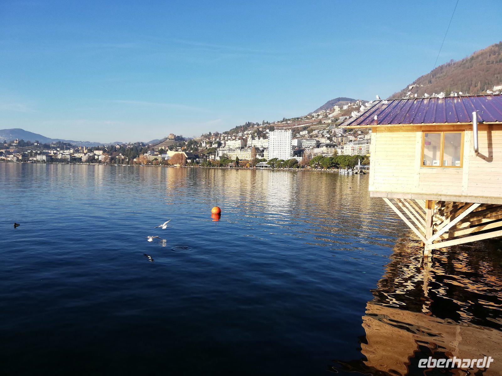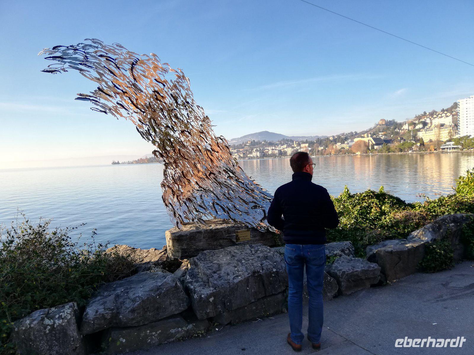 (Sänger von Queen)in seiner typischen Pose bei Auftritten. Unter Palmen und einen schönen Blick auf den Genfersee genießen wir die angenehme Atmosphäre.