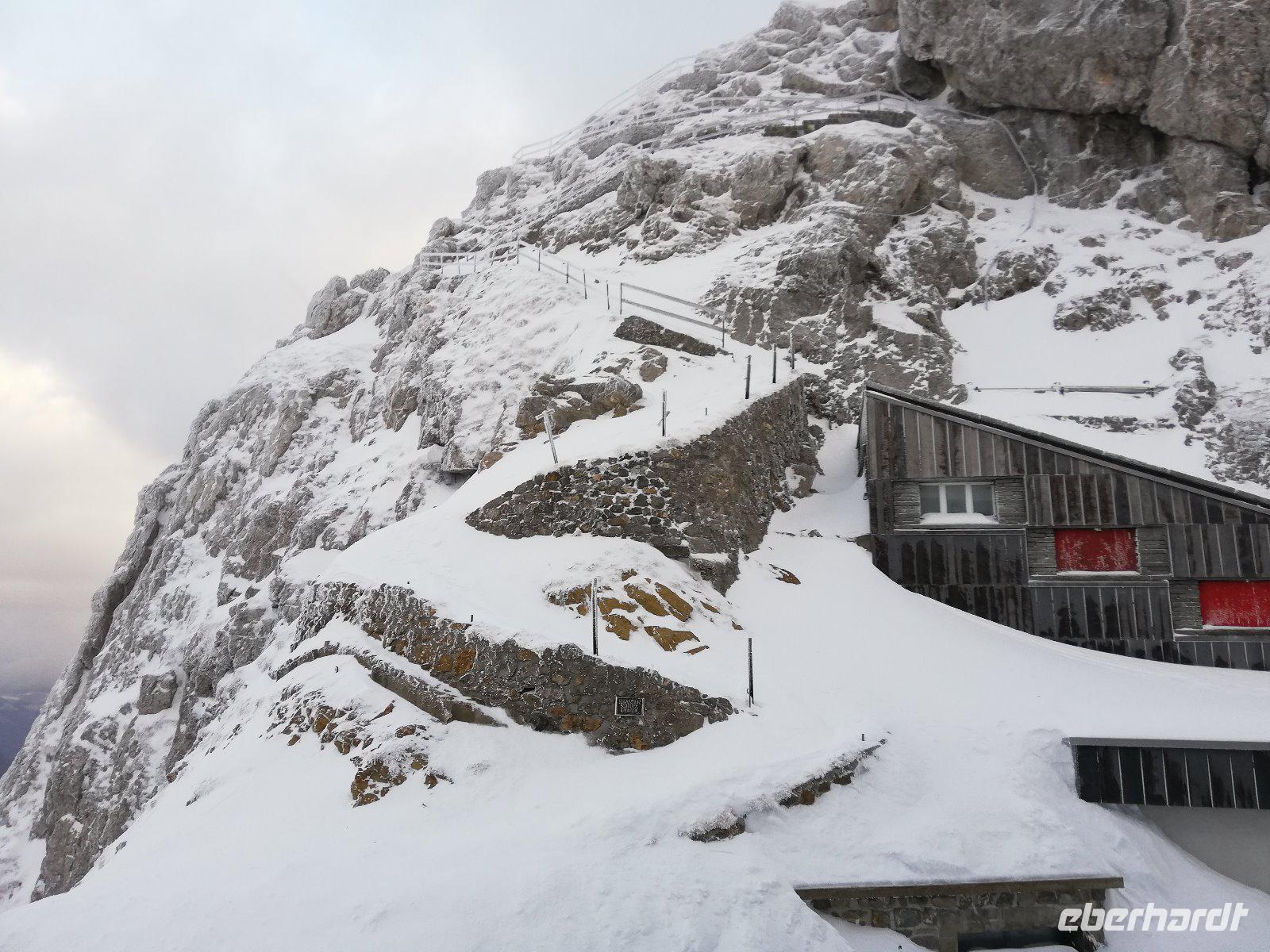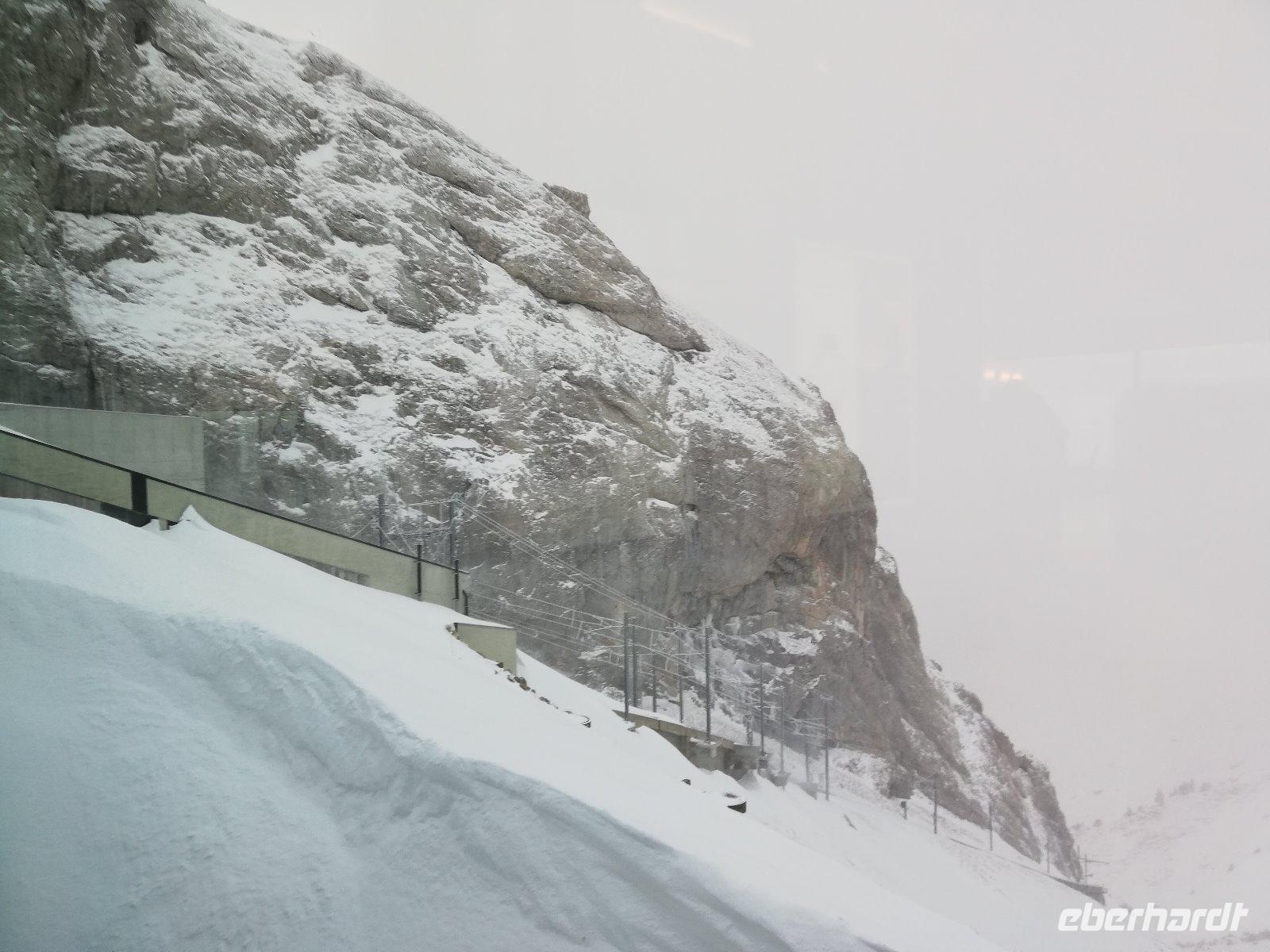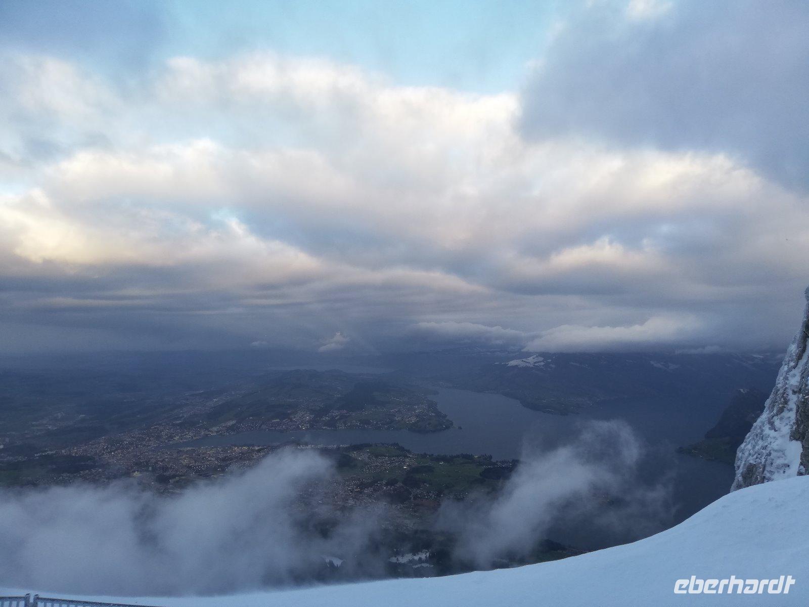 angekommen reisen die Wolken zeitweise auf und wir können Luzern erkennen. Dabei erleben wir auch hier starken Wind und Schneefall. Die Wanderwege sind alle gesperrt und wir ziehen uns in die Pilatus-Kulm-Hotels zurück. Nach einem Aperitif in der Steinbockbar spazieren wir die den Saal Queen Viktoria zum Abendessen. Wir genießen ein vollendetes Essen in sehr angenehmen Ambiente. Es ist ein sehr schöner Abschluss unserer Reise.