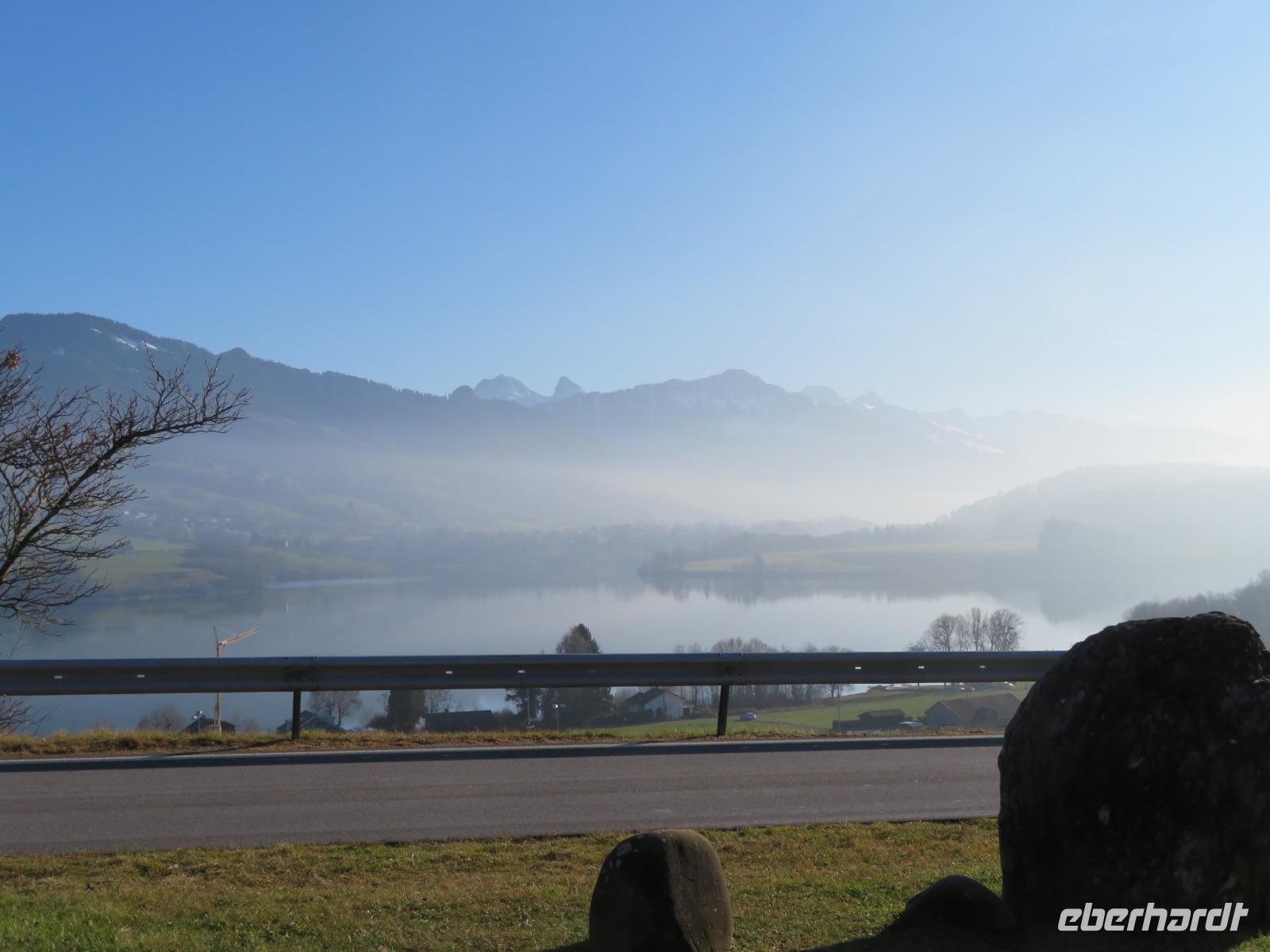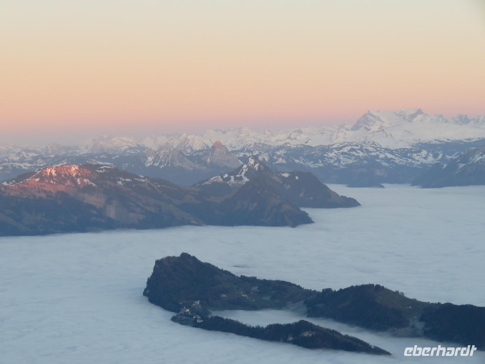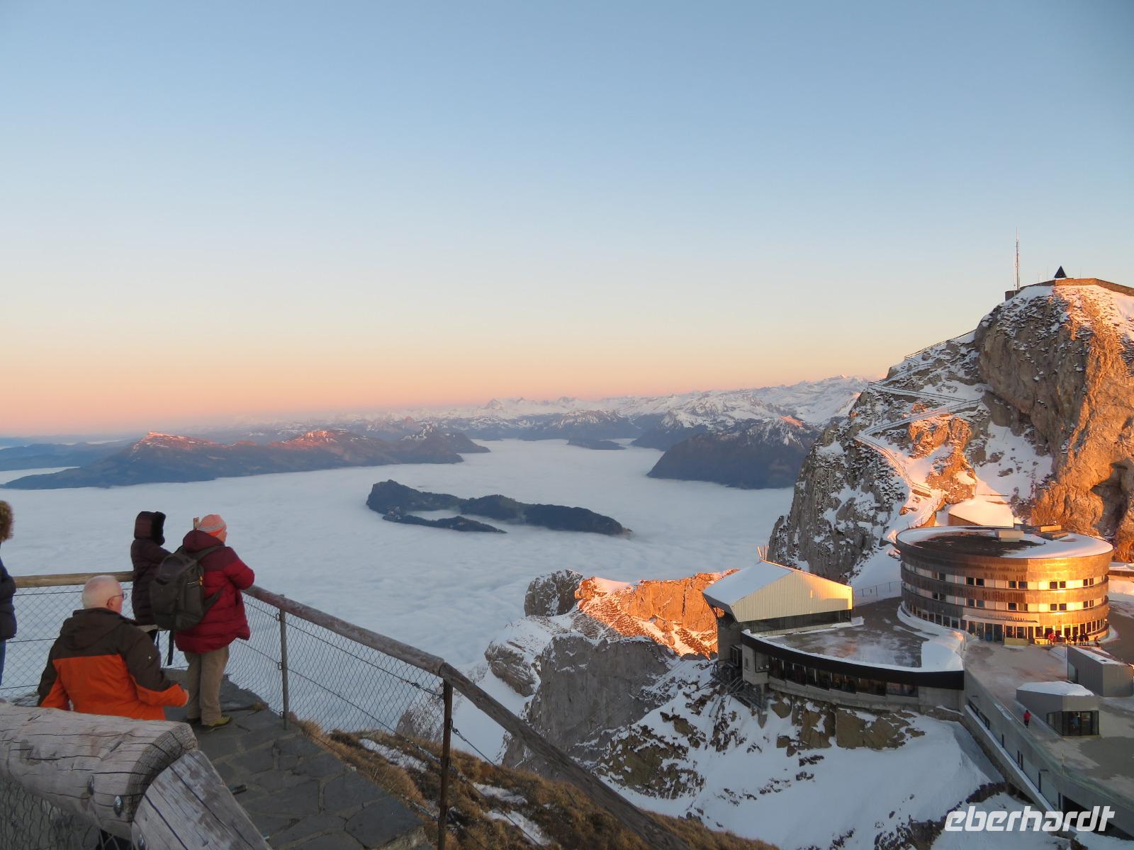 Am heutigen Tag heißt es Abschied nehmen von Brig. Unser Weg führt uns nun weiter zunächst durch das untere Rhônetal vorbei an Sion mit der Kirchenfestung Valeria und der Ruine des ehemaligen Bischofsitzes Tourbillon zum Genfer See. Von hier fahren wir Richtung Norden nach Broc. Wir besuchen die Schokoladen-Manufaktur Callier. Bei einem Rundgang durch die Erlebnisausstellung erhalten wir viele Informationen über den Werdegang der Schokolade von der Entdeckung der Kakaobohne, dem aphrodisierenden warmen Kakaogetränk bis hin zur feinsten Schokolade und Praline. Wir können die einzelnen Zutaten sehen und bei der Produktion der Schokolade zuschauen. Zum Abschluss dürfen wir noch Pralinen und Schokolade verkosten. Natürlich können wir den Köstlichkeiten nicht wirklich widerstehen. So kaufen wir die eine oder andere Tafel Schokolade und Pralinenschachtel für die Lieben zu Hause. Danach reisen wir weiter durch das Berner Oberland vorbei am Thuner- und Brienzersee in die Zentralschweiz über den Brünig-Pass Richtung Kriens. Leider liegt dicker Nebel über der Landschaft. Aber auf dem Brünig-Pass sind wir dann über den Wolken und sehen die Berge des Grimselgebietes. In Kriens besteigen wir die Gondelumlaufbahn zum Fränkmüntegg. Von hier bringt uns die moderne Kabinenbahn „Dragon Ride" auf den Pilatus. In 2.132 Metern Höhe beziehen wir im 3-Sterne-Hotel Bellevue unsere Zimmer. Endlich sind wir über den Wolken und uns eröffnet sich ein herrlicher Blick von den Ostschweizer über die Glaner und Zentralschweizer Alpen bis zu den 4.000ern der Berner Alpen. Wir sehen den Säntis, den Titlis und Eiger, Mönch und Jungfrau. Der Tag geht mit einem wunderschönen Sonnenuntergang, der die Bergwelt in ein sanftes goldenes Licht taucht, zu Ende. Im Queen Viktoria Saal werden wir mit einem sehr schmackhaften Abendessen verwöhnt.
