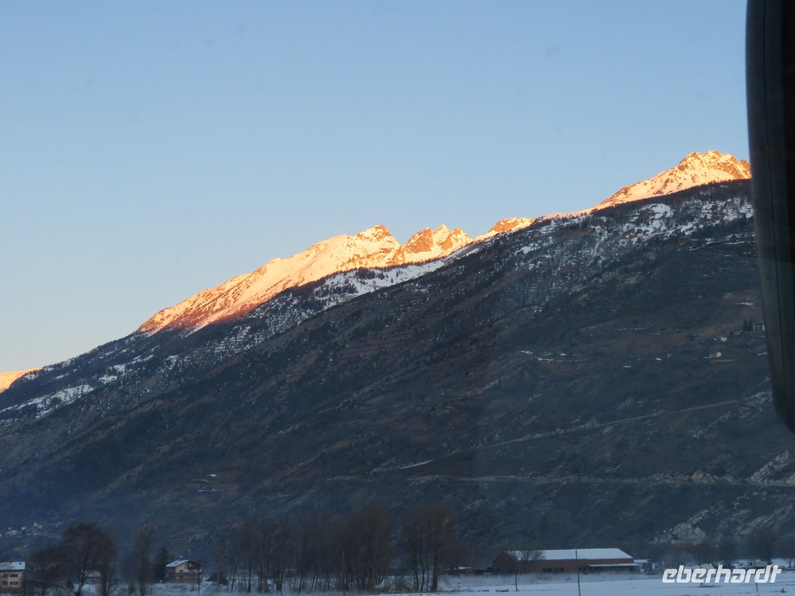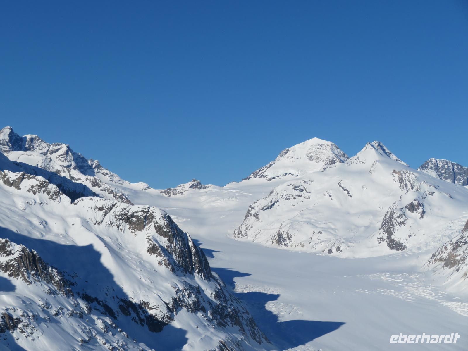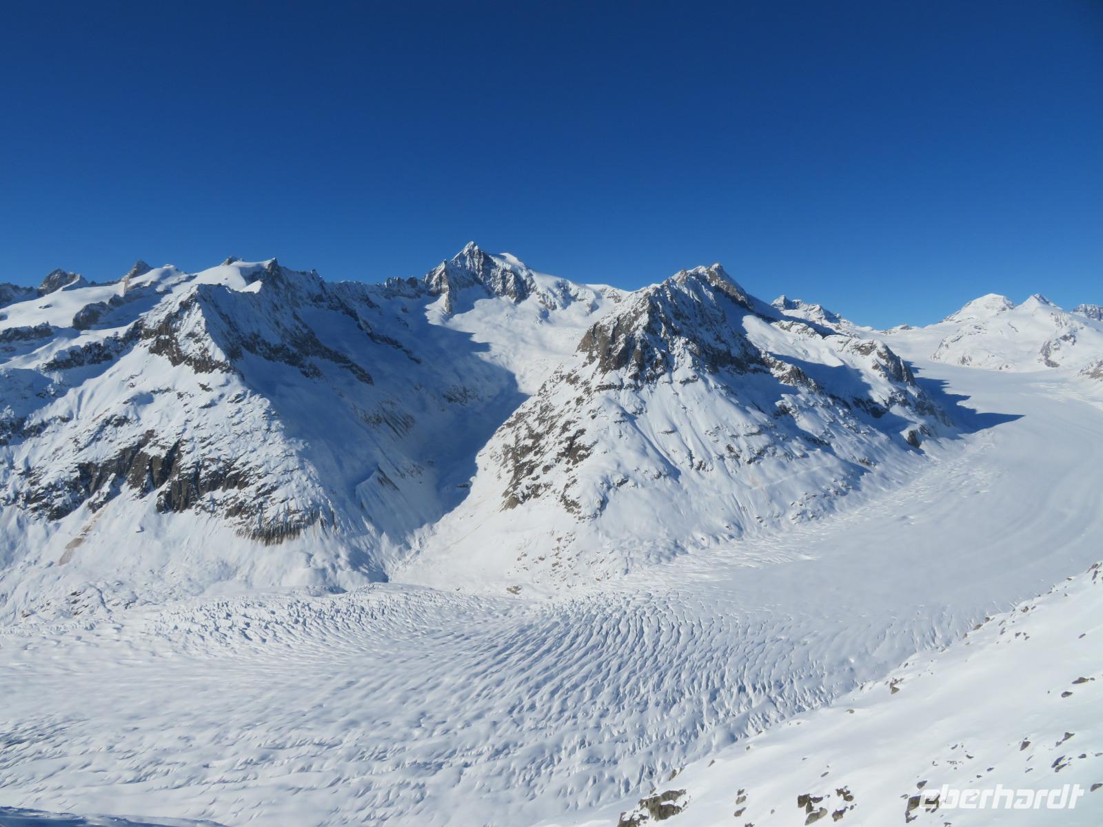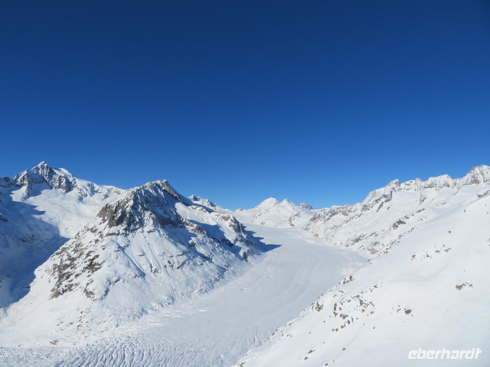 Wieder weckt uns wunderbarer Sonnenschein. Nach dem späten Frünstück steht ein Ausflug auf das Eggishorn auf unserem Programm. Wir fahren zunächst nach Fiesch. Dort erwartet uns die nagelneue Gondelumlaufbahn, welche uns auf die Fiescheralp bringt. Nun geht es hinauf auf das 2.869 Meter hohen Aussichtspunkt Eggishorn. Ganz richtig ist es nicht, denn die Bahnstation befindet sich auf einem Vorgipfel des eigentlichen Gipfels Eggishorns. Uns eröffnet sich eine einmalige Sicht auf das Panorama der Walliser und Berner Alpen. Wir sehen den Mont Blanc das Matterhorn und die gesamte Kette der Walliser Alpen. Unser Blick schweift hinüber zu Eiger, Mönch und Jungfrau und zum Jungfraujoch in den Berner Alpen. Wir bestaunen den Aletschgletscher in seiner vollen Pracht. Dieser ist mit 23 Kilometern der längste Gletscher der Alpen. Umgeben von mehreren Gipfeln, welche über 4.000 Meter hoch sind, bildet der Gletscher das Herzstück des UNESCO-Weltnaturerbes. Nun bleibt noch Zeit, die einmalige Aussicht in vollen Zügen bei herrlichem Sonnenschein zu genießen. Wir können uns kaum satt sehen an dieser Pracht der Natur. Die Kabinenbahn bringt uns hoch über den Pisten schwebend, zurück auf die Fiescheralp. Mit der neuen Gondelbahn geht es wieder hinab ins Tal. Der Nachmittag ist einfach zu schön, um bereits ins Hotel zurückzukehren. Deshalb haben wir uns entschieden, noch eine kleine Rundfahrt zu unternehmen. Wir fahren in das Goms. Diese Landschaft bildet das weite Tal der Rhône mit wunderschönen alten Walliser Dörfern und die umliegenden Berge. Die dunkelbraunen Häuser sind aus Lärchenholz erbaut. Das Tal ist tief verschneit. Wir genießen die wunderschönen Ausblicke in ein wahres Winterwunderland bei einem Glühwein. Nun bringt uns der Bus zurück nach Brig. Wieder geht ein herrlicher Tag für uns zu Ende.
