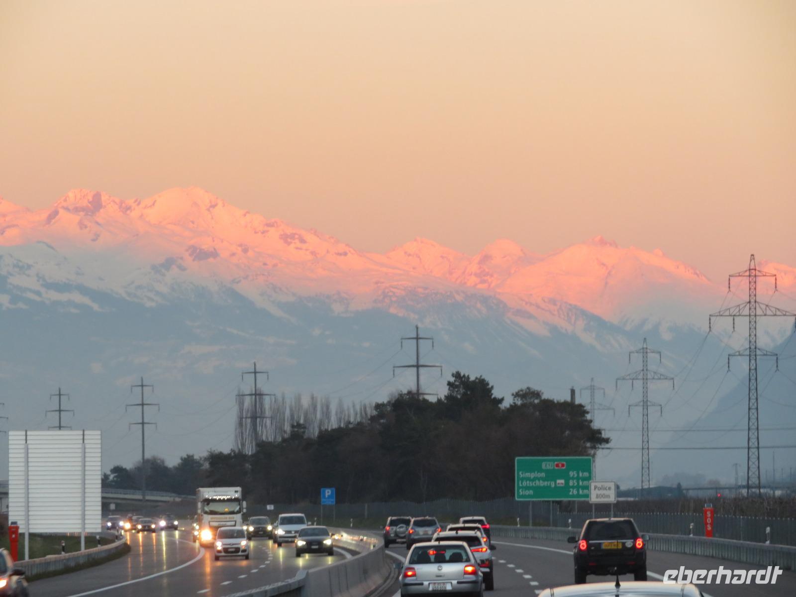 Nachdem wir uns am reichhaltigen Frühstücksbuffet gestärkt haben, erwartet uns der Stadtführer. Wir unternehmen zunächst eine Fahrt mit dem Bus durch die Randbezirke der Stadt am Rhein. Wir sehen die Gebäude der großen Pharmakonzerne Novatis und Roche. Wir fahren durch das Villenviertel und vorbei am Musical Theater. Nun verlassen wir den Bus und beginnen unseren Stadtrundgang in Basel mit zwei Stadtführern. Wir spazieren durch die hübschen Gassen der Altstadt hinauf zum Münster. Auf dem Münsterplatz liegt der Ursprung der Stadt und wir erfahren viele interessante Details aus der wechselvollen Geschichte der Stadt. Von den Münsterterrassen eröffnet sich uns ein wundervoller Blick über den Rhein hinüber nach Klein-Basel mit seinen netten Bürgerhäusern. Unser Weg führt uns durch die engen Gassen von Groß-Basel wieder hinab zum Marktplatz mit dem wunderschön bemalten Rathaus. Nun bleibt noch etwas Freizeit, individuell durch die Gassen zu bummeln. Anschließend erwartet uns unsere Chauffeur Andreas mit dem Bus zur Weiterfahrt in Richtung Wallis. Vorbei an Bern und Fribourg geht es zunächst an den Genfer See. In Montreux legen wir eine Pause ein. Wir spazieren an der schönen Promenade entlang zum Denkmal von Freddy Mercury. Sie erinnert an den großen Musikerr der Gruppe Queen, der in Montreux seine letzten Songs aufnahm. Am Nachmittag reisen wir vorbei an Martigny in das Rhônetal. Die französischen und Walliser Alpen leuchten im herrlichen Abendrot. Am frühen Abend erreichen wir Brig/Naters, wo wir im Hotel Touring bereits erwartet werden.