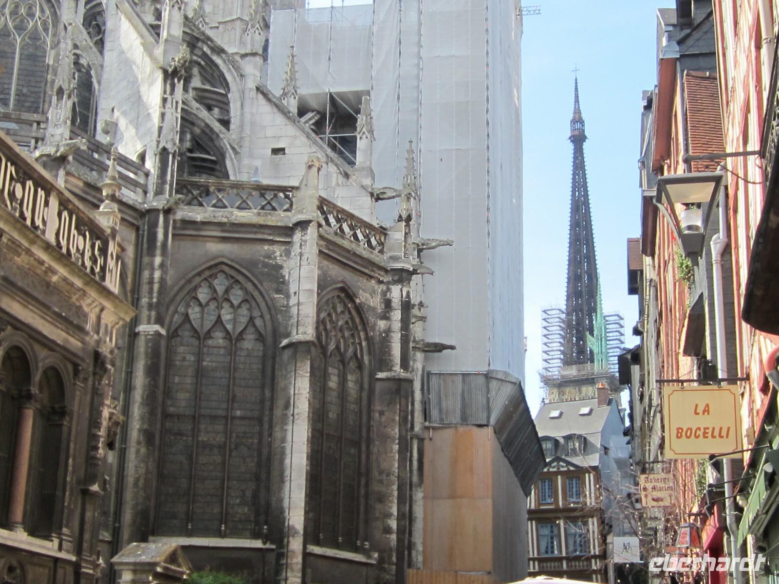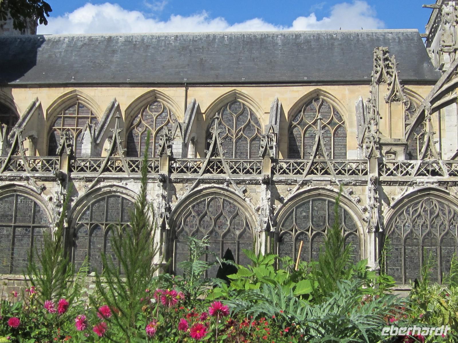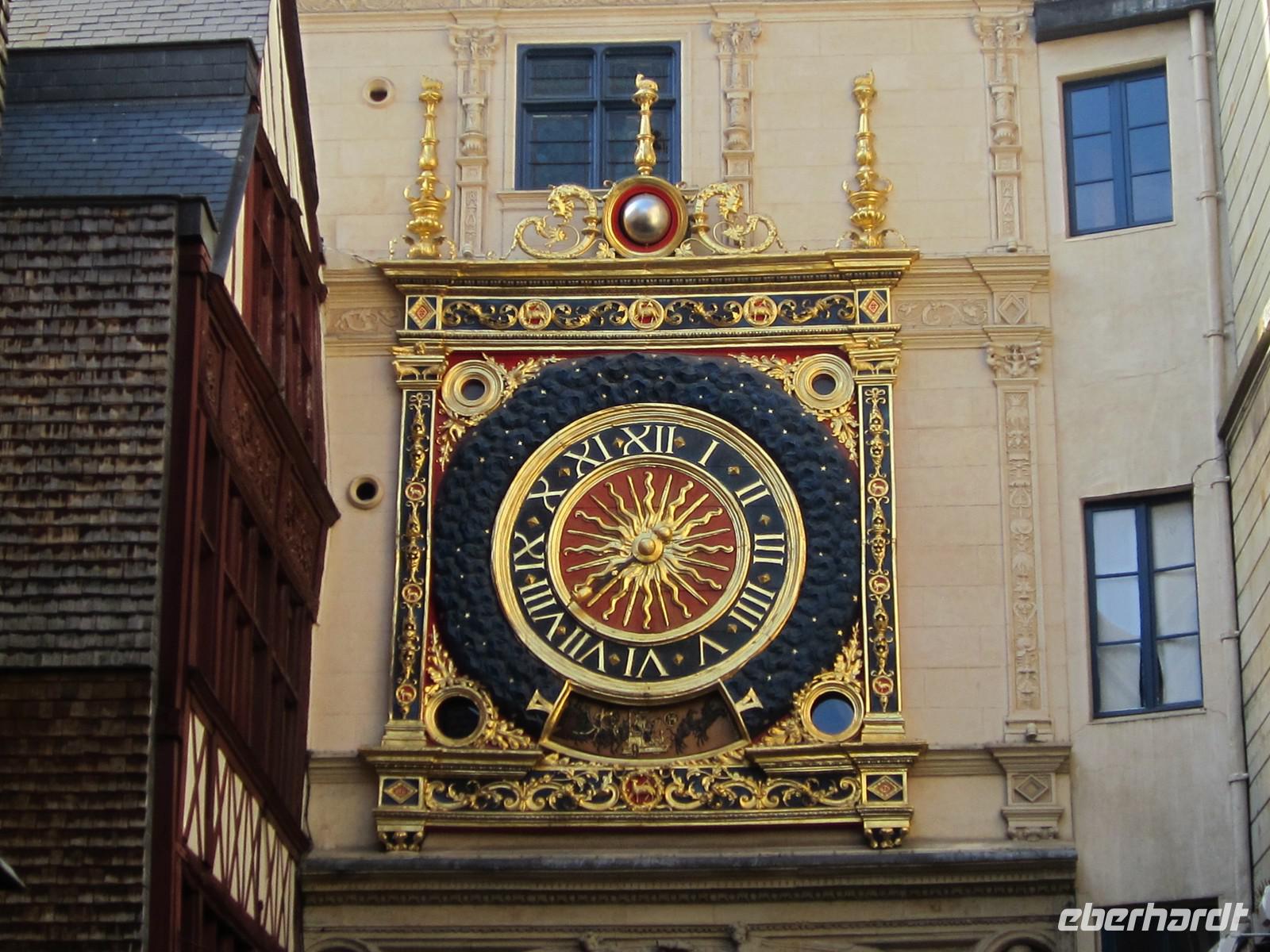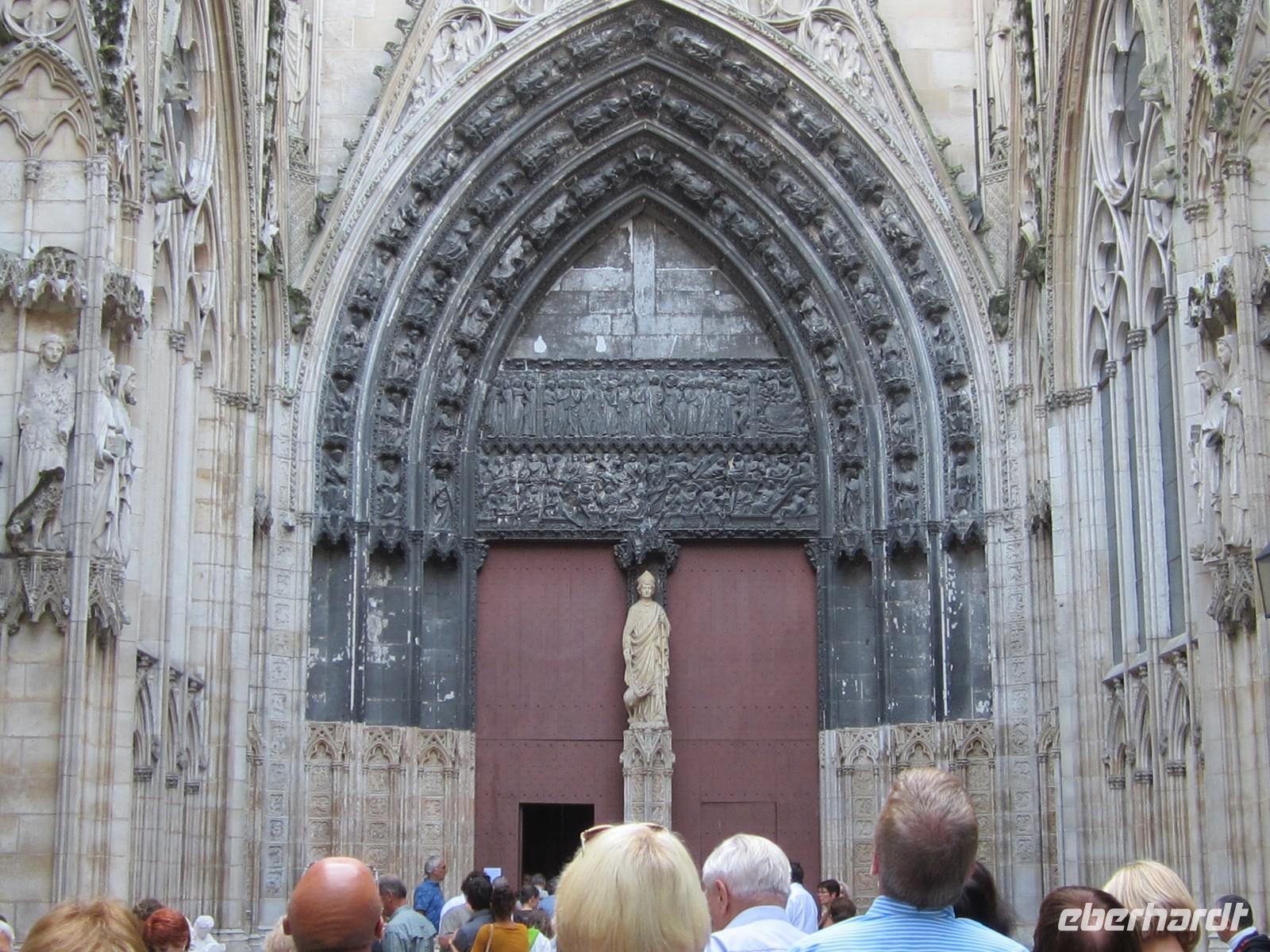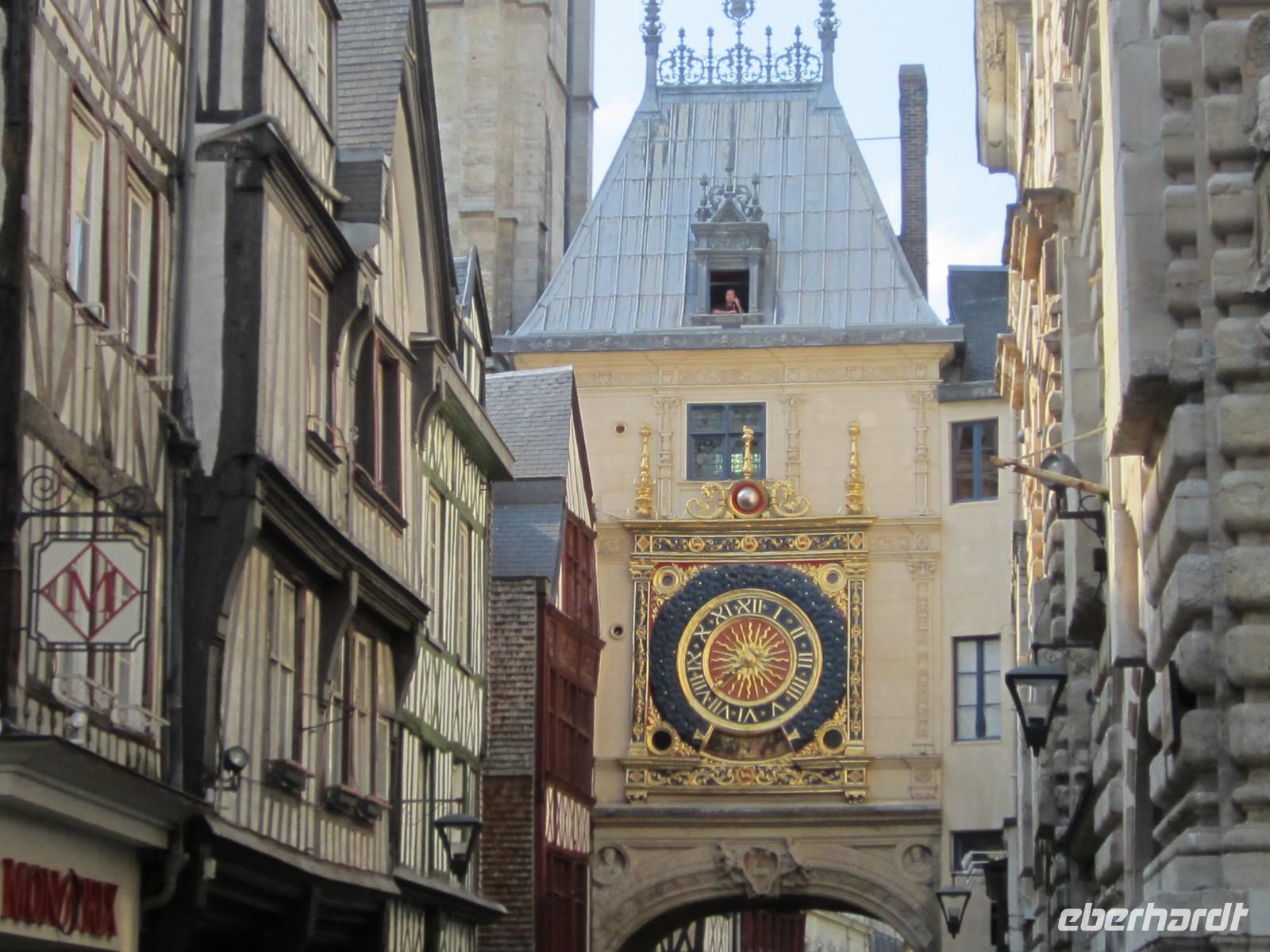 Unser sonntäglicher Ausflug führt uns heute Nachmittag nach Rouen, wo uns unsere örtliche Reiseleiterin Brigitte bereits erwartet. Wir bestaunen die mächtige Kathedrale Notre-Dame, die Kirche St. Maclou und das alte St. Maclou mit seinem Innenhof, der im Mittelalter als Friedhof und Beinhaus diente. Die geschnitzen Totentanzmotive im alten Fachwerkgemäuer deuten noch auf diese Bestimmung hin. Heute dient diese interessante Anlage als regionale Kunstschule. Wir bummeln weiter durch verwinkelte Gassen mit teils schiefen und ebenso verwinkelten Fachwerkhäusern. Auf unserem Weg zum alten Marktplatz, auf dem Jeanne d'Arc im Jahre 1431 nach ihrem Prozess hier in Rouen auf dem Scheiterhaufen verbrannt wurde, durchqueren wir in der Uhrengasse die berühmte Stadtuhr. Auf dem Place du Vieux-Marché erinnern heute eine moderne Kirche, das Museum und ein Kreuz an den Ort des Märtyriums der Jungfrau von Orléans. Nach etwas Freizeit geht es zurück zum Schiff, wo wir zum Abendessen und zum Unterhaltungsprogramm an Bord erwartet werden.