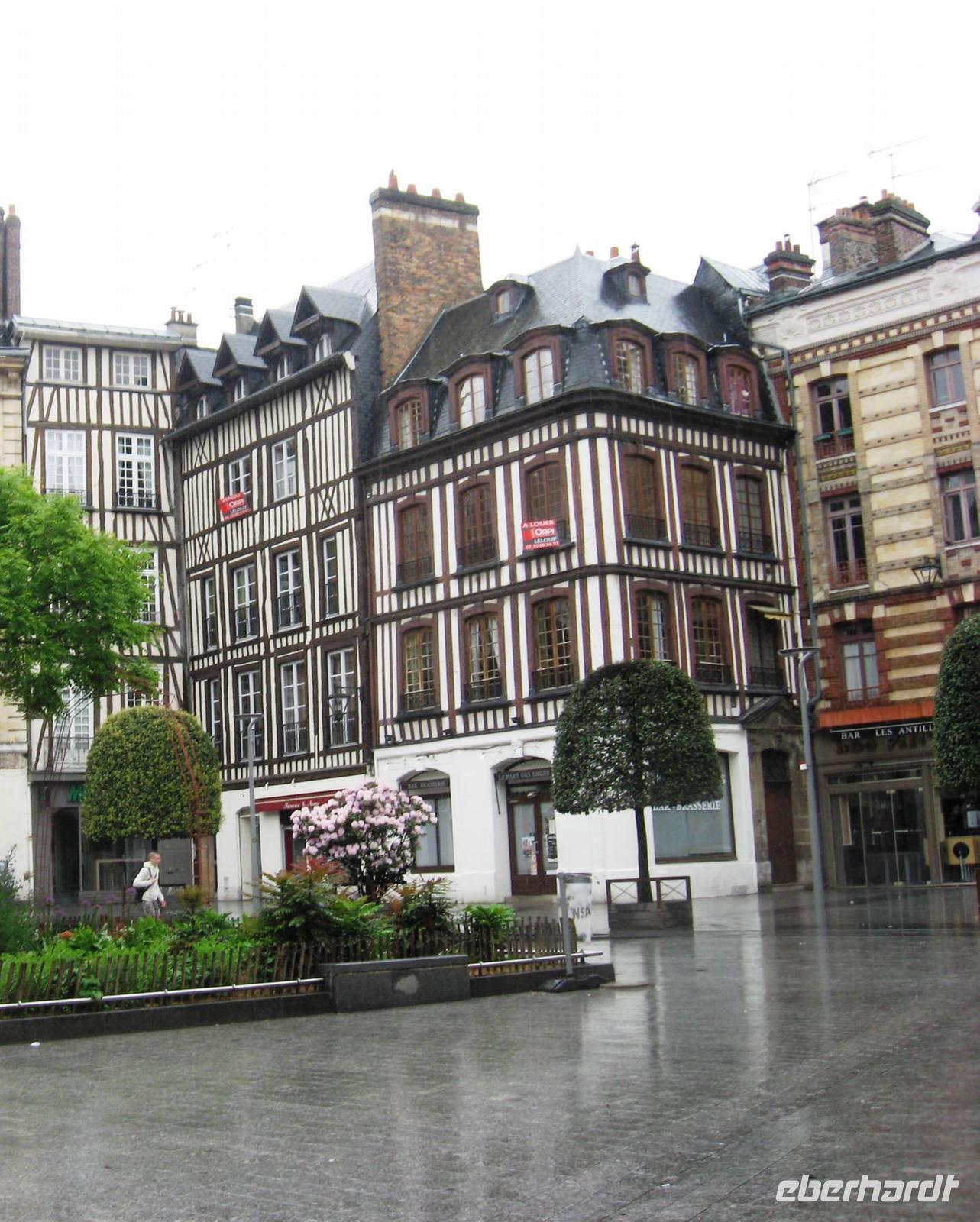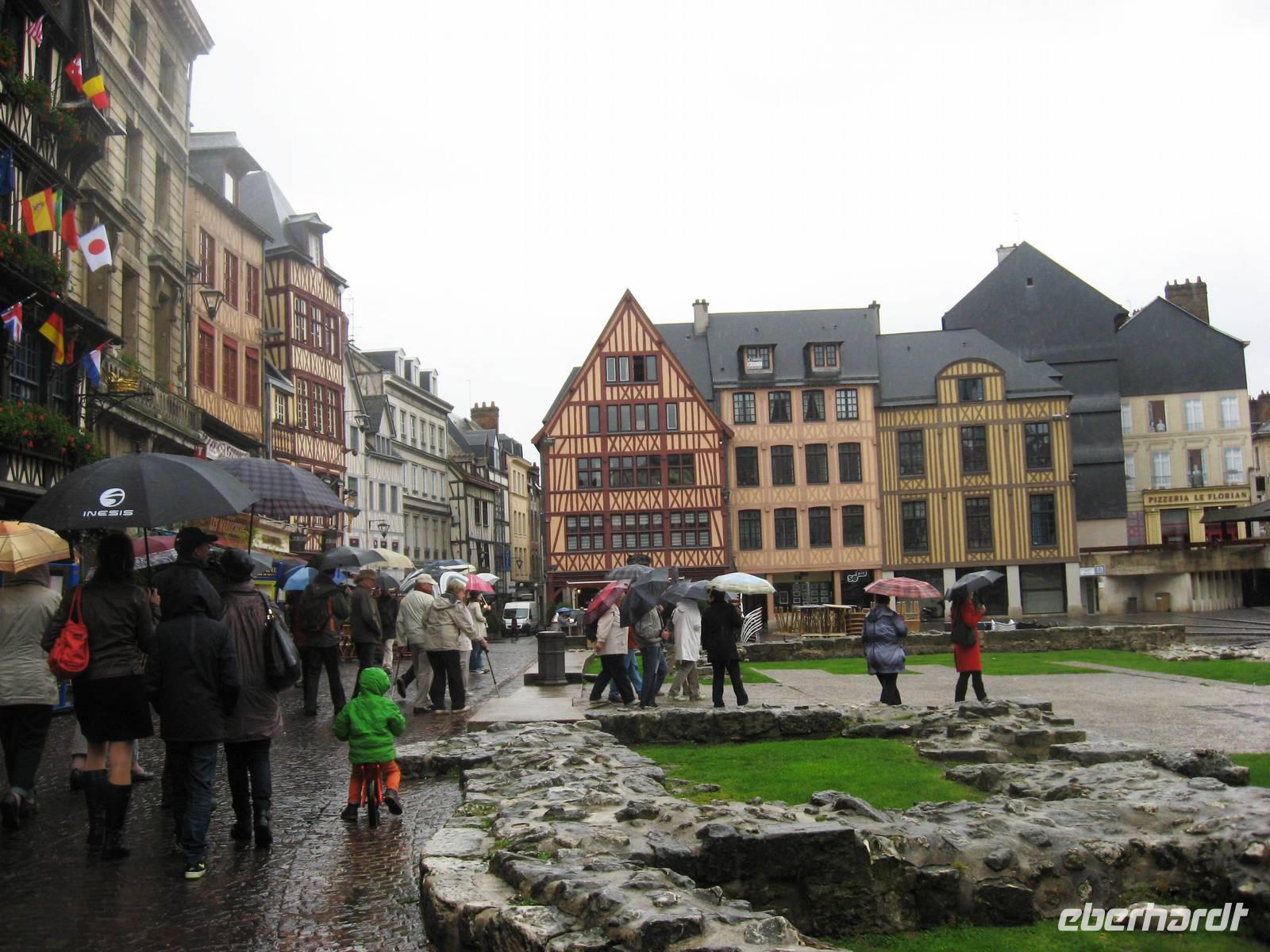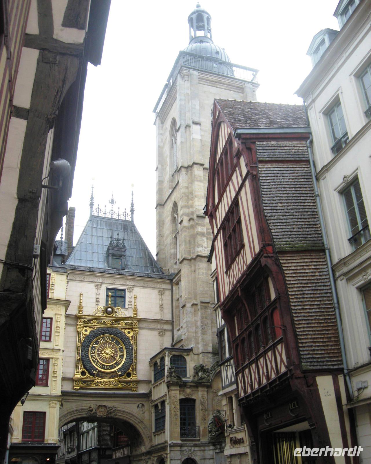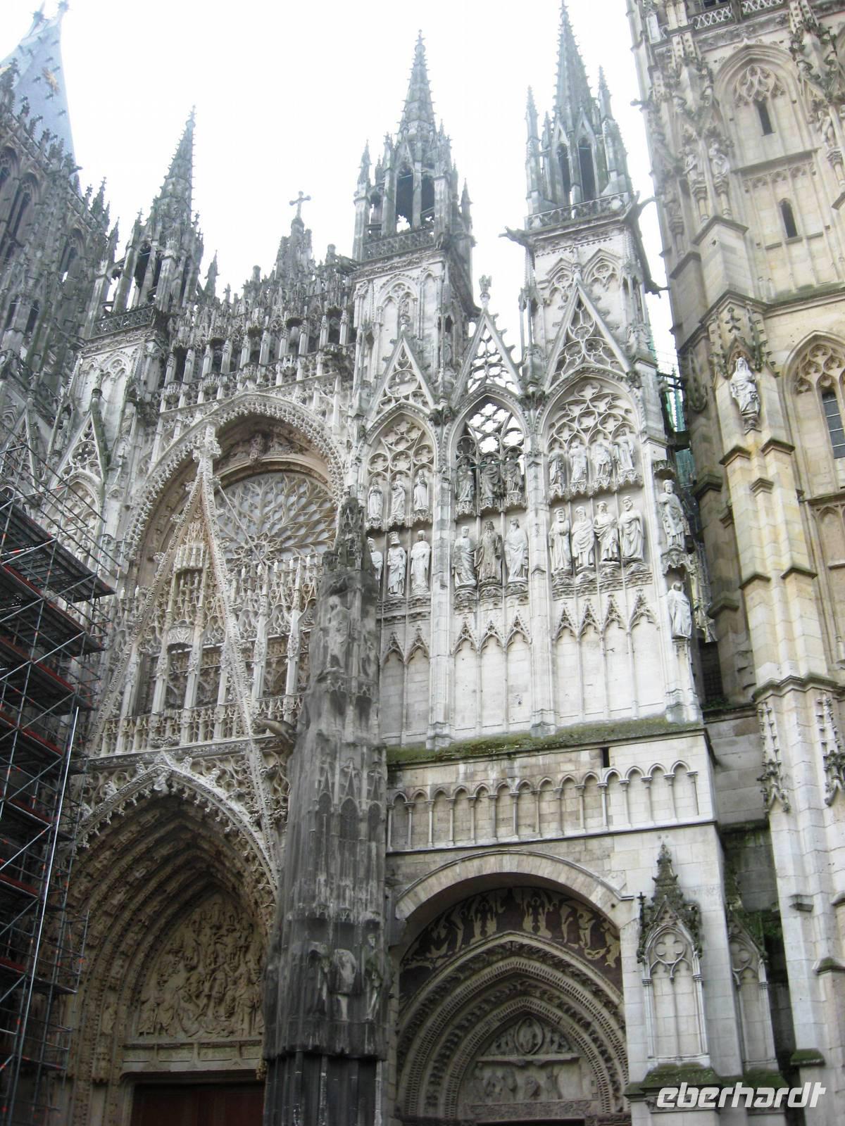 Wir gehen durch die schöne "Rue du Gros Horloge", die nach dem großen schönen Uhrturm benannt wurde. Wie überall in der Innenstadt stehen auch hier rechts und links wunderschöne Fachwerkhäuser. Danach gehen wir zum prächtigen Justizpalast und zum krönenden Abschluss zur großen Kathedrale von Rouen, die ab dem 12. Jahrhundert über mehrere hundert Jahre gebaut wurde und im 19. Jahrhundert über zwei Jahre hinweg von Claude Monet in 33 Werken zu verschiedenen Tageszeiten gemalt wurde. Ein schöner Abschluss für unseren Rundgang durch ein Rouen, das uns mit Regenwetter empfangen hatte.