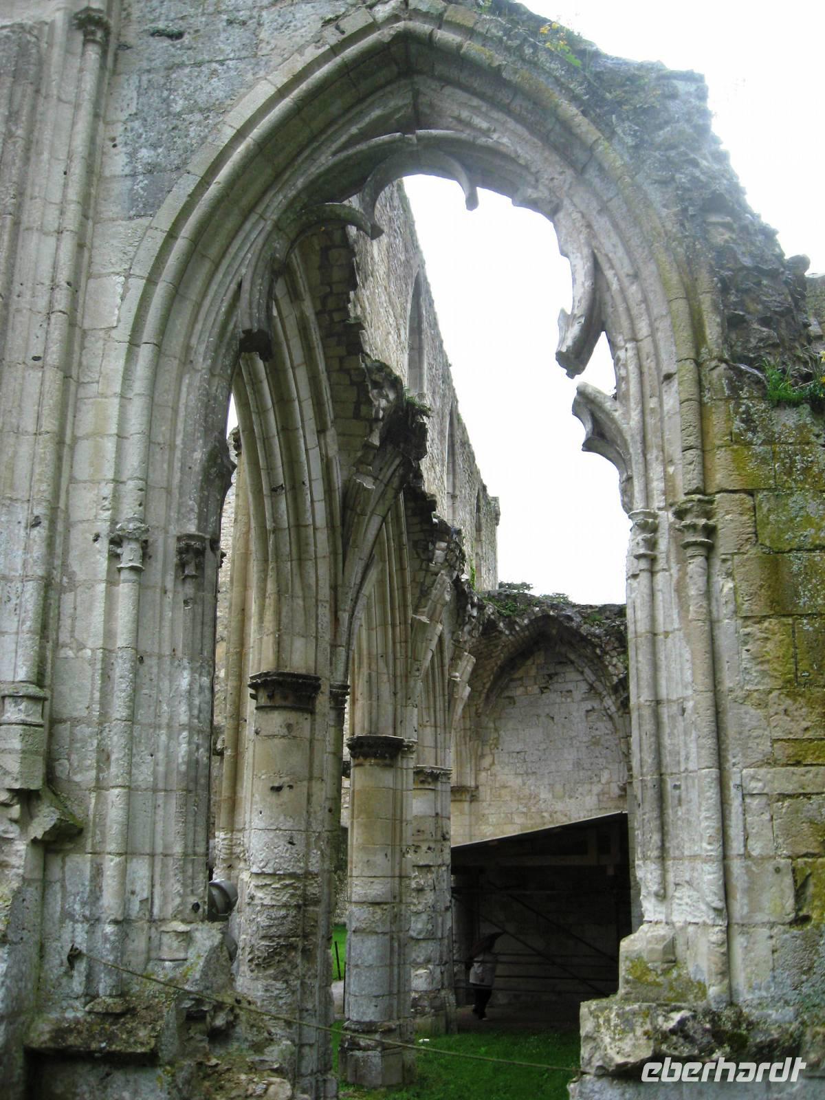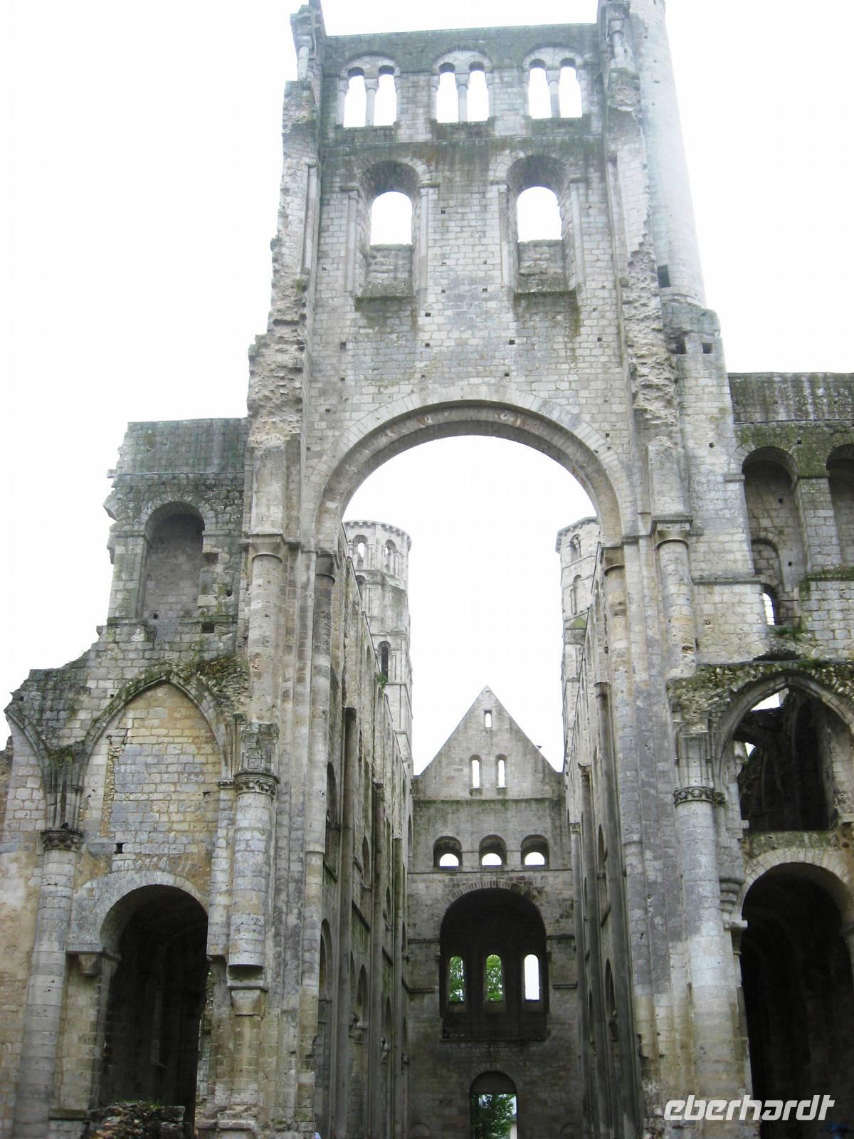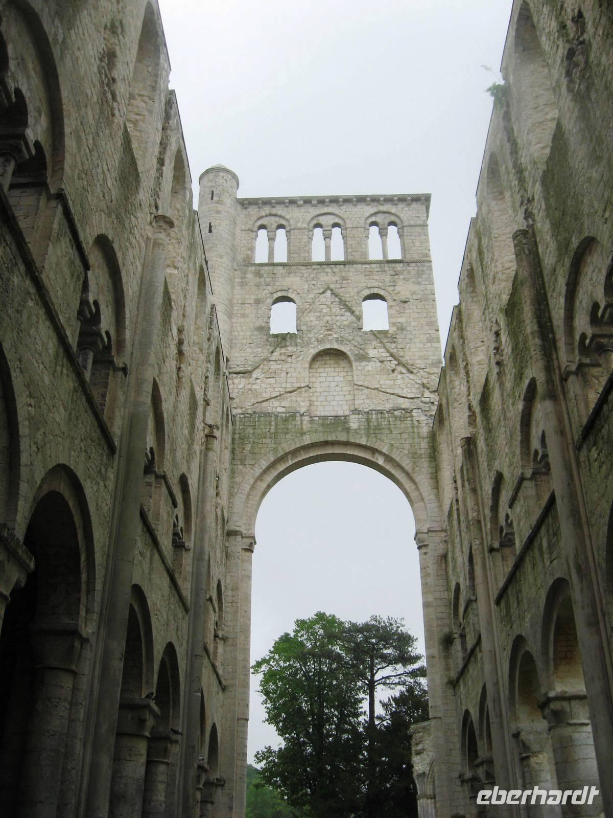 Mittags kommen wir in Caudebec-en-Caux an, wo wir von der Anlegestelle aus einen schönen Blick auf diese kleine, typisch normannische Ortschaft haben, bevor wir zur Benediktinerabtei von Jumièges fahren bzw. der Ruine der enormen Abteianlage. Die 46 m hohen Türme der Abteikirche sind aus der Ferne deutlich sichtbar. Victor Hugo nannte sie die schönste Ruine Frankreichs. Die Abtei wurde im 7. Jahrhundert gegründet. Wir sehen das „Skelett" der einst 88 m langen Abteikirche Notre Dame und das, was von der danebenliegenden Petruskirche noch übrig ist.