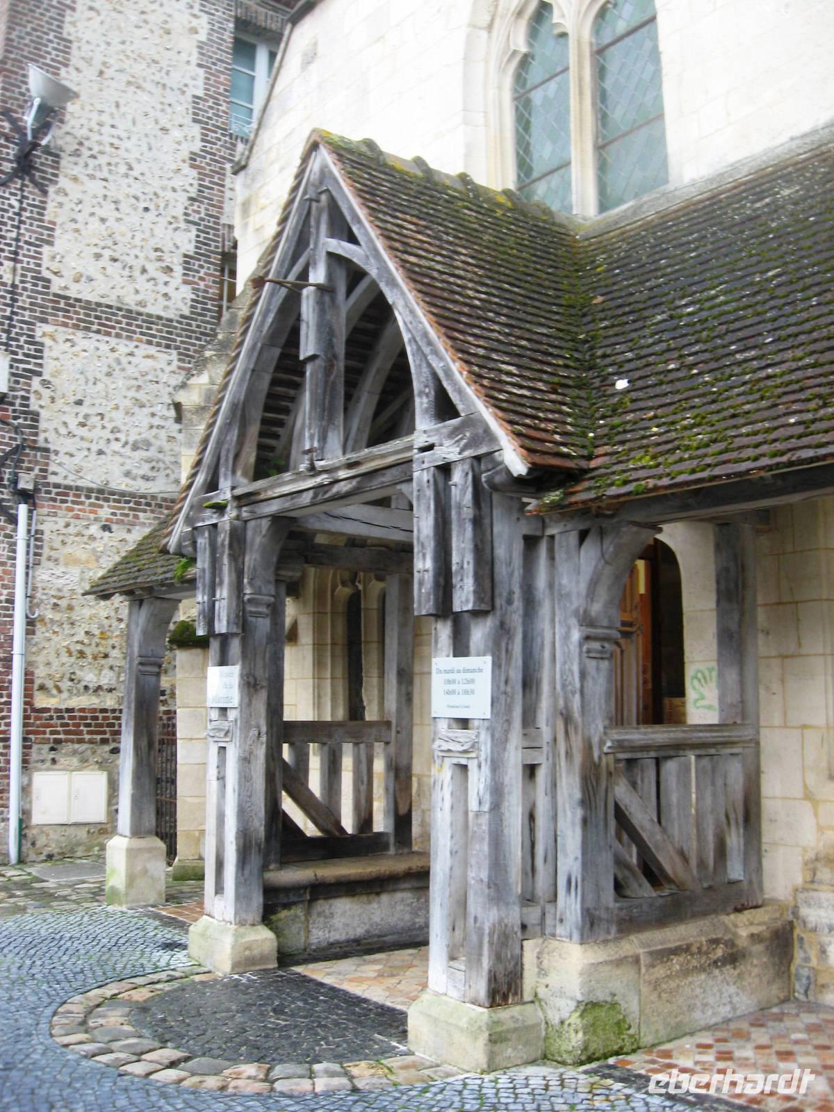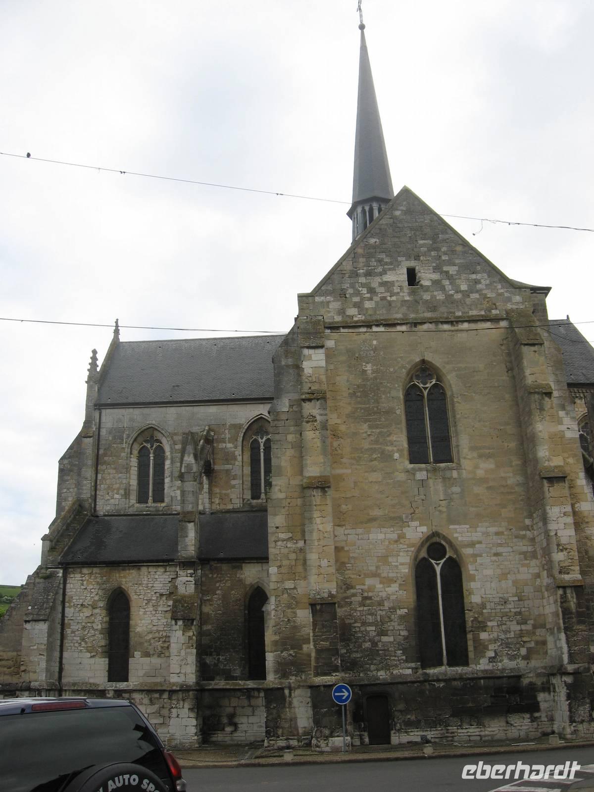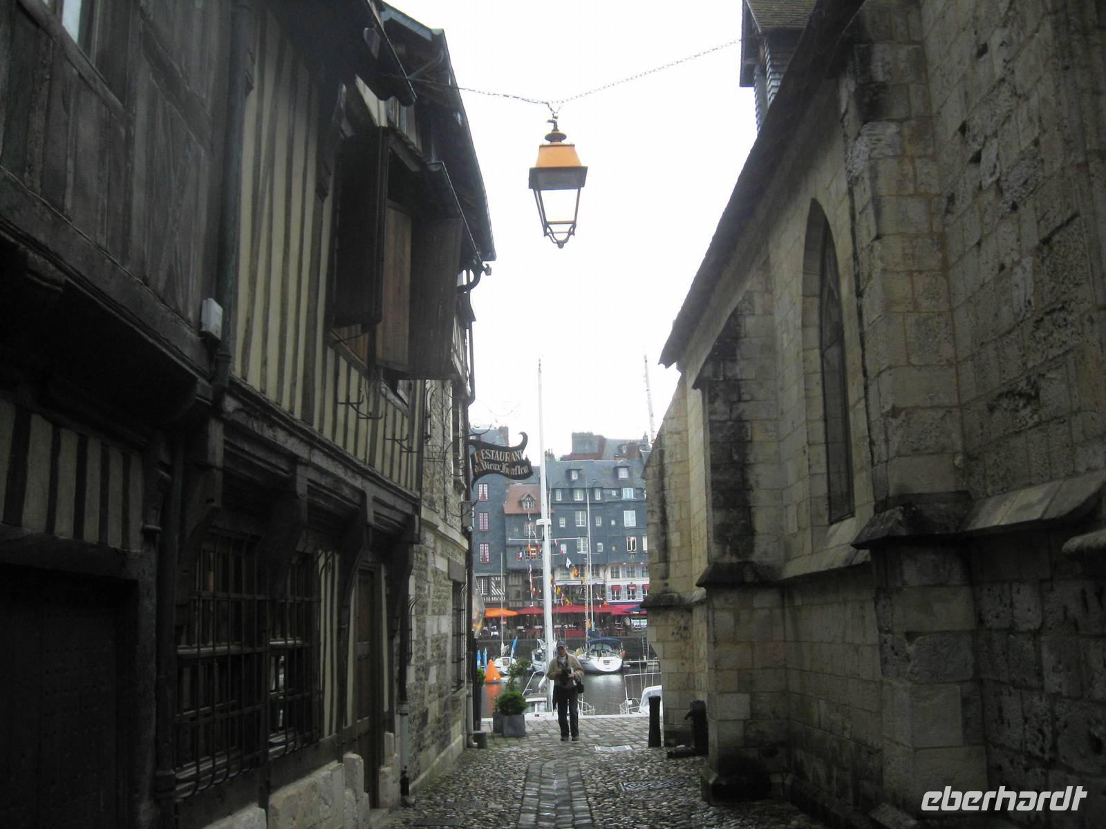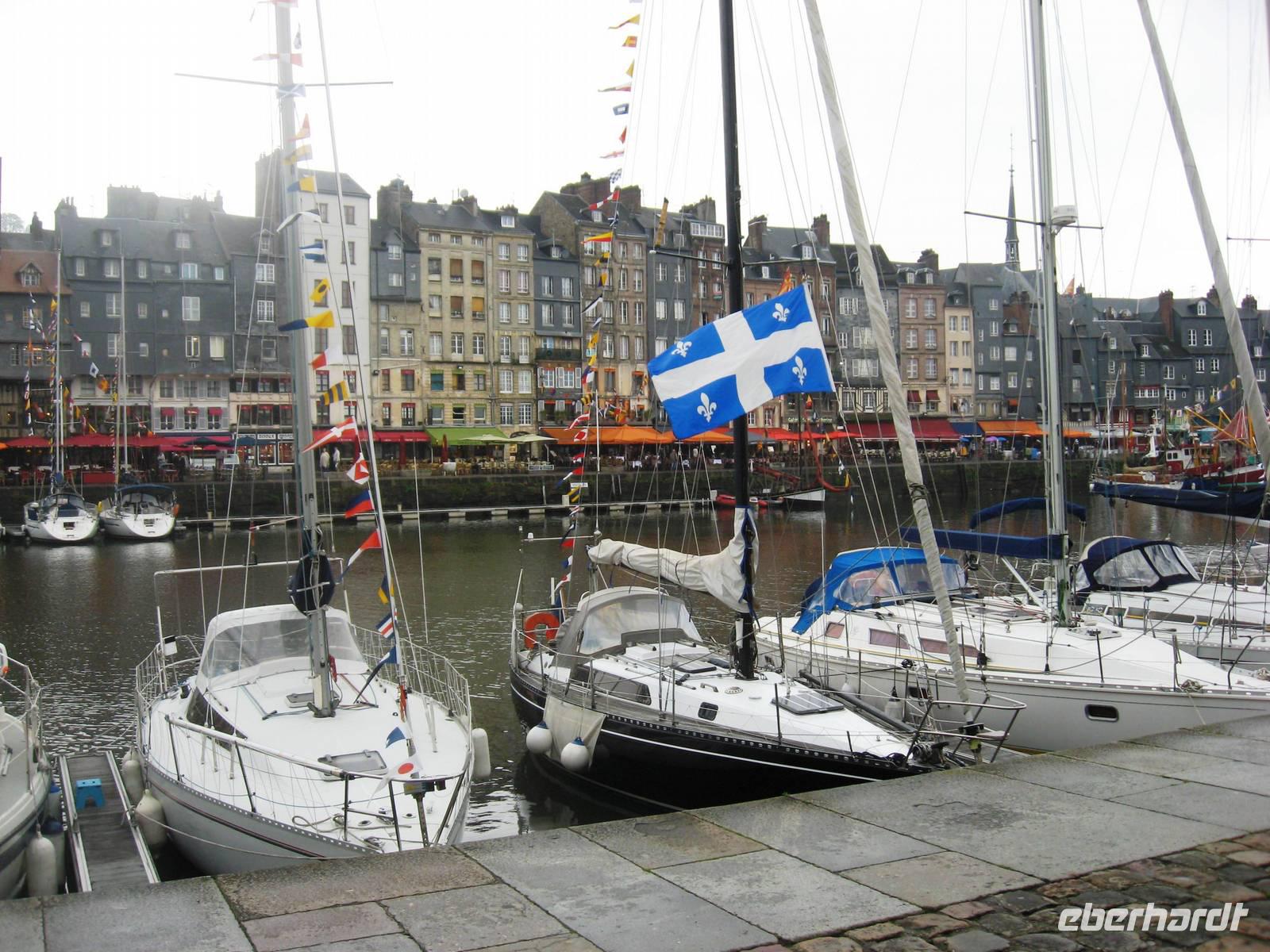Vormittags machen wir einen kleinen Rundgang durch Honfleur. Wir sehen die Salzspeicher aus dem 17. Jahrhundert, die gebaut worden waren, um das für den Kabeljaufang notwendige Salz einzulagern, vor allem aber das alte Hafenbecken, an dem schmale hohe Häuser stehen und die kleine Kirche Saint-Etienne, die heute Marinemuseum ist. Von Honfleur aus stach Samuel de Champlain in See. Er war beauftragt worden, Québec zu besiedeln. Davon zeugt ein kleines Schild, das am Haus des früheren Stadtgouverneurs angebracht ist. Nur einige Minuten Fußweg ist es von hier bis zur Kirche Sainte-Cathérine, die von den Schiffsbaumeistern der Stadt aus Holz gebaut worden ist.