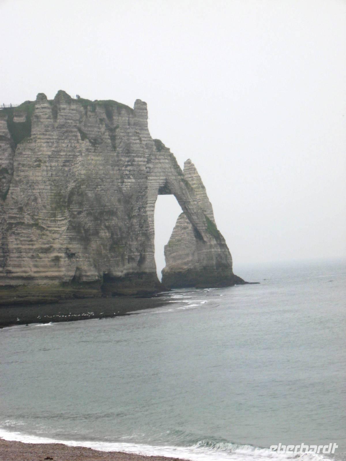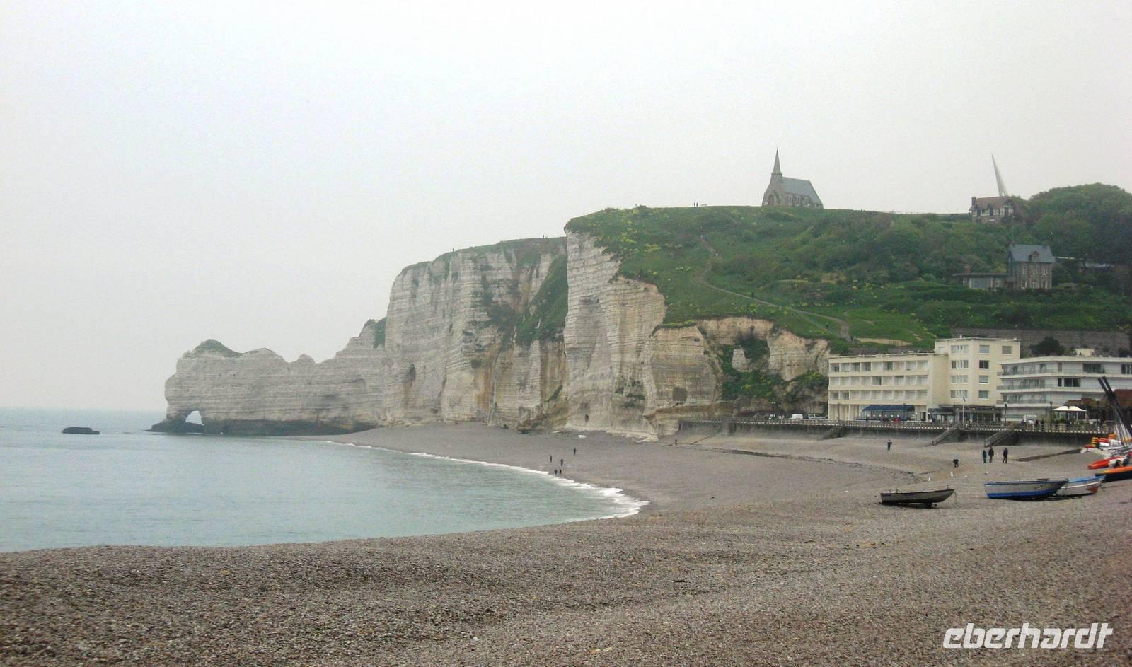Nach dem Mittagessen fahren wir durch das grüne Hinterland nach Etretat. Ursprünglich ein kleiner Fischerort, erlangte Etretat ab der Mitte des 19. Jahrhunderts Bedeutung als Badeort. Wir sehen wunderschöne Villen. Claude Monet hat die berühmten Kreidefelsen von Etretat, die „Falaise d'Amont", die „Falaise d'Aval", die „Aiguille" und die „Manneporte" in vielen Bildern festgehalten. Vom Kieselstrand aus gelangt man an beiden Seiten über einen Weg bis hoch auf die Felsen.