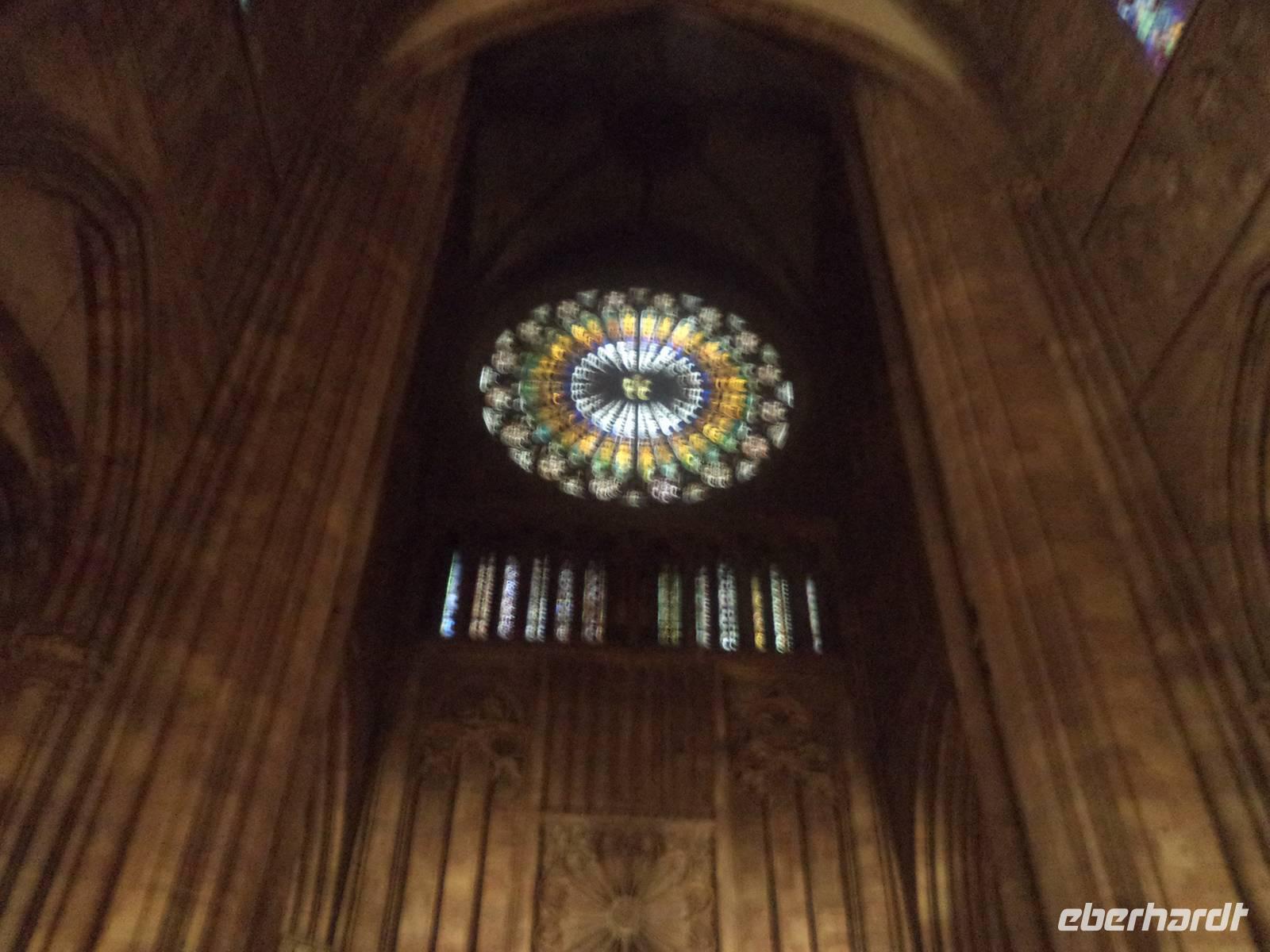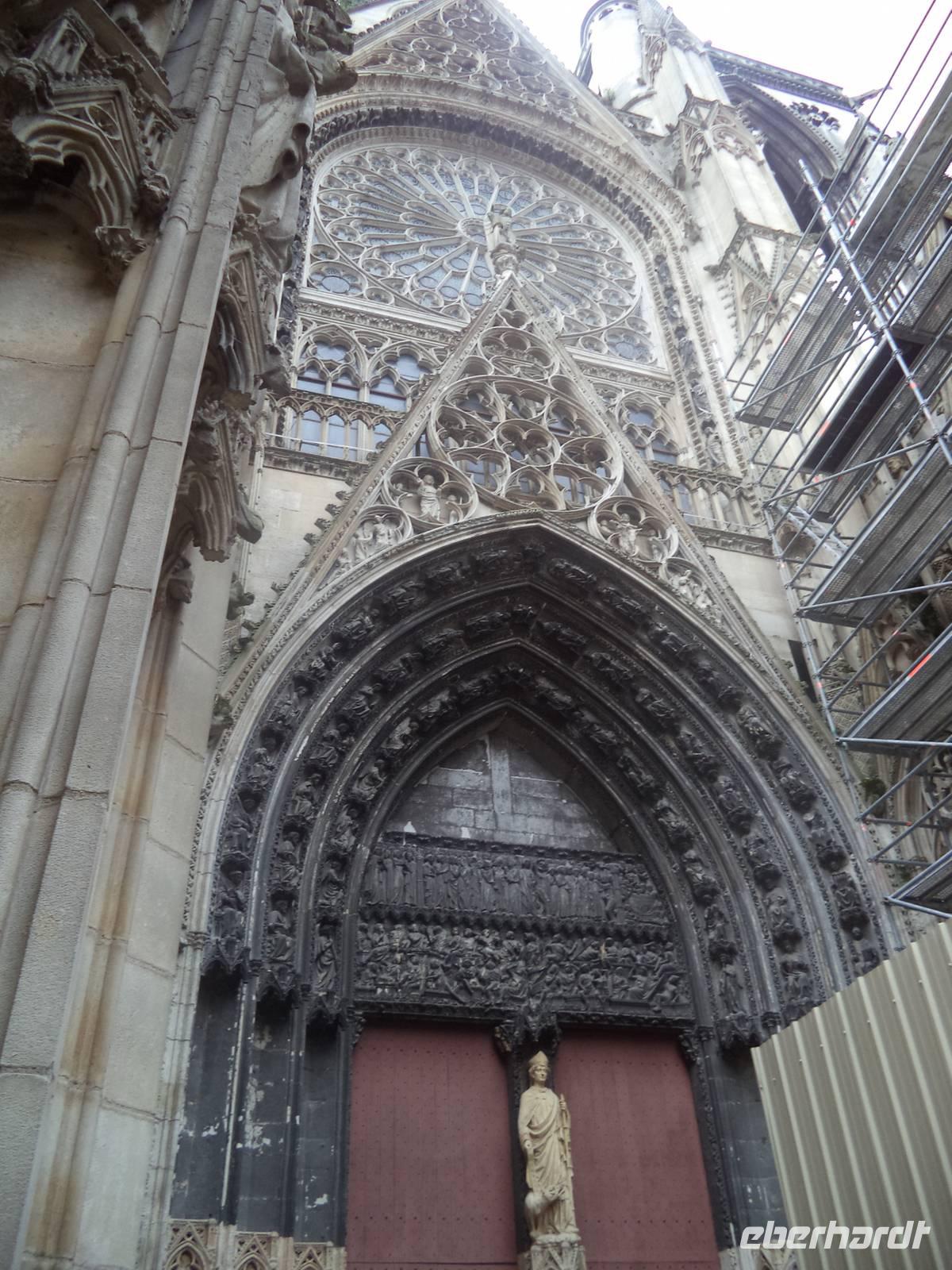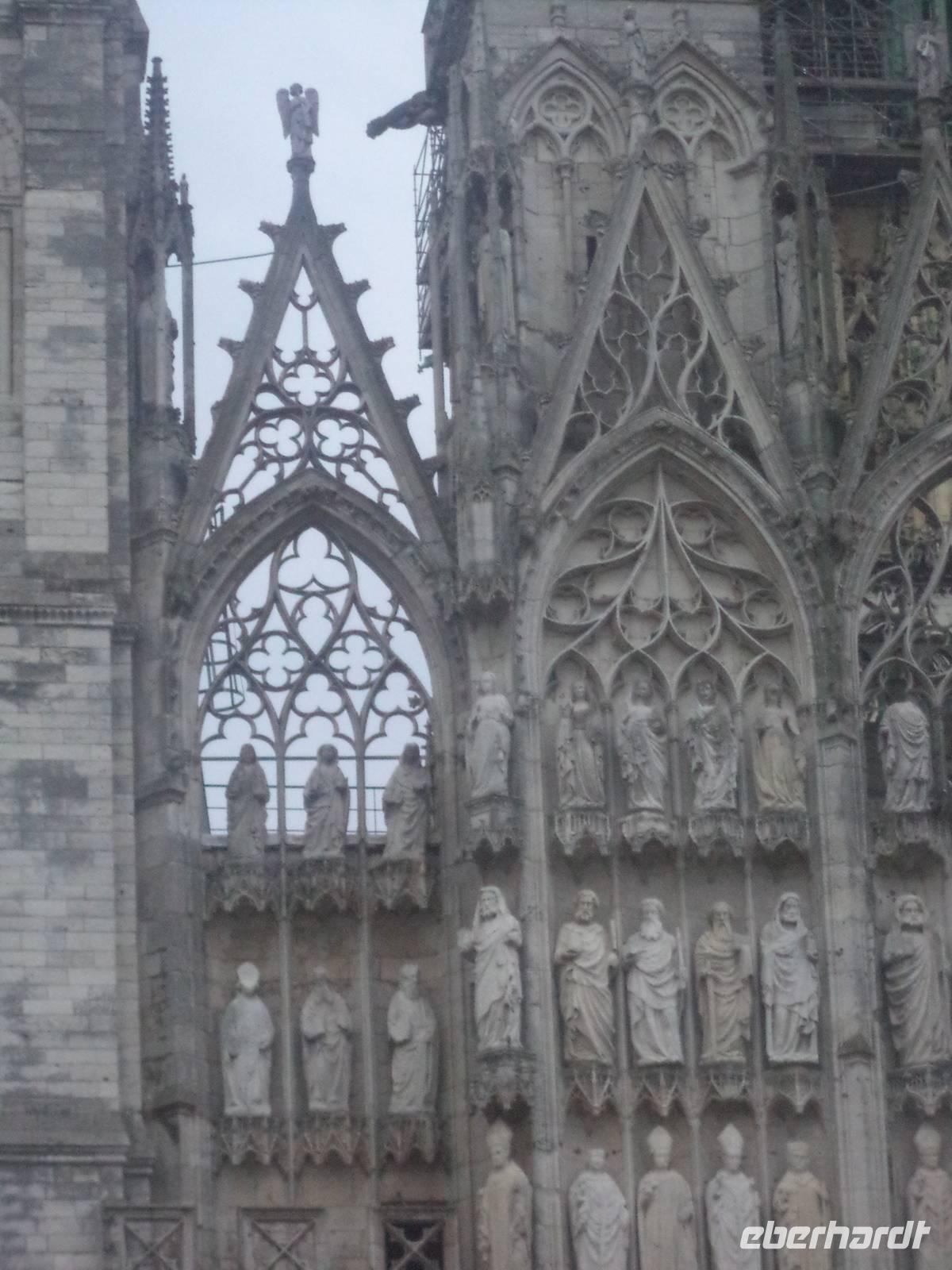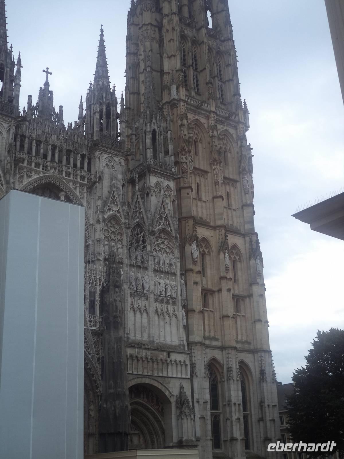 Nach nächtlichem Regen gab es einen schönen Vormittag. Ruhiges Dahingleiten, von aufregendem Schleusen zum Überwinden von Höhenunterschieden durchbrochen, gestaltete den Vormittag. Vorbei an landschaftlichen Höhepunkten brachte uns das Kreuzfahrtschiff MS „Renoir" bis zur Hauptstadt der Normandie. Habe ich erwähnt, dass die Spuren von Monsieur Renoir, einem der begnadetsten Maler Frankreichs, sich überall auf dem Schiff finden? Kopien seiner schönsten Werke hängen überall in den öffentlichen Bereichen aber auch in den Kabinen des Luxus-Schiffes. Bordreiseleiterin Bernadette brachte schon gleich nach dem Frühstück die Gäste mit zünftigem Frühsport auf Trab. Ansonsten wurde es - trotz partiellem Regen - ein wunderschöner Tag. Ein ausführlicher Stadtrundgang in der normannischen Hauptstadt Rouen war für den Nachmittag vorgesehen. Die herrliche Kathedrale, Paradebeispiel für die französische Gotik und eine der größten Frankreichs, zeigte zunächst einmal ihre imposante Westfassade. „In Stein gehauene Spitzenklöppelei" schätzte einst Victor Hugo das gotische filigrane Maßwerk der Kathedralenfassade ein. Von außen gab es bereits viel zu bestaunen: die Strebewerke und Verzierungen der Seitenaufbauten der Kirche, die ein reichverziertes Seitenportal im Querschiff aufweist, gehören ebenso zu den Besonderheiten wie der Figurenschmuck der westlichen Schaufassade zwischen den Türmen, von denen einer „Butterturm" genannt wird, da er mit Hilfe des „Butterpfennigs" - Sonderzahlungen reicher Rouener Bürger, die sich im Mittelalter auch während der Fastenzeit den Genuss von Butter gegen Bezahlung sichern wollten - errichtet wurde. Diese besondere „Genehmigungsabgabe" an die Kirche manifestiert sich nun in prächtigen Details an der Außenseite der Bischofskirche und hebt die Besonderheiten der Gotik hervor, die in ihrer Hochblüte immer verspielter werden und zu Verzierungen „zur höchsten Ehre Gottes" mutieren.