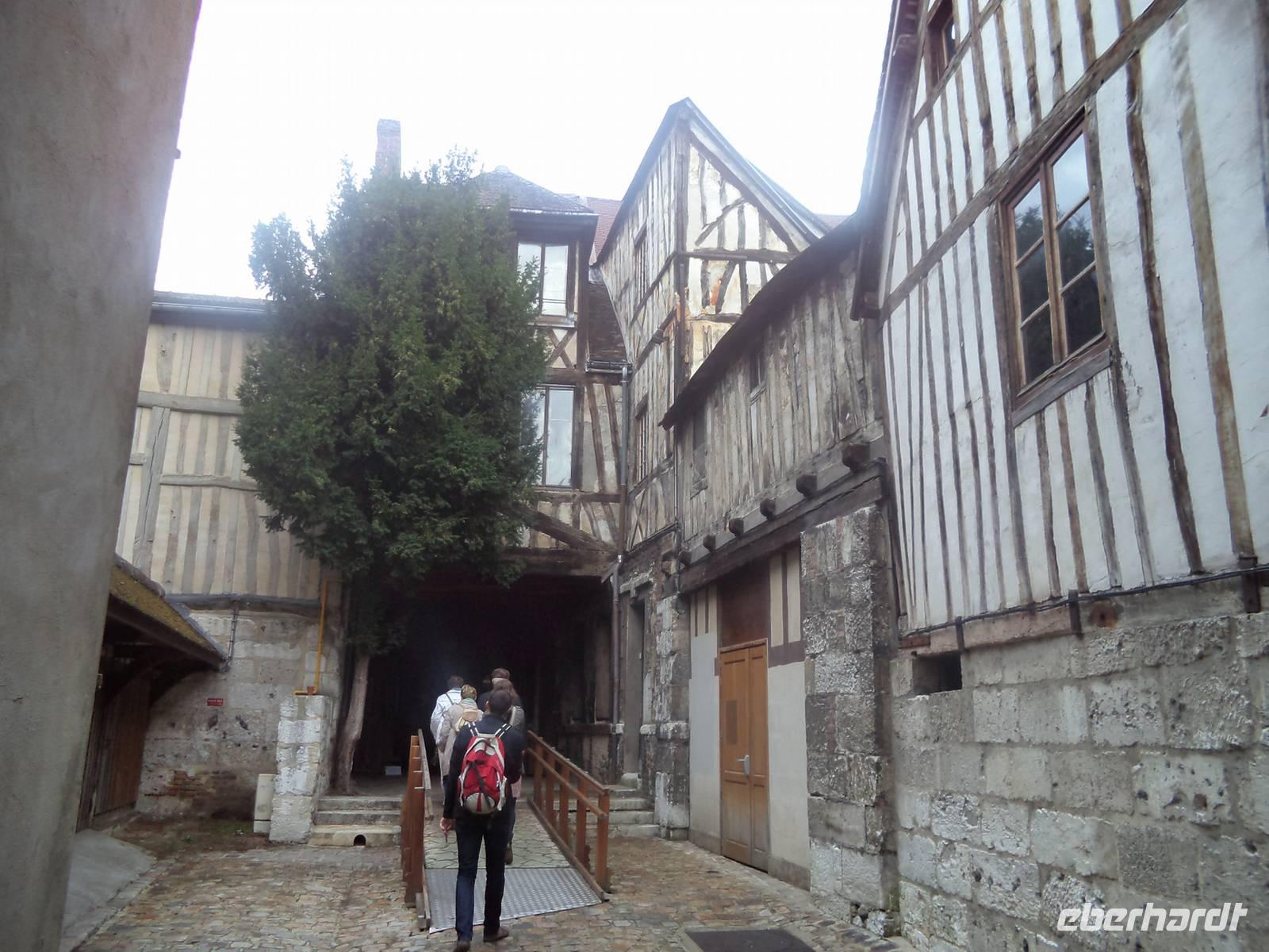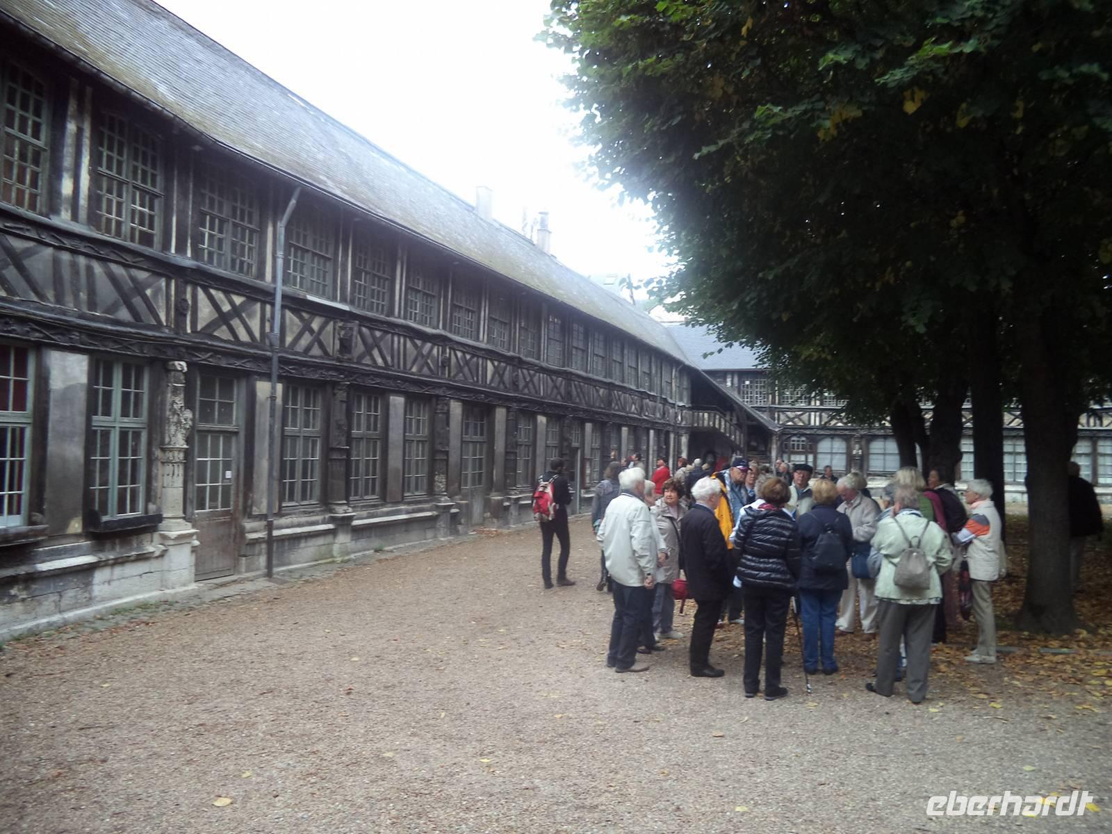 Unser Weg führte durch eine schmale Fachwerkstraße an pittoresken Häusern vorbei zur vielleicht merkwürdigsten Sehenswürdigkeit in der Hauptstadt der Normandie: das Aitre de Maclou ist ein viereckiger Hof, von allen Seiten durch zweistöckige, hübsche Fachwerkgebäude umschlossen, die bei näherem Hinsehen makaber wirken. Ihre uralten Verzierungen sind Schnitzereien, die Totenköpfe, Gebeine und Beerdigungswerkzeuge darstellen: dieses Bauwerk - nebenbei bemerkt eines der ältesten Fachwerkensembles in Europa - ist ein alter Pestfriedhof, der heute eine Kunstschule beherbergt. Er gehört mit Sicherheit zu den bemerkenswertesten Gebäuden der Normandie.