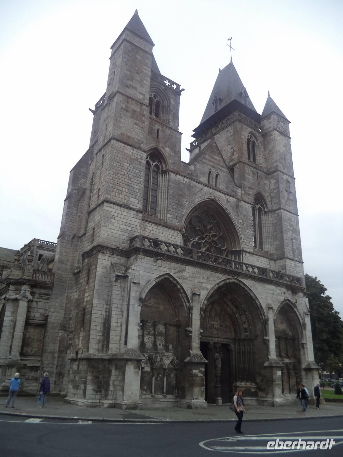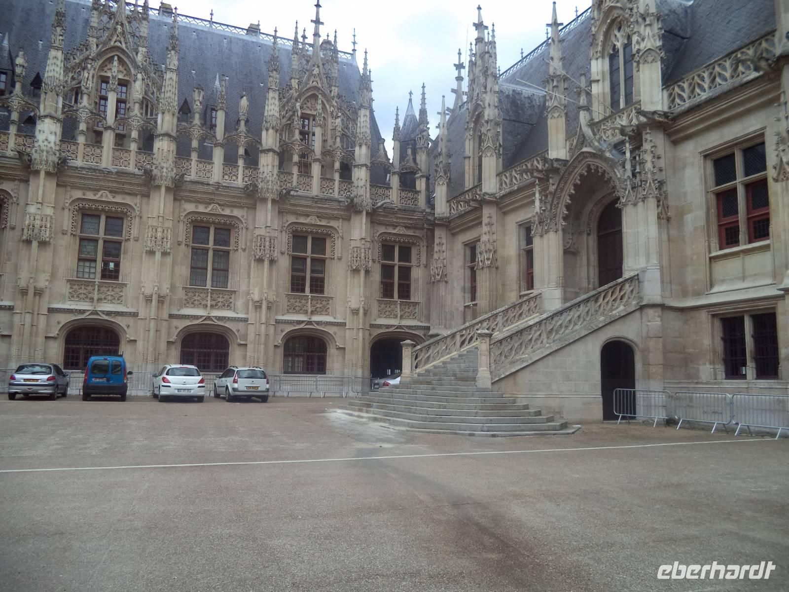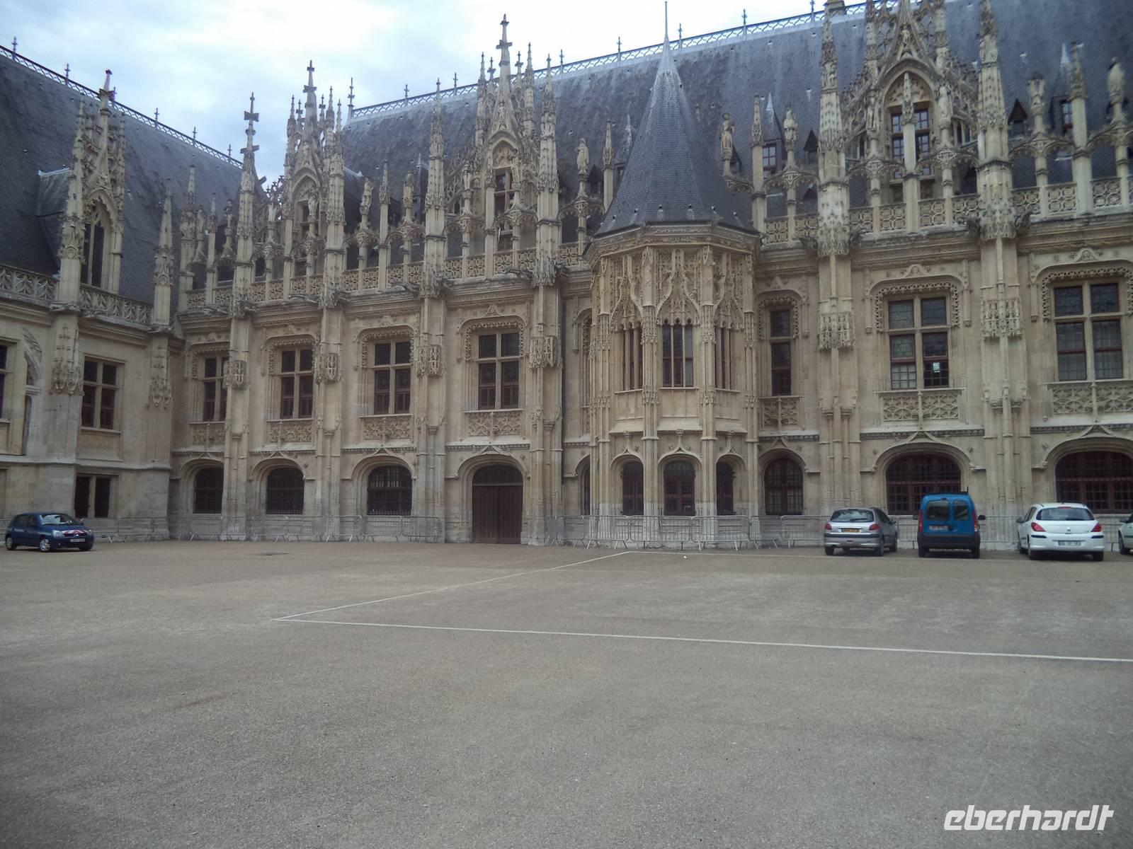 Nach der gotischen Kathedrale mit ihrer tollen Raumwirkung besahen wir die uralten malerischen Fachwerkhäuser in der mit Fachwerkvierteln reich gesegneten Stadt. Nahe der Kathedrale finden sich die Ruinen des alten Bischofspalastes - wo der Prozess gegen die Nationalheilige Jeanne d'Arc stattfand. Diese, genannt die „Jungfrau von Orleans", hatte im 15. Jahrhundert während des hundertjährigen Krieges zwischen England und Frankreich für die Franzosen Partei ergriffen und eine Wende im Krieg herbeigeführt. Als in Rüstung reitende Anführerin konnte sie den Auftakt für den Sieg Frankreichs herbeiführen. Die Engländer nahmen sie 1430 gefangen und verurteilten sie 1431 in dem Gerichtssaal an der Nordwand der Kathedrale von Rouen zum Tode auf dem Scheiterhaufen. Man verbrannte die spätere französische Nationalheldin auf dem alten Markt zu Rouen, wo sich an ihrer Hinrichtungs-Stelle heute ein gewaltiges Gedenk-Kreuz erhebt. 1456 rehabilitiert. Wurde sie von der katholischen Kirche erst unschuldig, dann selig und 1920 schließlich heiliggesprochen.
