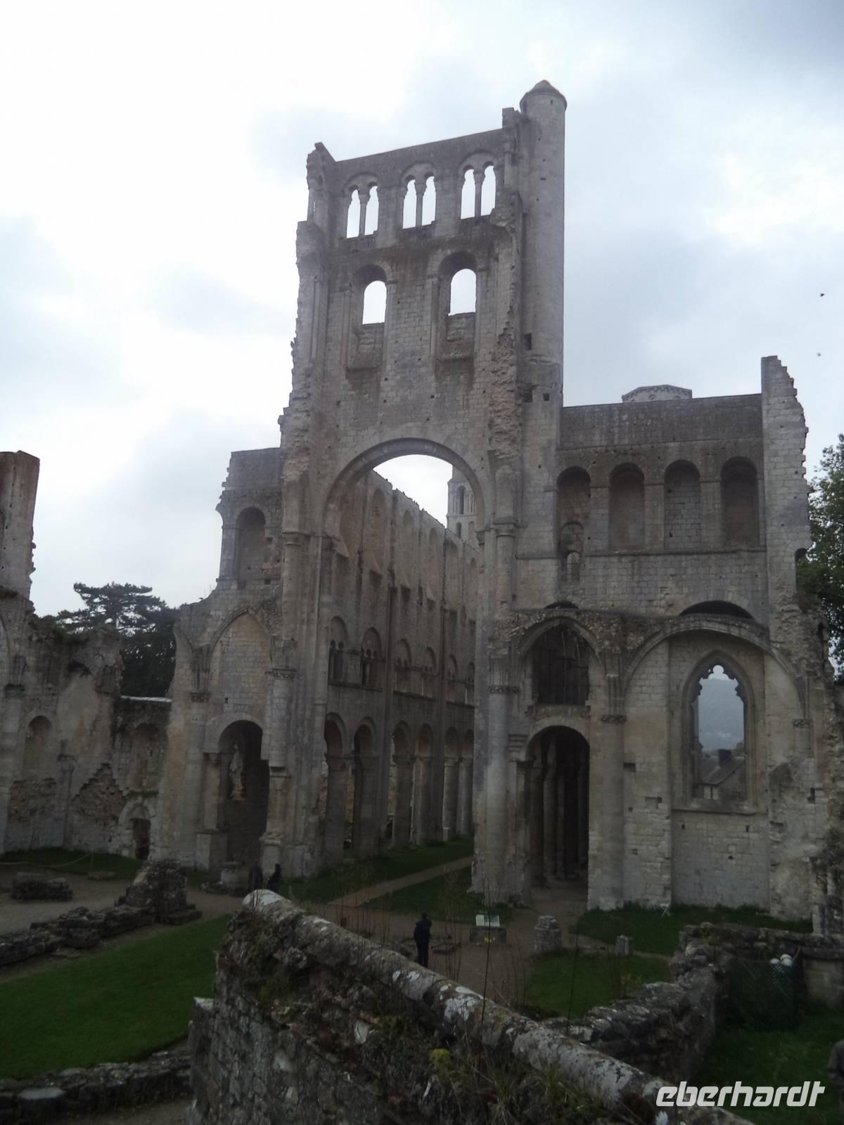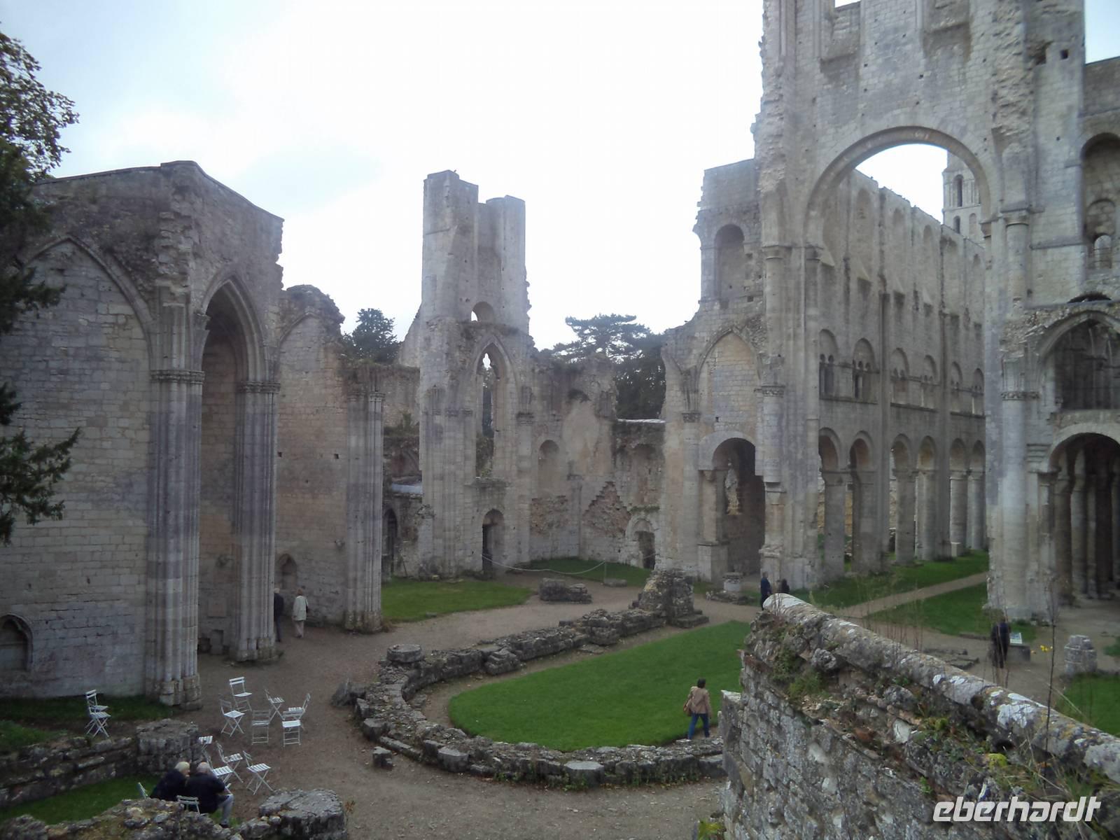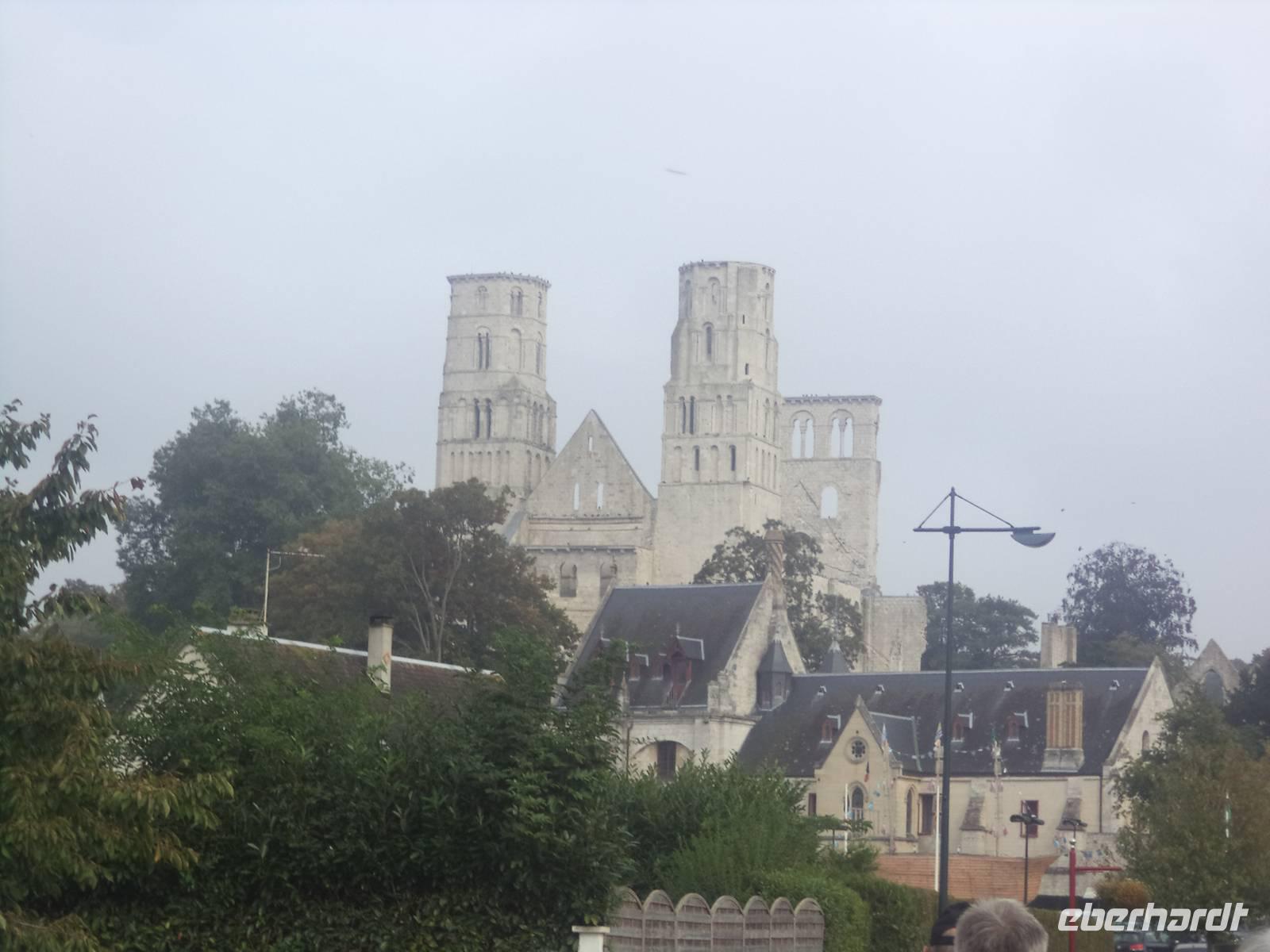 Dann aber erreichten wir die Abtei Jumieges. Der berühmte französische Schriftsteller Victor Hugo - aus dessen Feder die Geschichte des Glöckners von Notre Dame stammt! - hat Jumieges als die „schönste französische Ruine" bezeichnet. Tatsächlich ist der Überrest des alten Klosters - das immerhin bereits im 7. Jahrhundert gegründet wurde - sehr imposant. Noch im 11. Jahrhundert im damals gerade beginnenden „normannischen" Baustil der Spätromanik neu erbaut, war der sicherlich berühmteste Herzog der Normandie - Wilhelm der Eroberer, der 1066 die Schlacht bei Hastings gewann und sich damit die Herrschaft über England sicherte - im Jahre 1067 selbst bei der Weihe der Abteikirche von Jumieges zugegen, was die Bedeutung des Klosters hervorhebt. Obwohl später die Wirren der französischen Revolution Ende des 18. Jahrhunderts und die nachfolgende Freigabe des alten Klosters als Steinbruch zur Baumaterial-Gewinnung die alte Abtei schwer schädigten, konnten doch spätere Rettungsversuche eindrucksvolle Ruinen der einst bedeutenden Anlage bewahren. Sowohl die Kreuzform der einstigen Hauptkirche als auch die vollendet normannisch-romanischen Details und das Nebeneinander von zwei Kirchen - Notre Dame und St. Pierre - sind eindrucksvoll zu sehen. Wir konnten genügend Zeit in der alten Abtei verbringen, bevor die Busse uns wieder nach Caudebec - des Festes wegen unter Polizeischutz - zurückbeförderten. Hier konnten wir uns noch unter die Festival-Teilnehmer mischen und etwas „normannisches Flair" tanken, bevor wir zum Abendessen auf unser Schiff mussten. Das Abendessen - typisch normannisch mit lecker geschmortem Kalbfleisch - war wieder hervorragend, allerdings kam auch der anschließend nach dem Abendessen von der Reederei und der Schiffsbesatzung organisierte „Normannische Abend" ganz hervorragend an.
