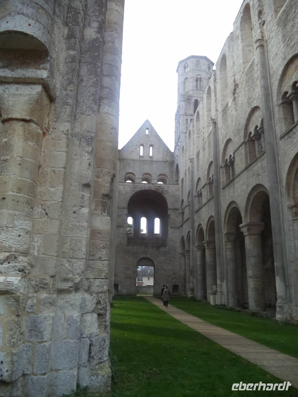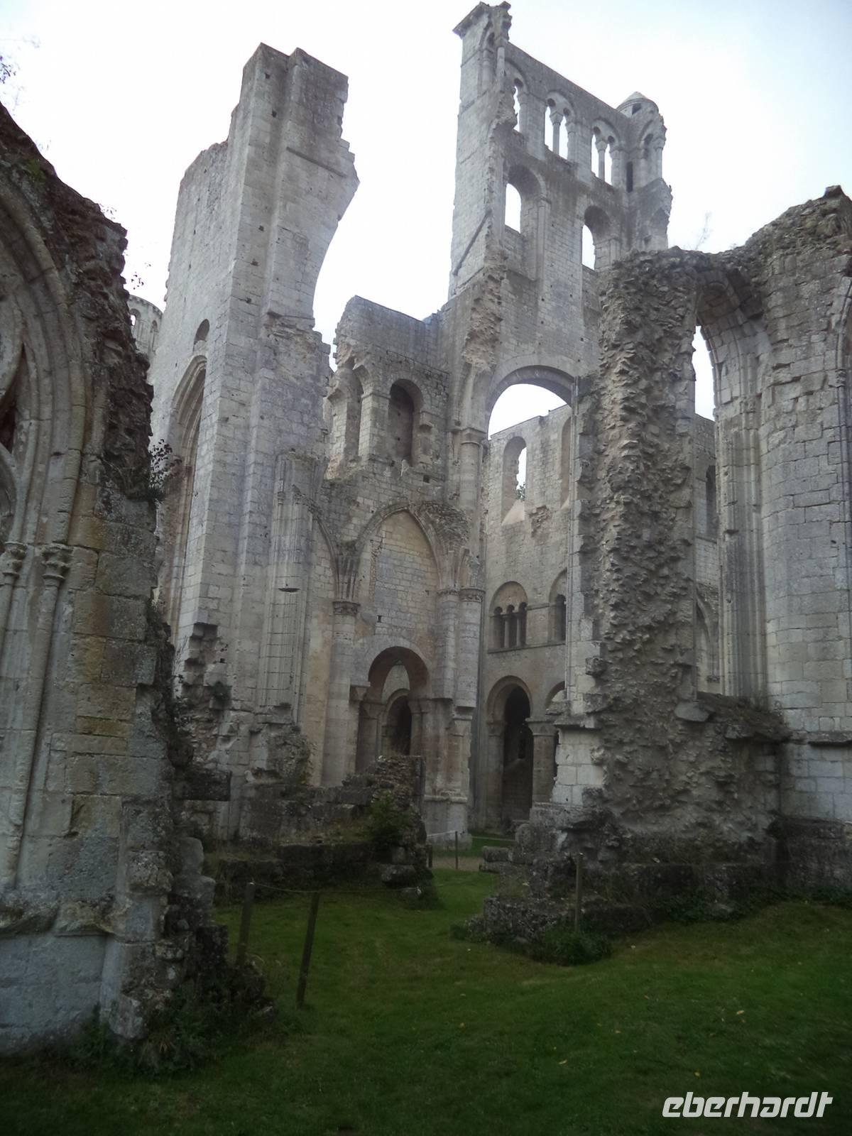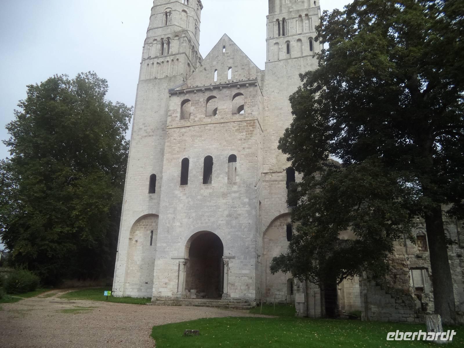 Dann aber erreichten wir die Abtei Jumieges. Der berühmte französische Schriftsteller Victor Hugo - aus dessen Feder die Geschichte des Glöckners von Notre Dame stammt! - hat Jumieges als die „schönste französische Ruine" bezeichnet. Tatsächlich ist der Überrest des alten Klosters - das immerhin bereits im 7. Jahrhundert gegründet wurde - sehr imposant. Noch im 11. Jahrhundert im damals gerade beginnenden „normannischen" Baustil der Spätromanik neu erbaut, war der sicherlich berühmteste Herzog der Normandie - Wilhelm der Eroberer, der 1066 die Schlacht bei Hastings gewann und sich damit die Herrschaft über England sicherte - im Jahre 1067 selbst bei der Weihe der Abteikirche von Jumieges zugegen, was die Bedeutung des Klosters hervorhebt. Obwohl später die Wirren der französischen Revolution Ende des 18. Jahrhunderts und die nachfolgende Freigabe des alten Klosters als Steinbruch zur Baumaterial-Gewinnung die alte Abtei schwer schädigten, konnten doch spätere Rettungsversuche eindrucksvolle Ruinen der einst bedeutenden Anlage bewahren. Sowohl die Kreuzform der einstigen Hauptkirche als auch die vollendet normannisch-romanischen Details und das Nebeneinander von zwei Kirchen - Notre Dame und St. Pierre - sind eindrucksvoll zu sehen. Wir konnten genügend Zeit in der alten Abtei verbringen, bevor die Busse uns wieder nach Caudebec - des Festes wegen unter Polizeischutz - zurückbeförderten. Hier konnten wir uns noch unter die Festival-Teilnehmer mischen und etwas „normannisches Flair" tanken, bevor wir zum Abendessen auf unser Schiff mussten. Das Abendessen - typisch normannisch mit lecker geschmortem Kalbfleisch - war wieder hervorragend, allerdings kam auch der anschließend nach dem Abendessen von der Reederei und der Schiffsbesatzung organisierte „Normannische Abend" ganz hervorragend an.