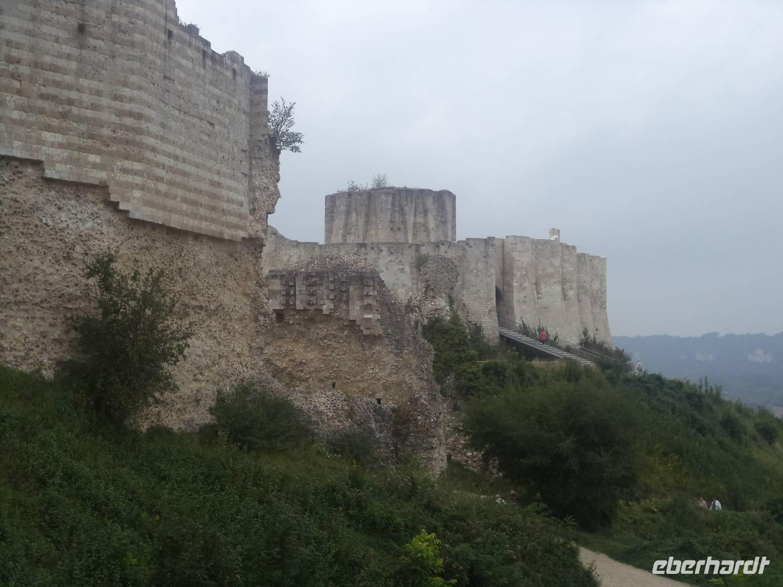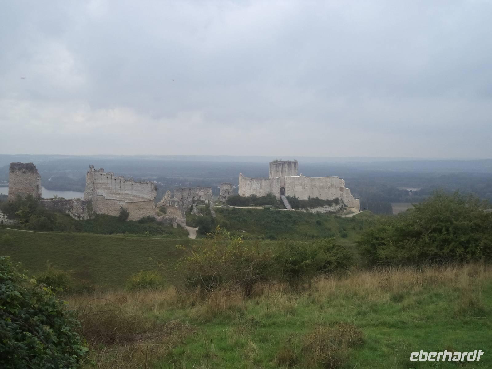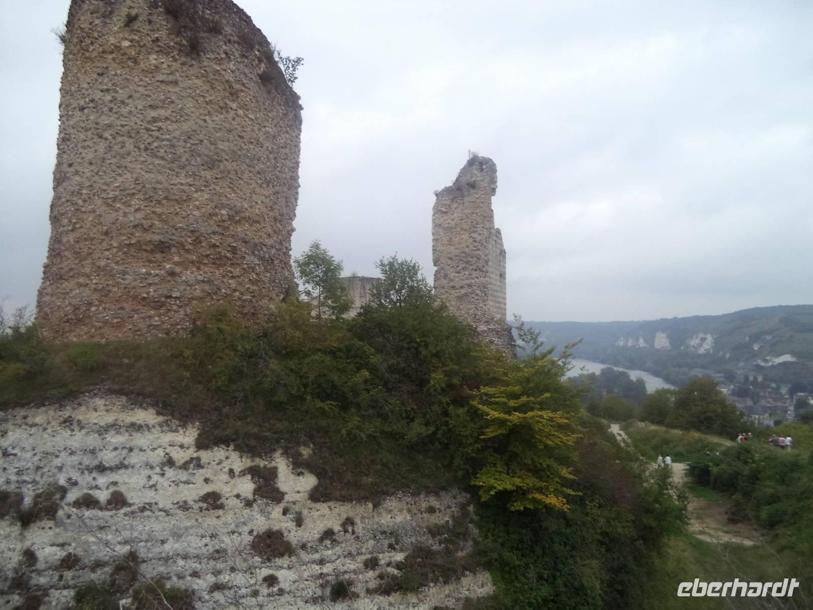 Der Vormittag wurde heute an Bord verbracht, denn MS „Renoir hatte eine recht gewaltige Strecke stromaufwärts der Seine zurückzulegen. Mehrere Schleusen - der gesamte Höhenunterschied von Paris bis zur Flussmündung beträgt übrigens 26 m - ermöglichen es Schiffen, den Fluss trotz des Gefälles zu passieren. Vom vergangenen Abend an unterwegs, erreichten wir gegen Mittag Les Andelys. Der Name zeigt ein Mehrzahlwort und tatsächlich gibt es zwei Orte dieses Namens: Groß- und Klein Andelys. Der Platz nahe unserem Anleger nahe der Kirche von Klein Andelys ermöglichte das Halten der Busse und dann konnten wir mit deren Hilfe Auffahren zur malerisch das Seine-Tal beherrschenden Festung Chateau Gaillard. Nach nur einem Jahr Bauzeit beherrschte von hier der englische König Richard Löwenherz - nominell auch Herzog der Normandie - das Seinetal und legte gleichzeitig eine Sperrfestung gegen das Vordringen seines Rivalen, des Königs von Frankreich an. Schön war die Anlage der Festung, die Löwenherz einmal stolz „seine Tochter" genannt haben soll und spektakulär war die strategische Lage der Burg, die dadurch auch Geschichte schrieb, denn nach dem Tod seines Bruders Richard verlor der nachfolgende englische König - deshalb auch „Johann ohne Land „ genannt - die Besitzungen an den angreifenden französischen König Philipp Auguste - schon 1204. In einer vielbeschriebenen Belagerung brachen die Franzosen die englische Burg und sorgten damit für einen der vielen Auslöser für den 133 Jahre später beginnenden gewaltigen „hundertjährigen Krieg" zwischen England und Frankreich. Noch zweimal machte die Burg, nunmehr französisch - in der Geschichte von sich reden: in ihrem Kerker starb 1315 die wegen Ehebruch angeklagte Königin und Gattin Ludwigs X. unter myteriösen Umstanden, angeblich mit ihren eigenen Haaren erdrosselt - während ihr Gatte bereits vier Tage später eine ungarische Prinzessin heiratete. Und während des hundertjährigen Krieges zwischen Frankreich und England war hier für einige Zeit der König Karl II. von Navarra der prominenteste Gefangene.