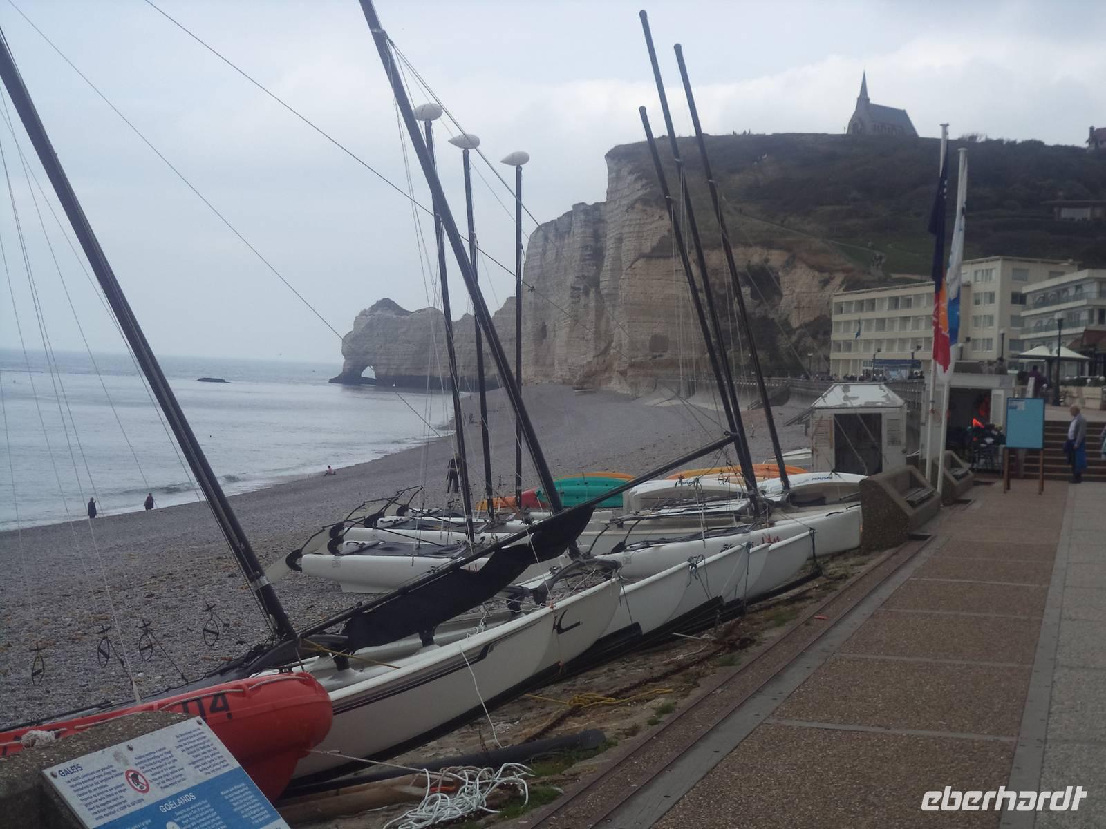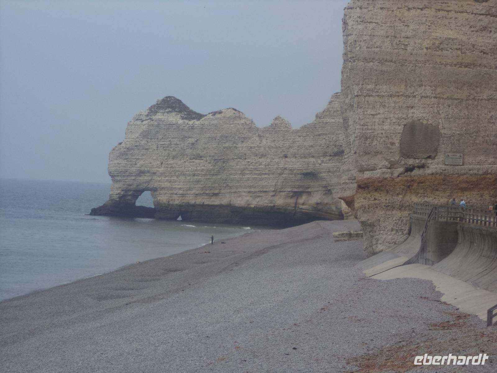 Wir erreichten am Nachmittag Ètretat, das für seine Felsformationen berühmte normannische Seebad. Nur kurz ist der Spaziergang vom Busparkplatz durch das malerische Städtchen. Vorbei am „Clos de Arsène Lupin" - einem Literaturmuseum dass der unsterblichen Figur des von Maurice Leblanc geschaffenen „Gentleman-Diebes" gewidmet ist - und am Nachbau der alten Fisch-Markthallen erreichten wir die Schotterküste. Hier wurde der Blick frei auf die wundersamen, von der Natur geschaffenen Formen der Kreidefelsen. „Elefantenfelsen" sagen manche dazu - „Falaise d'Aval" liegt links und „Falaise d'Amont" rechts - wegen der Form dieser durchbrochenen Steilküstenabschnitte, die von fern an im Wasser stehende Elefanten erinnern.