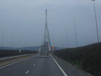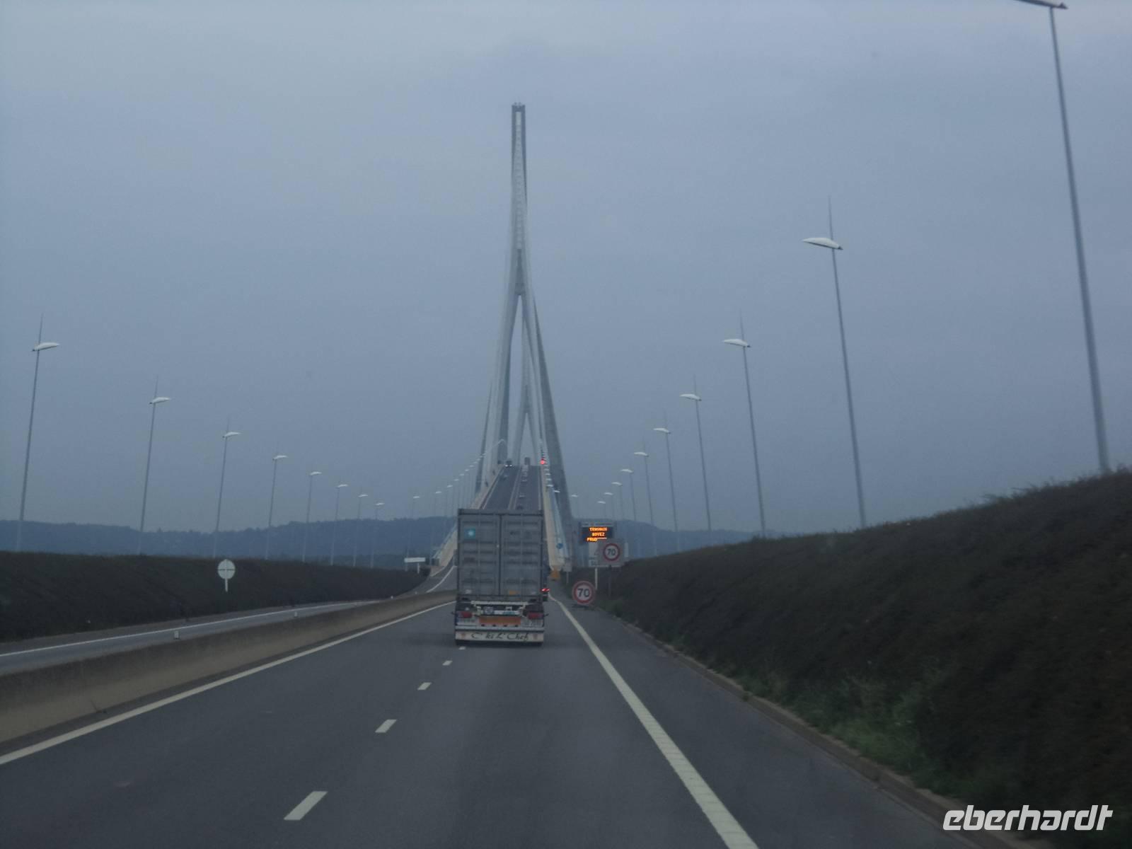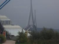 Abends fuhren wir nicht allzuweit. Unser Schiff lag immer noch im alten Hafenbecken von Honfleur und auf dem Weg dorthin fuhren wir entlang der Kanäle und Bauten der Vororte von Le Havre zur größten französischen Brücke. Mit fast 2415 m etwa so lang wie die Pariser Champs-Elysées ist die Pont de Normandie eine der größten Schrägseilbrücken der Welt. Ihre Fahrbahn liegt knapp 60 m über dem Höchstwasserspiegel der Seinemündung und gestaltet den gewaltigen Bogen der über die hier sehr breite Seine mit mehreren Straßenspuren führt. Die 1995 eröffnete Brücke soll auch schwersten Stürmen oder dem versehentlichen Anprall unter ihr hindurchfahrender Ozeanriesen trotzen - sie ist komplett „auf Sicherheit" gebaut und hält Sturm- und Schiffsattacken stand. Wir stoppten am Parkplatz, wo man nach wenigen Laufminuten von einem Podest die Möglichkeit hat, dieses technische Brücken-Wunder zu betrachten und natürlich auch zu fotografieren. Pünktlich vor dem Abendessen und der zu dieser Zeit anberaumten Abfahrt des Schiffes erreichten wir den Anleger in Honfleur mit der MS „Renoir".