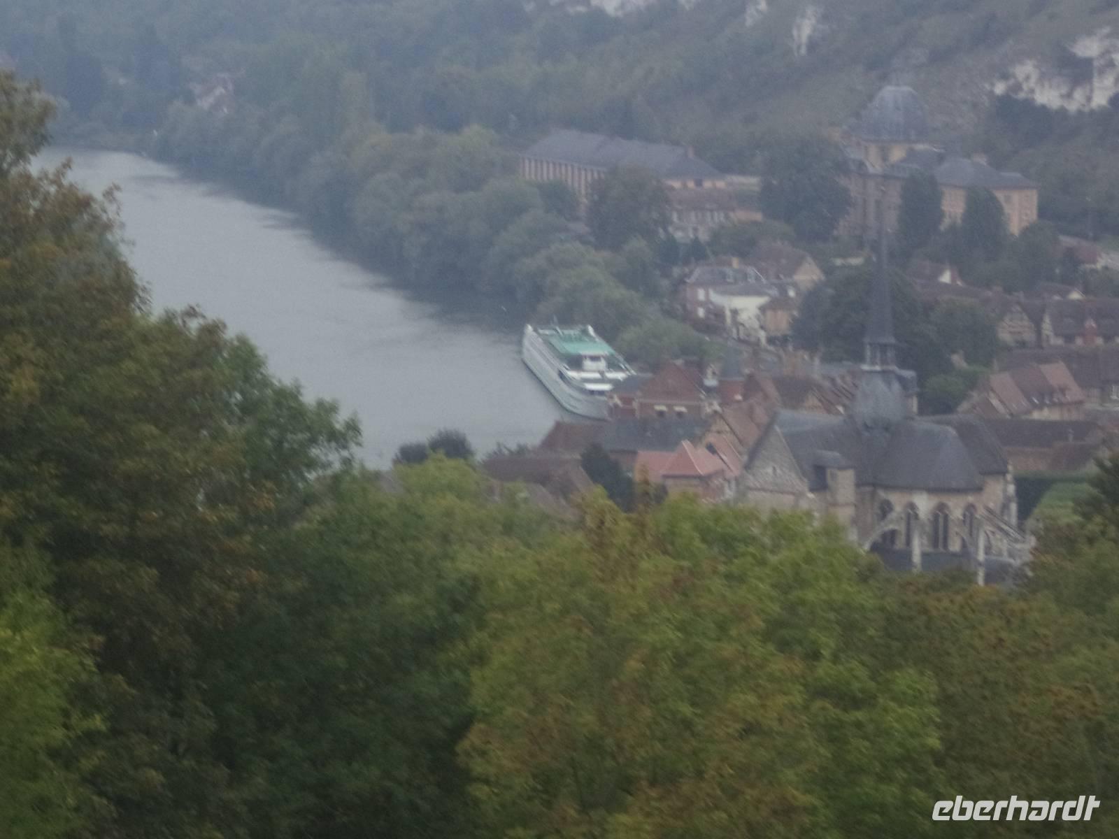 Auf dem Parkplatz mit herrlicher Aussicht über Burg und Seinetal verkosteten wir vor der Rückfahrt noch eine normannische Spezialität: Pommeau. Viel weniger bekannt als die Apfel-Produkte Cidre oder Calvados ist es weder ein Wein wie der erstere noch ein Obstbrand wie letzterer - sondern ein Aperitiv, hergestellt aus frisch gepresstem Apfelsaft, gemischt mit gereiften Calvados bis zu einem likörartigen Alkoholgehalt. Unseren Gästen hat es geschmeckt, bevor es zurückging nach Les Andelys, wo noch Zeit für einen Bummel zum Schiff blieb und man unterwegs die beiden hübschen Kirchen bewundern konnte. Auf dem Schiff wurden wir wieder mit einem leckeren Abendessen verwöhnt.