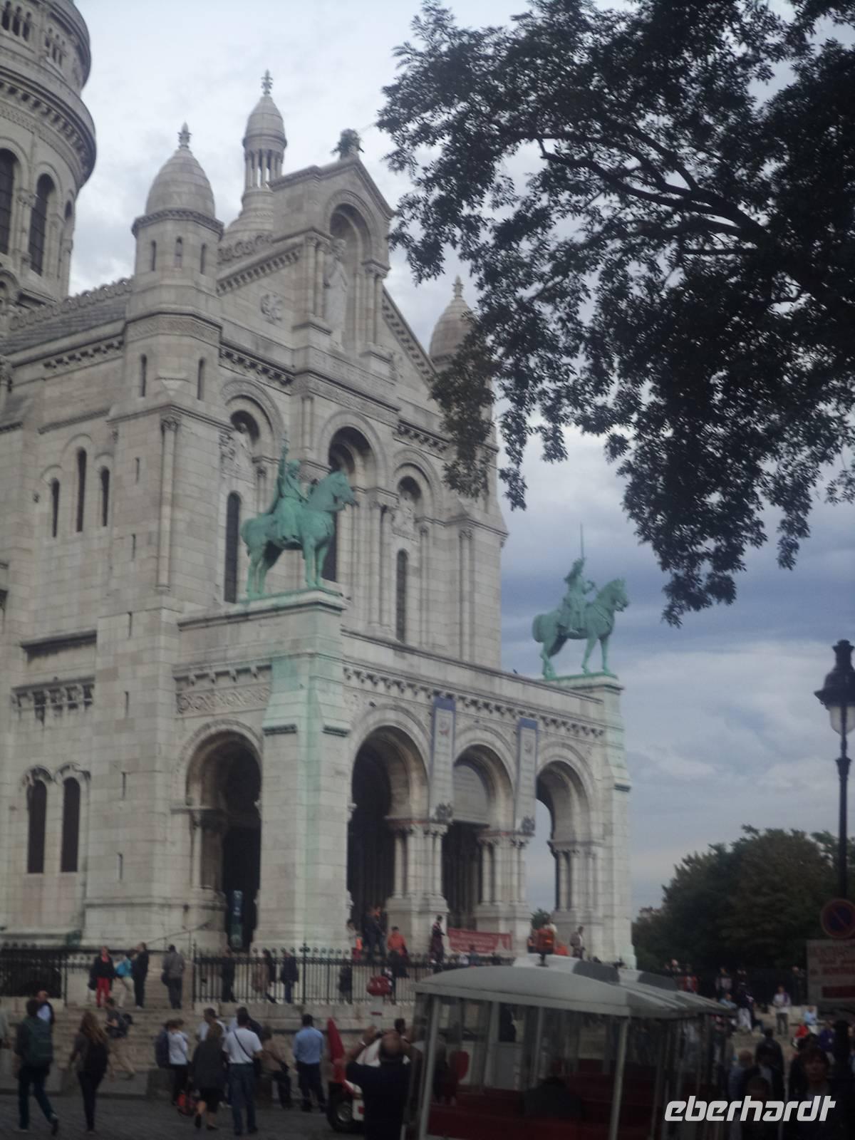 Nach dem Mittagessen ging es allerdings nochmals hinaus, denn der Nachmittag war dem Montmartre vorbehalten. Der oft als Künstlervierte apostrophierte Hügel ist mit 130 m Höhe die höchste natürliche Erhebung von Paris und von einer prachtvollen Kirche gekrönt. Um das Erklimmen zu erleichtern, gibt es hier schon sehr lange eine Seilbahn, die 1991 einem elektrischen Schrägaufzug wich, der in zwei Kabinen die Passagiere im anderthalb-Minuten-Takt den Hügel hinauf und hinunter befördert. Auch wir nutzten dieses Hilfsmittel und gelangten so, nach Ausstieg aus dem, Bus und kurzem Fußmarsch recht bequem zur Kirche Sacre Coeur und zum Place du Tertre hinauf. Mon Dieu, was herrschte hier für ein Trubel. Nicht nur die von 1876 bis 1919 erbaute Kirche, in der seither ununterbrochen der Leib Christi angebetet wird, ist hier eine Attraktion, auch die zahllosen Bars und Cafes sind es, in denen leibhaftige Künstler verkehren und vor denen auf dem Place du Tertre Musiker und Leierkastenleute ein unvergleichliches Flair verbreiten. Wir hatten Zeit, uns hier umzusehen und trafen uns später am Bus, um noch ein kleines Richtig-Reisen-Extra zu genießen, einen kleinen Umweg, an dessen Ende wir den „Tour Montparnasse" erreichten, das mit 210 m nach dem Eiffelturm höchste Gebäude von Paris. Ein Aufzug, der zu den schnellsten in Europa gehört, brachte uns in nur 38 Sekunden in die 56. Etage zu einem grandiosen Blick über Paris. Hier schien sogar der Eiffelturm klein zu sein!