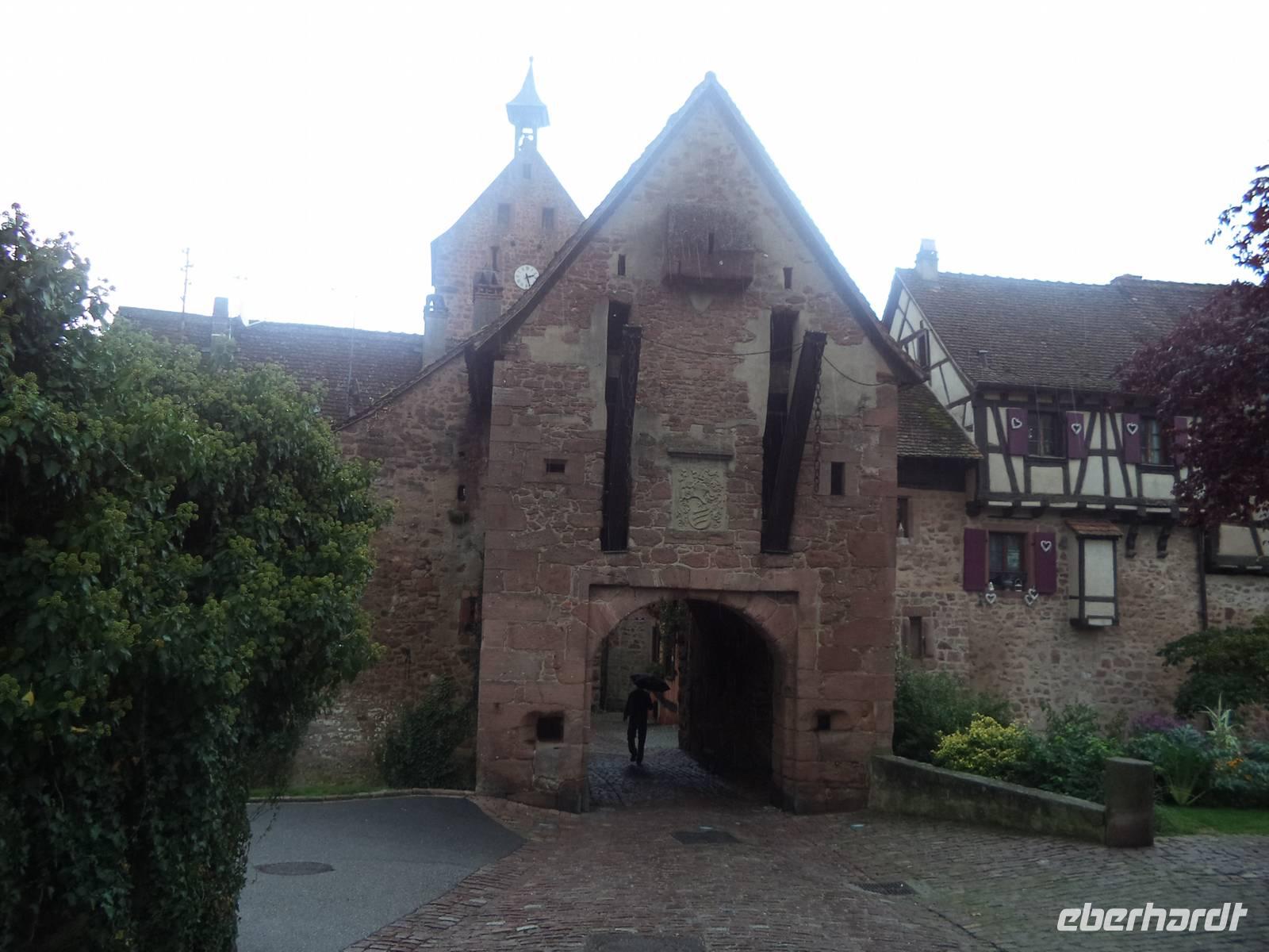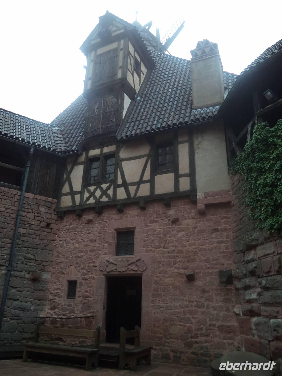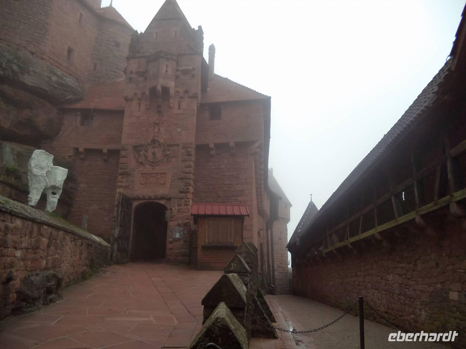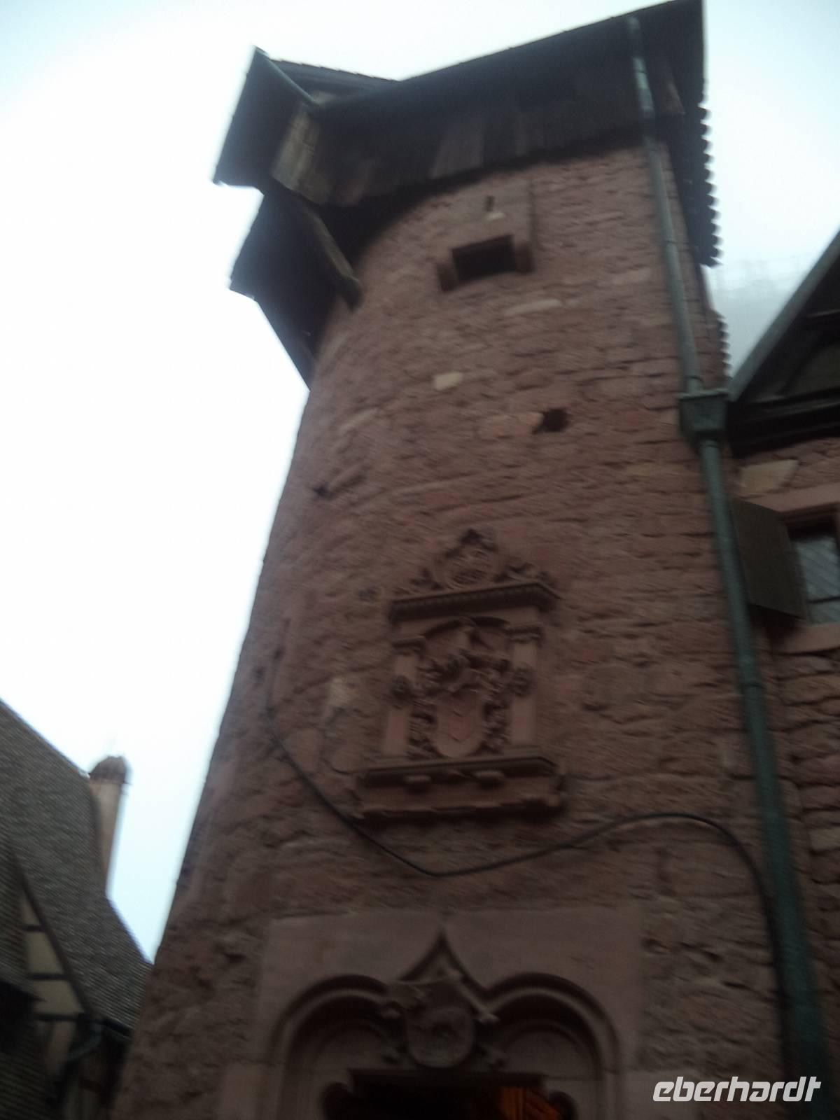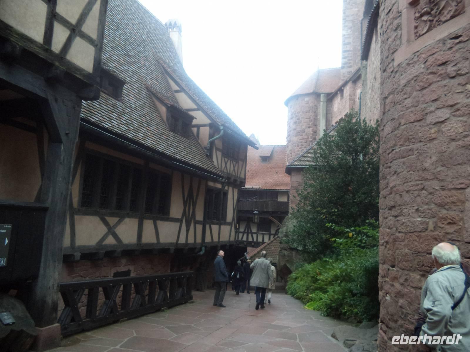 Nicht allzu weit war der Weg nachmittags nach Riquewihr. Das winzige Städtchen mit komplett erhaltener Fachwerkaltstadt und ehemaligen Befestigungsanlagen, von denen der obere Torturm „Dolder" das Wahrzeichen der Stadt ist, liegt mitten in der Elsässer Weinstraße. Natürlich gab es deswegen hier eine Verkostung: erst besuchten wir den historischen Weinkeller mit Fasslager des Weingutes Zimmer, dann durften wir drei typische Elsässer Weine verkosten - Riesling, Pinot gris und Gewürztraminer. Für den weiteren Nachmittag war eigentlich eine Fahrt durch die Weinberge mit dem „Petit Train", einem kleinen Touristenzug geplant. Aber hier schlug diesmal „höhere Gewalt" zu - er hatte ausgerechnet an diesem Tag, an dem es noch dazu regnete, eine Panne und wir konnten ihn nicht nutzen. Also fuhren wir nicht im „Zug" sondern weiter mit unserem Bus und begaben uns zur letzten geplanten Besichtigung auf die „Haut Koenigsbourg". Diese große Burganlage war zuerst im Besitz der Staufer, später der Habsburger und wurde in der Zeit, in der das Elsass zwischen Deutsch-französischem Krieg 1871 und erstem Weltkrieg (bis 1918) zu Deutschland gehörte, dem deutschen Kaiser geschenkt. Der ließ die imposante Ruine in historisierenden Formen wieder aufbauen und heute steht sie - nicht mehr ganz originalgetreu, dafür den Vorstellungen des letzten Bauherren entsprechend, auf einer Anhöhe der Vogesen. Bei einer interessanten Führung lernten wir diese schöne Burg kennen.