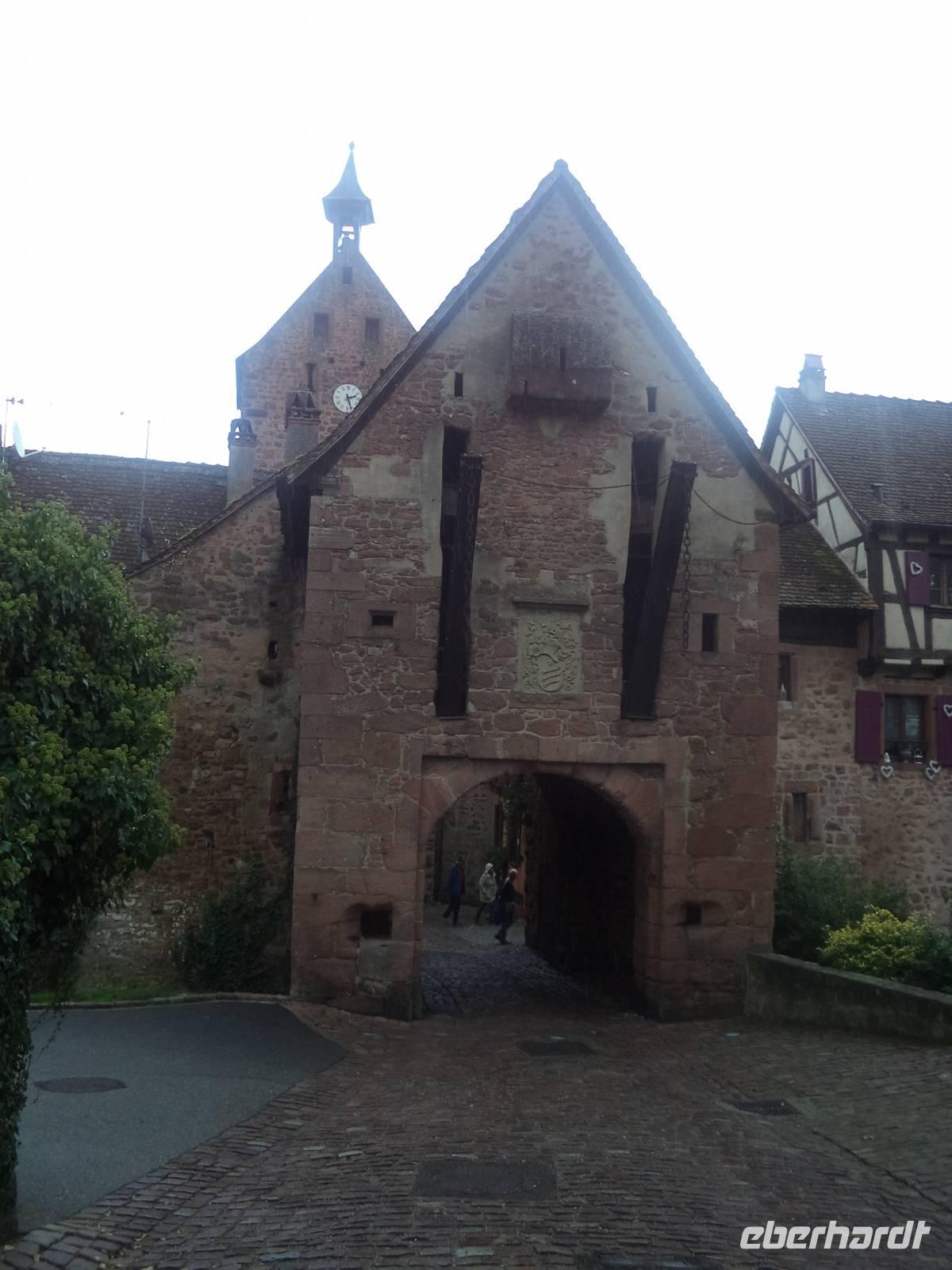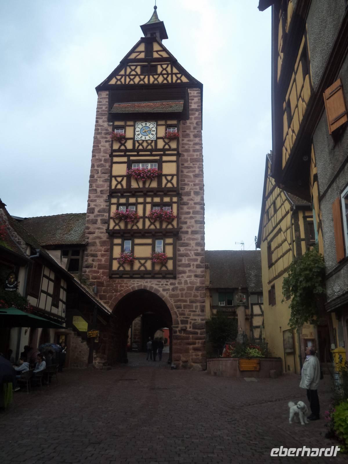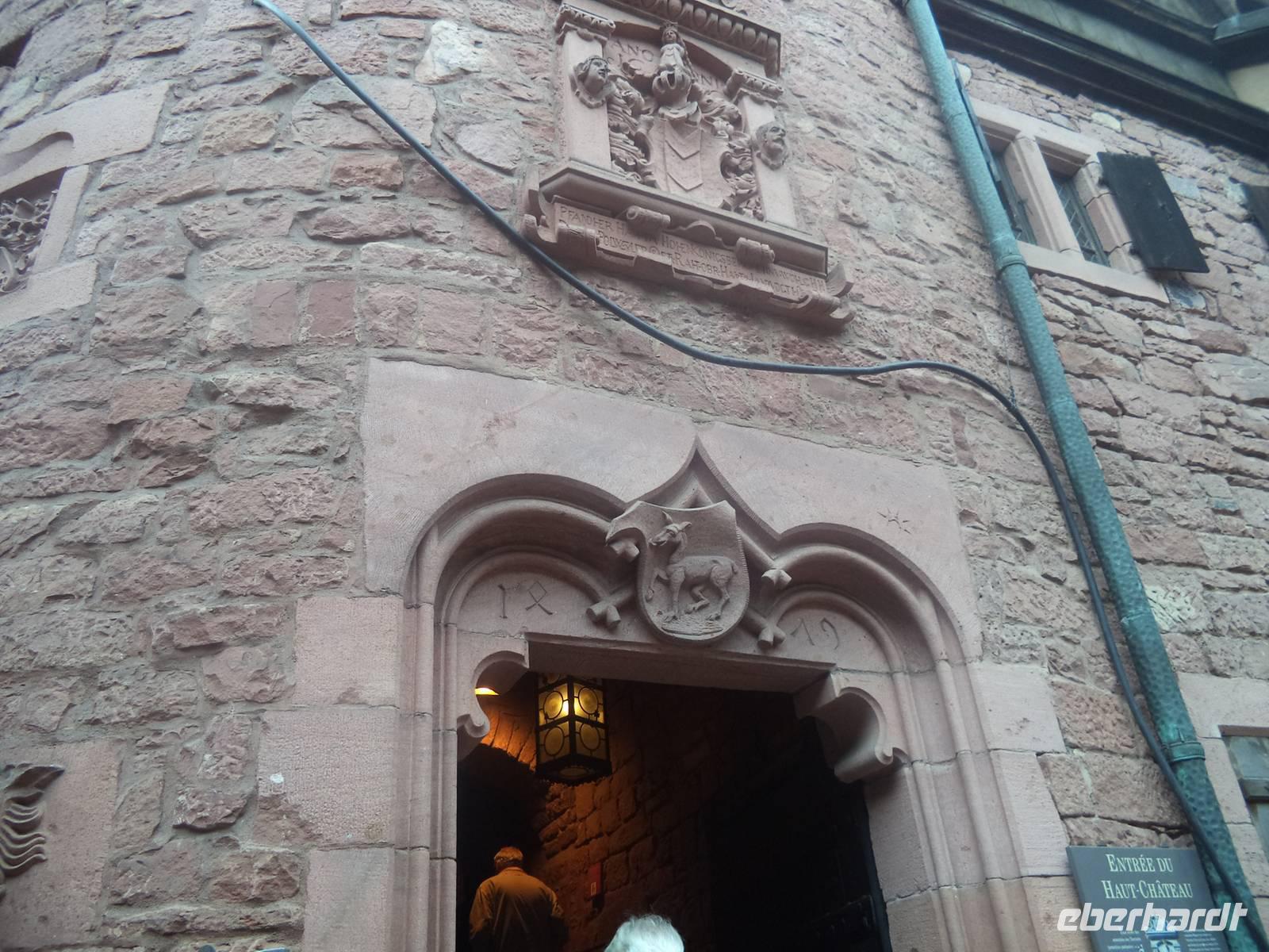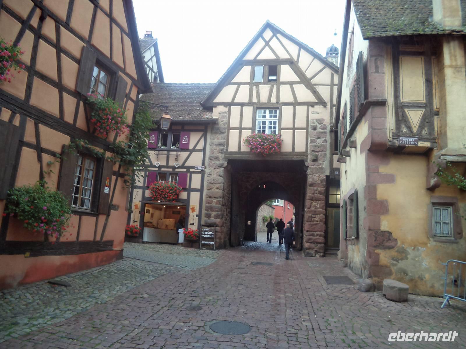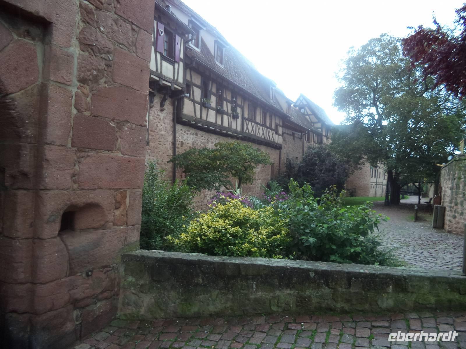 Nicht allzu weit war der Weg nachmittags nach Riquewihr. Das winzige Städtchen mit komplett erhaltener Fachwerkaltstadt und ehemaligen Befestigungsanlagen, von denen der obere Torturm „Dolder" das Wahrzeichen der Stadt ist, liegt mitten in der Elsässer Weinstraße. Natürlich gab es deswegen hier eine Verkostung: erst besuchten wir den historischen Weinkeller mit Fasslager des Weingutes Zimmer, dann durften wir drei typische Elsässer Weine verkosten - Riesling, Pinot gris und Gewürztraminer. Für den weiteren Nachmittag war eigentlich eine Fahrt durch die Weinberge mit dem „Petit Train", einem kleinen Touristenzug geplant. Aber hier schlug diesmal „höhere Gewalt" zu - er hatte ausgerechnet an diesem Tag, an dem es noch dazu regnete, eine Panne und wir konnten ihn nicht nutzen. Also fuhren wir nicht im „Zug" sondern weiter mit unserem Bus und begaben uns zur letzten geplanten Besichtigung auf die „Haut Koenigsbourg". Diese große Burganlage war zuerst im Besitz der Staufer, später der Habsburger und wurde in der Zeit, in der das Elsass zwischen Deutsch-französischem Krieg 1871 und erstem Weltkrieg (bis 1918) zu Deutschland gehörte, dem deutschen Kaiser geschenkt. Der ließ die imposante Ruine in historisierenden Formen wieder aufbauen und heute steht sie - nicht mehr ganz originalgetreu, dafür den Vorstellungen des letzten Bauherren entsprechend, auf einer Anhöhe der Vogesen. Bei einer interessanten Führung lernten wir diese schöne Burg kennen.
