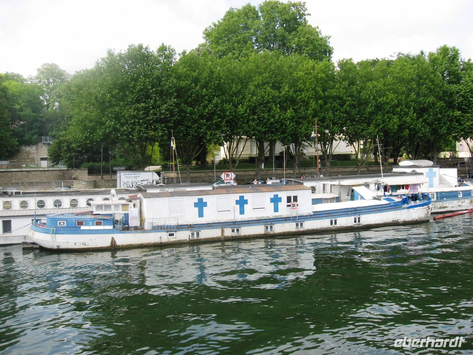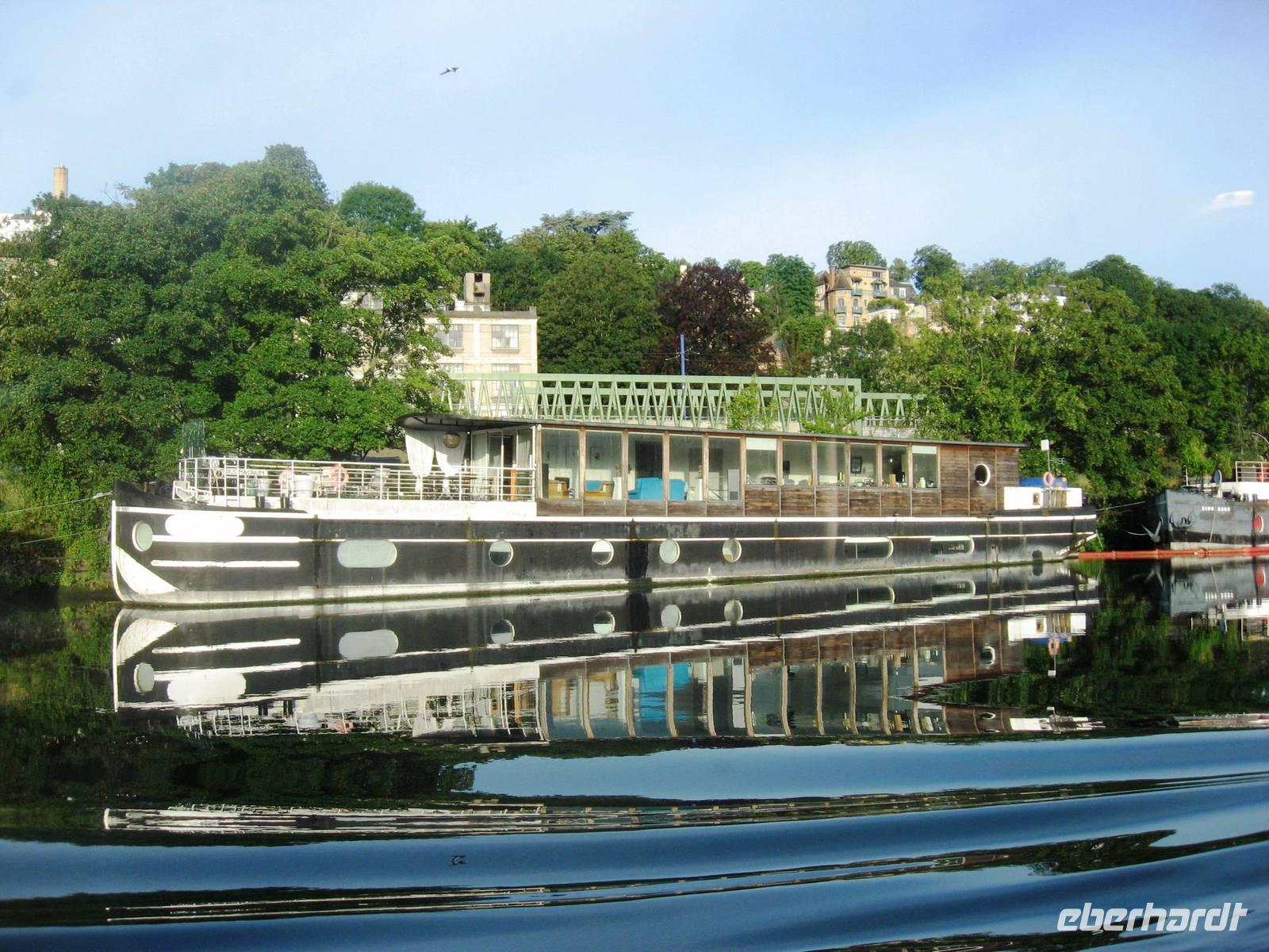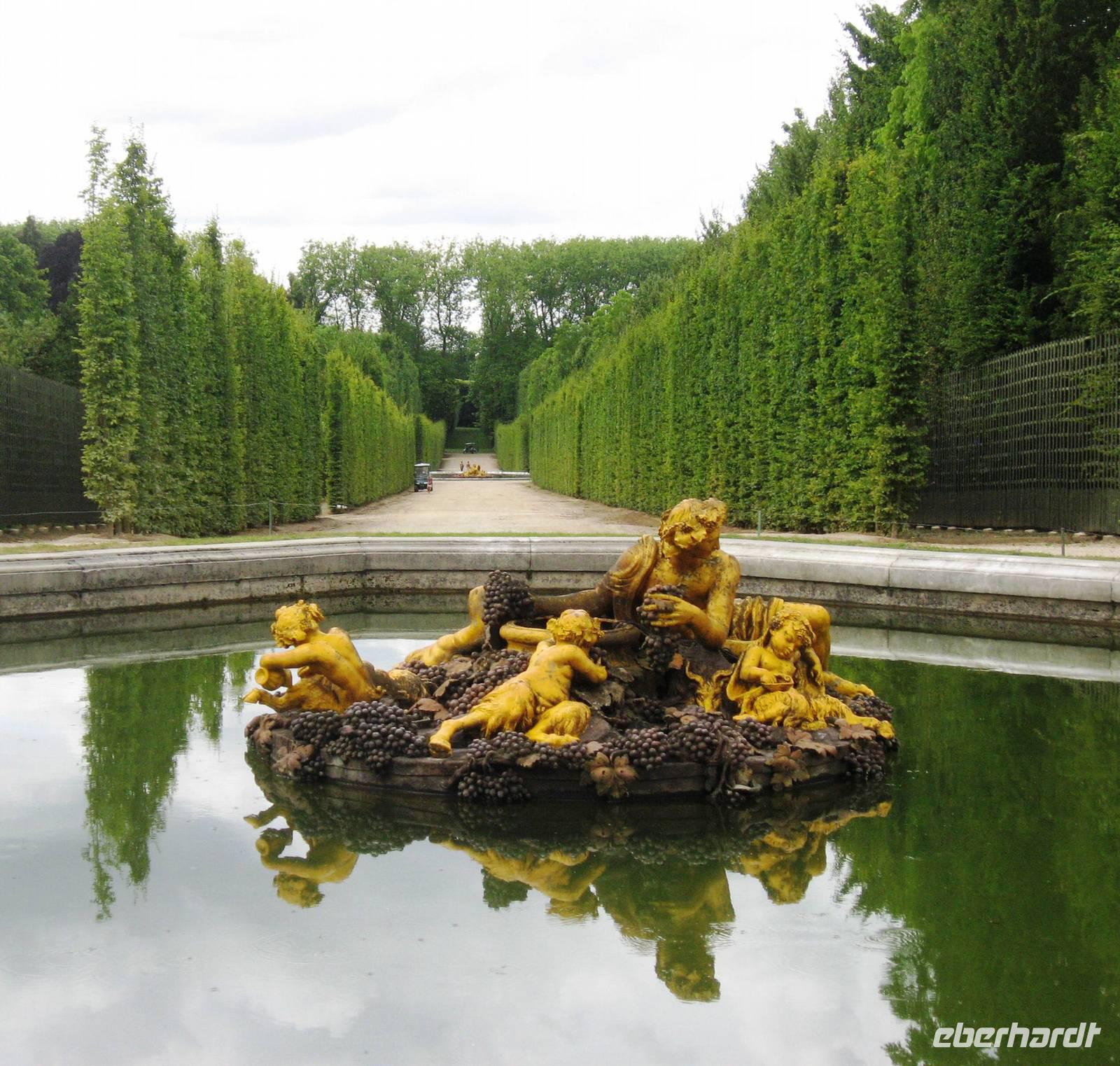 Früh am Morgen verlassen wir Paris, die eigentliche Flussfahrt beginnt. Während des Frühstücks gleiten wir an der Landschaft und an vielen interessanten Hausbooten vorbei. Später kommen wir der Natur vom Sonnendeck aus näher... Im Salon gibt es viele Informationen über die Seine und/oder Rätselspiele. Nach dem Mittagessen machen wir von Poissy aus einen Ausflug nach Versailles in die großartigen Gartenanlagen des berühmten Schlosses. Je nach Wunsch kann man hier einen größeren oder kleineren Spaziergang machen. Mit einigen Gästen zusammen machen wir einen etwas größeren Spazierweg von der Schlossterrasse aus bis zur Orangerie, zum „Ballsaal", vorbei am Bacchus- und am Saturnbecken, durch einen Hain hindurch zum schönen Apollobecken, in dem sich - wie in fast allen Wasserbecken, Karpfen tummeln. Schon von oben aus haben wir den großen Kanal gesehen und gestaunt, wie viel Perspektive und Tiefe er dem Garten verleiht, jetzt gehen wir auf ihn zu und könnten ein Ruderboot mieten, um eine halbe oder gar eine ganze Stunde auf ihm hin- und herzufahren. Aber wir möchten den Garten weiter zu Fuß erkunden, - ein erfrischendes Eis und wir gehen weiter in Richtung Trianon, biegen aber vorher wieder rechts ab und erreichen das große und geheimnisvolle Neptunbecken auf der rechten Seite des Schlosses, von wo aus wir wieder Richtung Ausgang streben. Au revoir, Versailles. Am späten Nachmittag kommen wir mit dem Bus am Schiff in Mantes-la-Jolie an und fahren weiter bis nach Vernon, einer hübschen Stadt mit einer sehr sehenswerten Kirche unweit unseres Anlegers, zu der wir mit drei regenfesten Gästen ;-) nach dem Abendessen noch einen Spaziergang machen. Rund um die Kirche stehen schmucke Fachwerkhäuser.