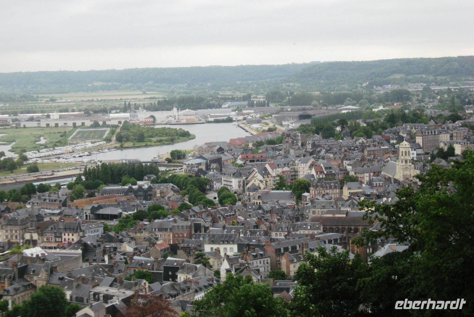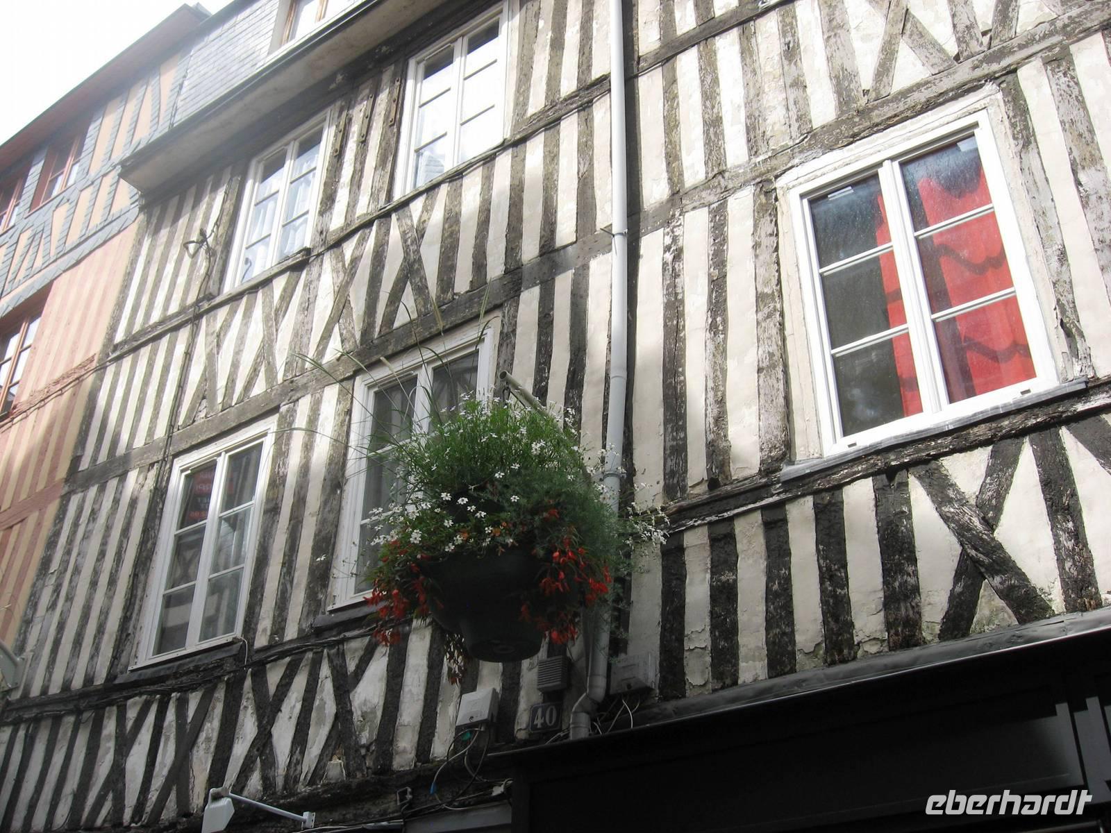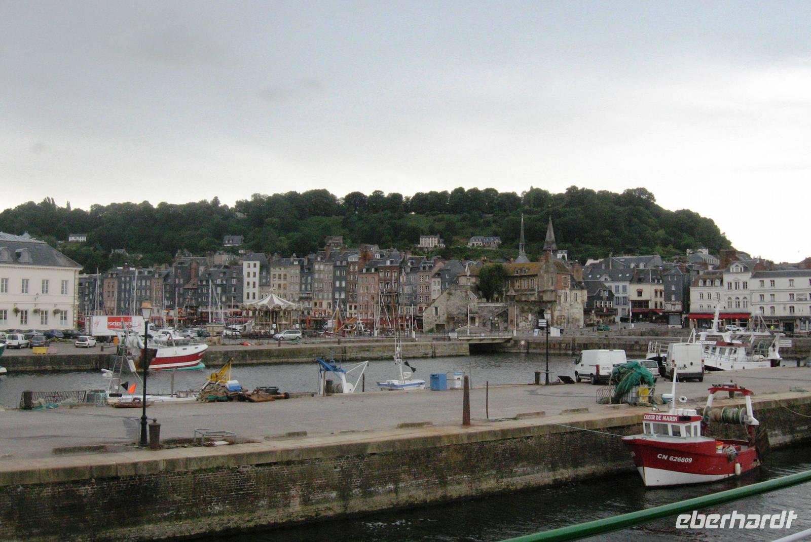 Nach dem Frühstück brechen wir zur Erkundung von Honfleur auf. Wir spazieren am Hafenbecken entlang und gehen zunächst in Richtung Rathaus/Mairie, dann ein kleines Stück durch das älteste Stadtviertel, das „Enclos", vorbei an den großen Salzspeichern in Richtung St. Leonards-Kirche. Man merkt, dass wir in einer Hafenstadt sind: in der Kirche wird das Weihwasser für die Gläubigen in zwei großen Muscheln auf Sockeln dargeboten. Die Holzschnitzereien und -skulpturen in der Kirche sind auffallend schön. Vor der Kirche schauen wir uns noch einmal die schöne Fassade der Kirche an und ein Gast macht uns auf die beiden Maulbeerbäume vor der Kirche aufmerksam, Raupen eingeschlossen.