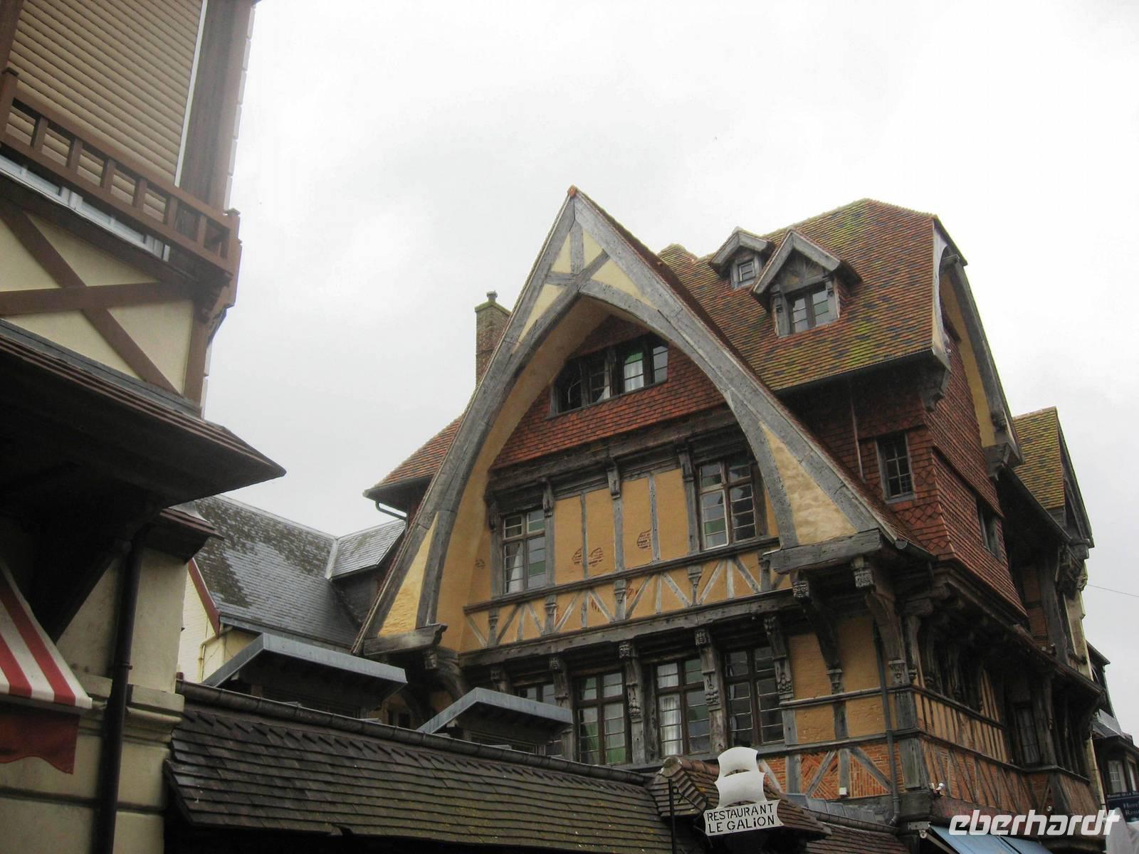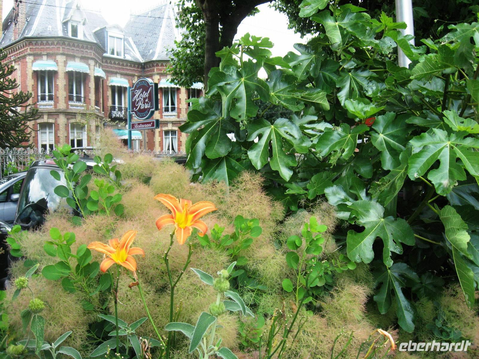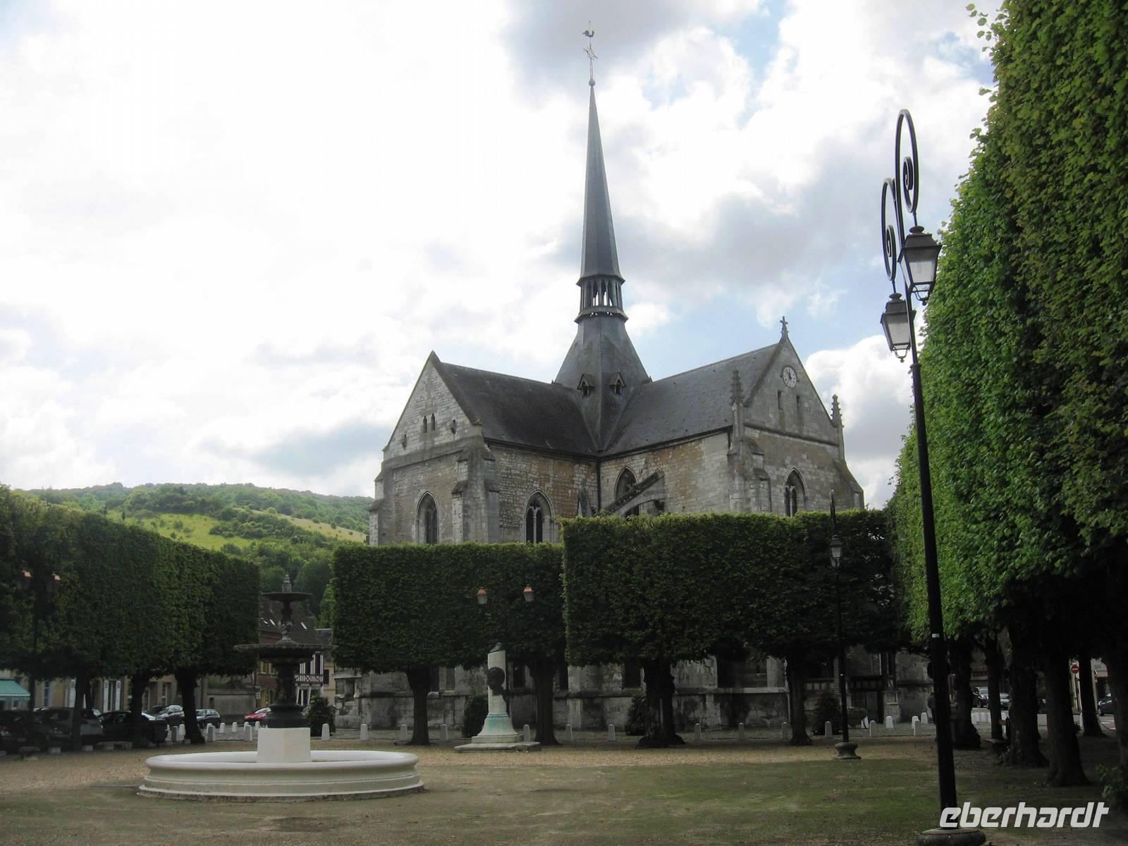 Nach dem Frühstück brechen wir zur Erkundung von Honfleur auf. Wir spazieren am Hafenbecken entlang und gehen zunächst in Richtung Rathaus/Mairie, dann ein kleines Stück durch das älteste Stadtviertel, das „Enclos", vorbei an den großen Salzspeichern in Richtung St. Leonards-Kirche. Man merkt, dass wir in einer Hafenstadt sind: in der Kirche wird das Weihwasser für die Gläubigen in zwei großen Muscheln auf Sockeln dargeboten. Die Holzschnitzereien und -skulpturen in der Kirche sind auffallend schön. Vor der Kirche schauen wir uns noch einmal die schöne Fassade der Kirche an und ein Gast macht uns auf die beiden Maulbeerbäume vor der Kirche aufmerksam, Raupen eingeschlossen.