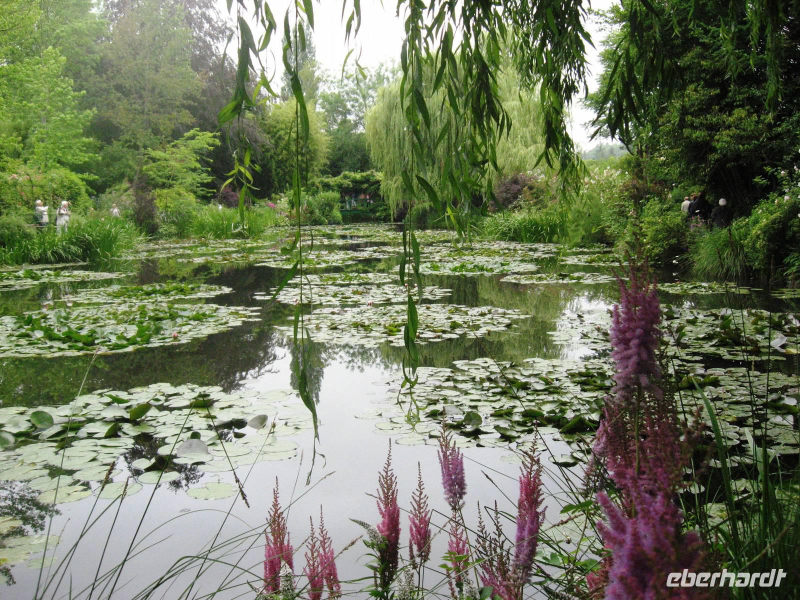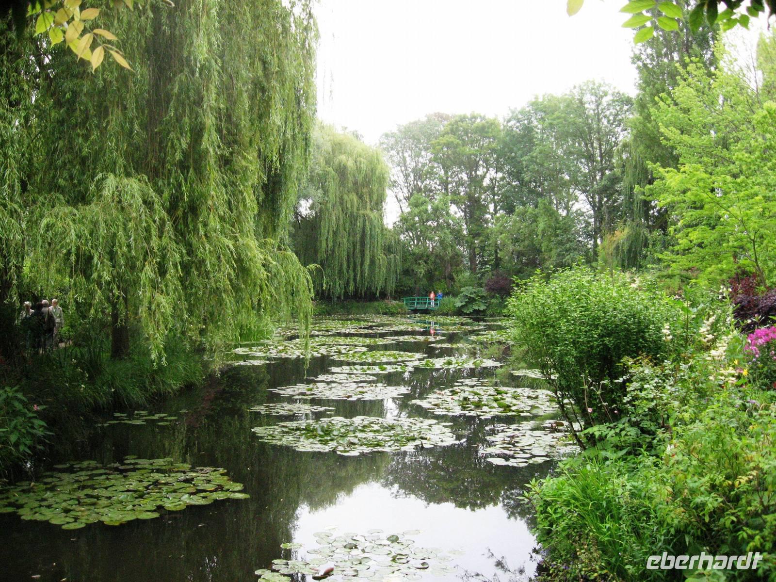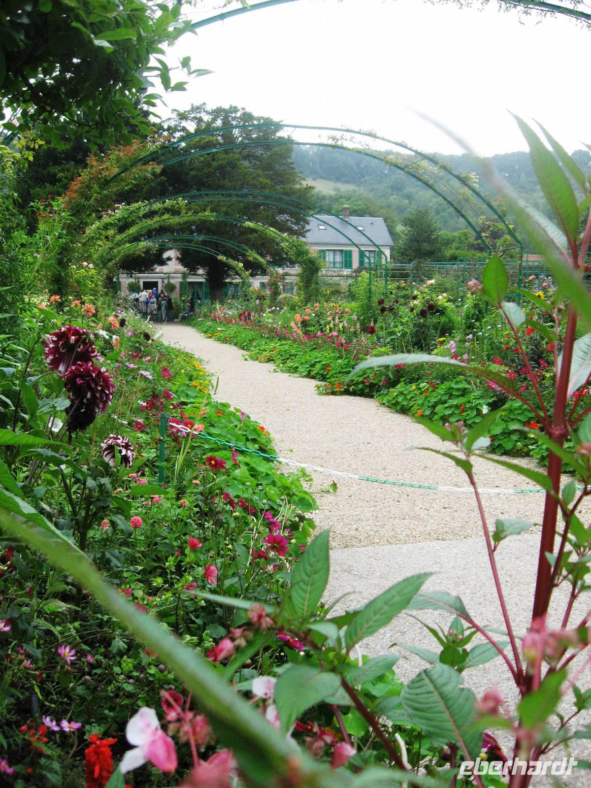 Heute frühstücken wir schon ab 7:00 Uhr, damit wir um 08:30 Uhr nach Giverny fahren können, um dort Haus und Garten des Malers Claude Monet zu besuchen. Claude Monet ist einer der bekanntesten impressionistischen Maler. Er lebte mit seiner Familie ab 1883 in Giverny, ab 1890 durch die finanzielle Unterstützung seines Freundes, des Kunsthändlers Paul Durand-Ruel in seinem Clos Normand, das wir besuchen; zusätzlich ließ er einige Jahre später einen Seerosenteich anlegen und konnte nun, wann immer er es wollte, vom Haus in den Garten oder zu den Seerosen gehen und sie bei den von ihm jeweils für optimal erachteten Lichtverhältnissen malen. Als wir kommen, ist der Garten noch leer, still liegt der große Seerosenteich, die Seerosen sind gerade dabei, sich langsam zu öffnen. Die Beete sind üppig bepflanzt, in der Allee vor dem Haus fängt die Kapuzinerkresse an, malerisch über den Boden zu wachsen. Im Haus können alle Räume besichtigt werden; besonders interessant die Atelierräume, das zitronengelb möblierte Esszimmer und die blau-weiß gekachelte Küche mit dem Kupfergeschirr. Im großen Seerosenatelier, in dem es viele Postkarten, bebilderte Bücher und andere schöne Dinge gibt, laden Sofas ein, Platz zu nehmen und sich in die Zeit zurückzuversetzen, in der Claude Monet hier an seinen großen Seerosenbildern malte. Wir haben viel Zeit und können noch einen Spaziergang auf der nach dem Maler benannten Hauptstraße des Dorfes machen. Hier kann man im schön bepflanzten Garten des Impressionisten-Museums spazieren gehen oder zum Grabmal des Malers pilgern.