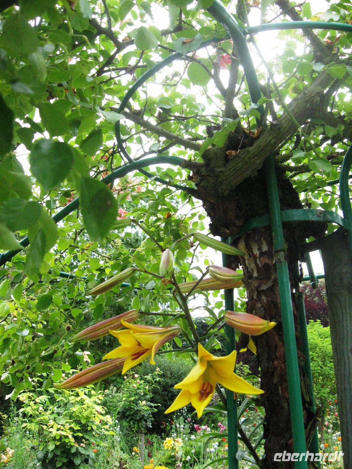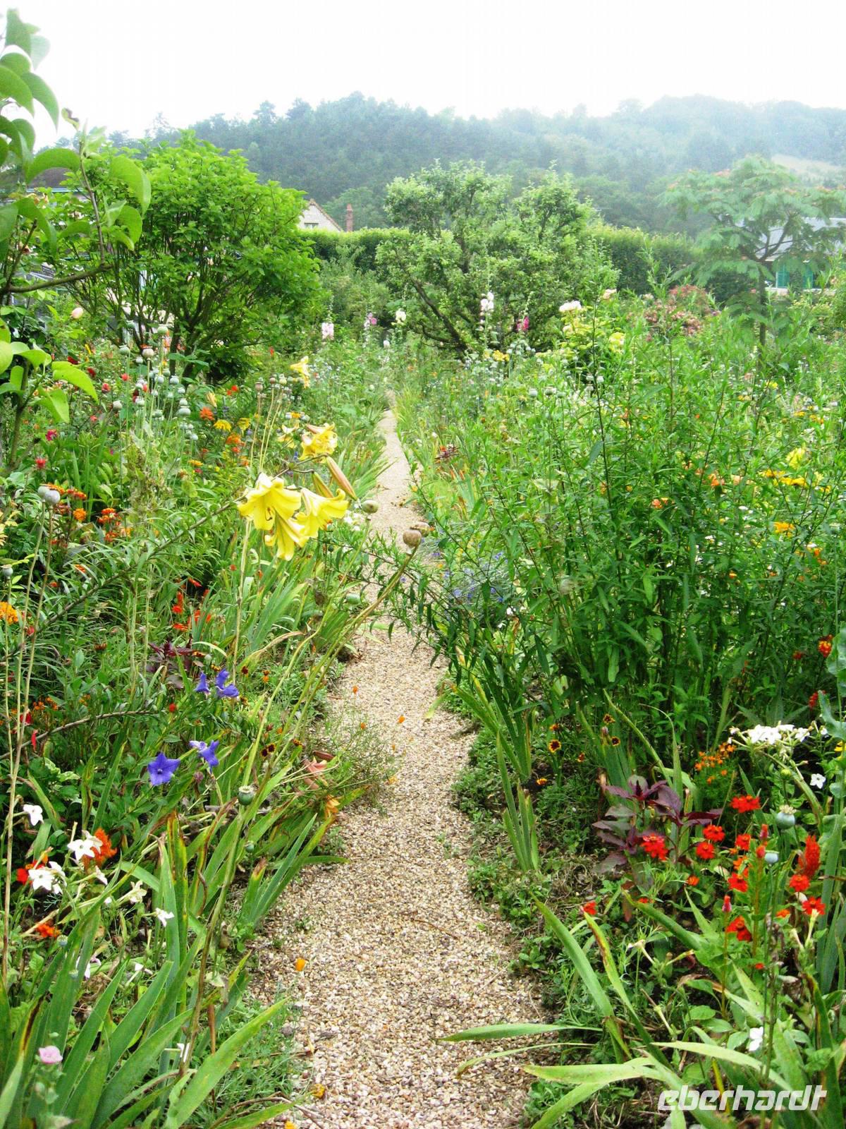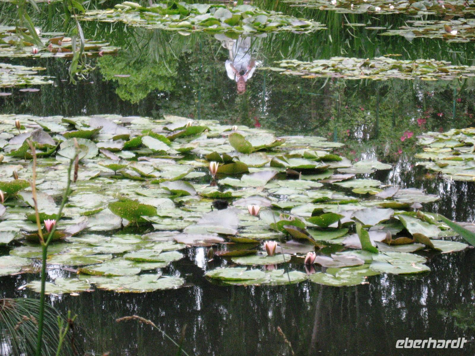 Heute frühstücken wir schon ab 7:00 Uhr, damit wir um 08:30 Uhr nach Giverny fahren können, um dort Haus und Garten des Malers Claude Monet zu besuchen. Claude Monet ist einer der bekanntesten impressionistischen Maler. Er lebte mit seiner Familie ab 1883 in Giverny, ab 1890 durch die finanzielle Unterstützung seines Freundes, des Kunsthändlers Paul Durand-Ruel in seinem Clos Normand, das wir besuchen; zusätzlich ließ er einige Jahre später einen Seerosenteich anlegen und konnte nun, wann immer er es wollte, vom Haus in den Garten oder zu den Seerosen gehen und sie bei den von ihm jeweils für optimal erachteten Lichtverhältnissen malen. Als wir kommen, ist der Garten noch leer, still liegt der große Seerosenteich, die Seerosen sind gerade dabei, sich langsam zu öffnen. Die Beete sind üppig bepflanzt, in der Allee vor dem Haus fängt die Kapuzinerkresse an, malerisch über den Boden zu wachsen. Im Haus können alle Räume besichtigt werden; besonders interessant die Atelierräume, das zitronengelb möblierte Esszimmer und die blau-weiß gekachelte Küche mit dem Kupfergeschirr. Im großen Seerosenatelier, in dem es viele Postkarten, bebilderte Bücher und andere schöne Dinge gibt, laden Sofas ein, Platz zu nehmen und sich in die Zeit zurückzuversetzen, in der Claude Monet hier an seinen großen Seerosenbildern malte. Wir haben viel Zeit und können noch einen Spaziergang auf der nach dem Maler benannten Hauptstraße des Dorfes machen. Hier kann man im schön bepflanzten Garten des Impressionisten-Museums spazieren gehen oder zum Grabmal des Malers pilgern.