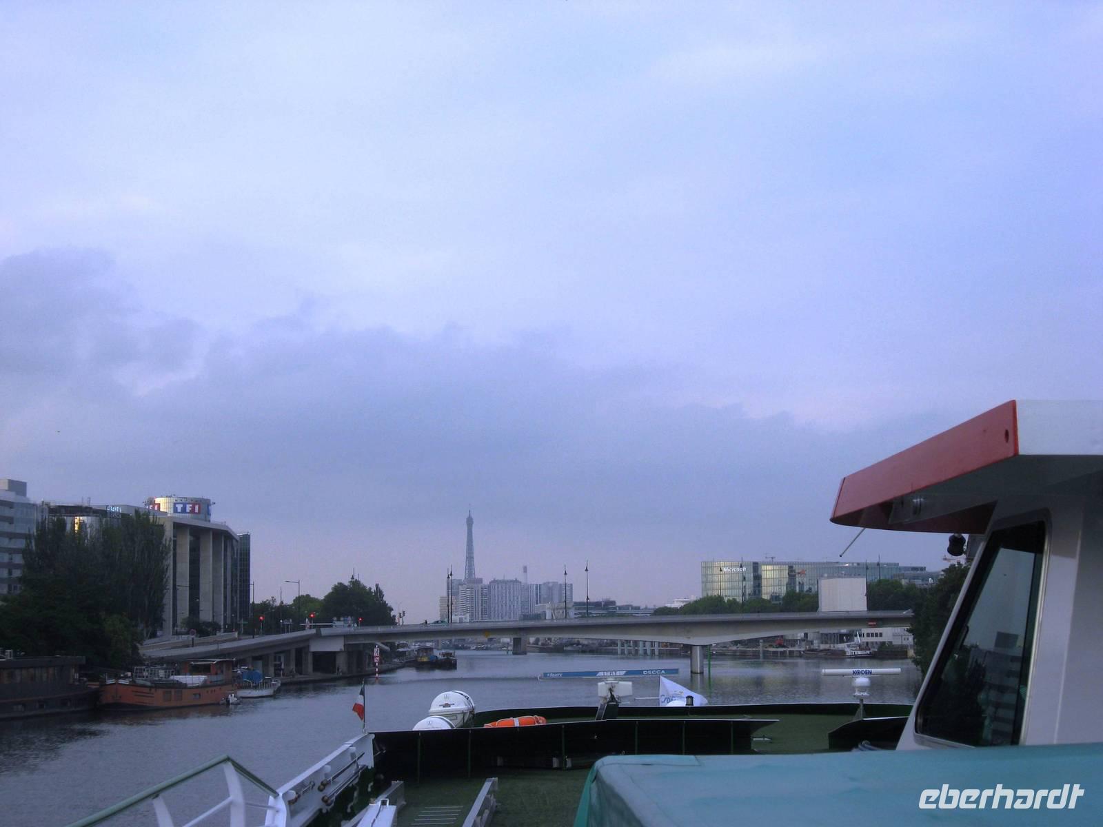 Langsam erreichen wir Paris, die Häuser wachsen höher und höher in den Himmel. Die letzte Schleuse ist die von Suresnes und danach dauert es gar nicht mehr lange, bis wir wieder am quai de Grenelle ankommen. Viele gehen von Bord, um ein Stück zu spazieren, an der Seine entlang, vielleicht sogar zu Fuß zum Eiffelturm und dann eventuell sogar noch auf die „1. Etage", um Paris von oben zu betrachten. Die Luft ist mild.