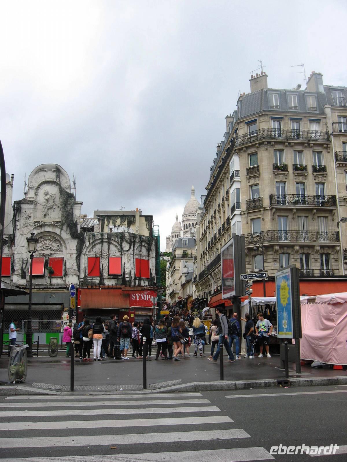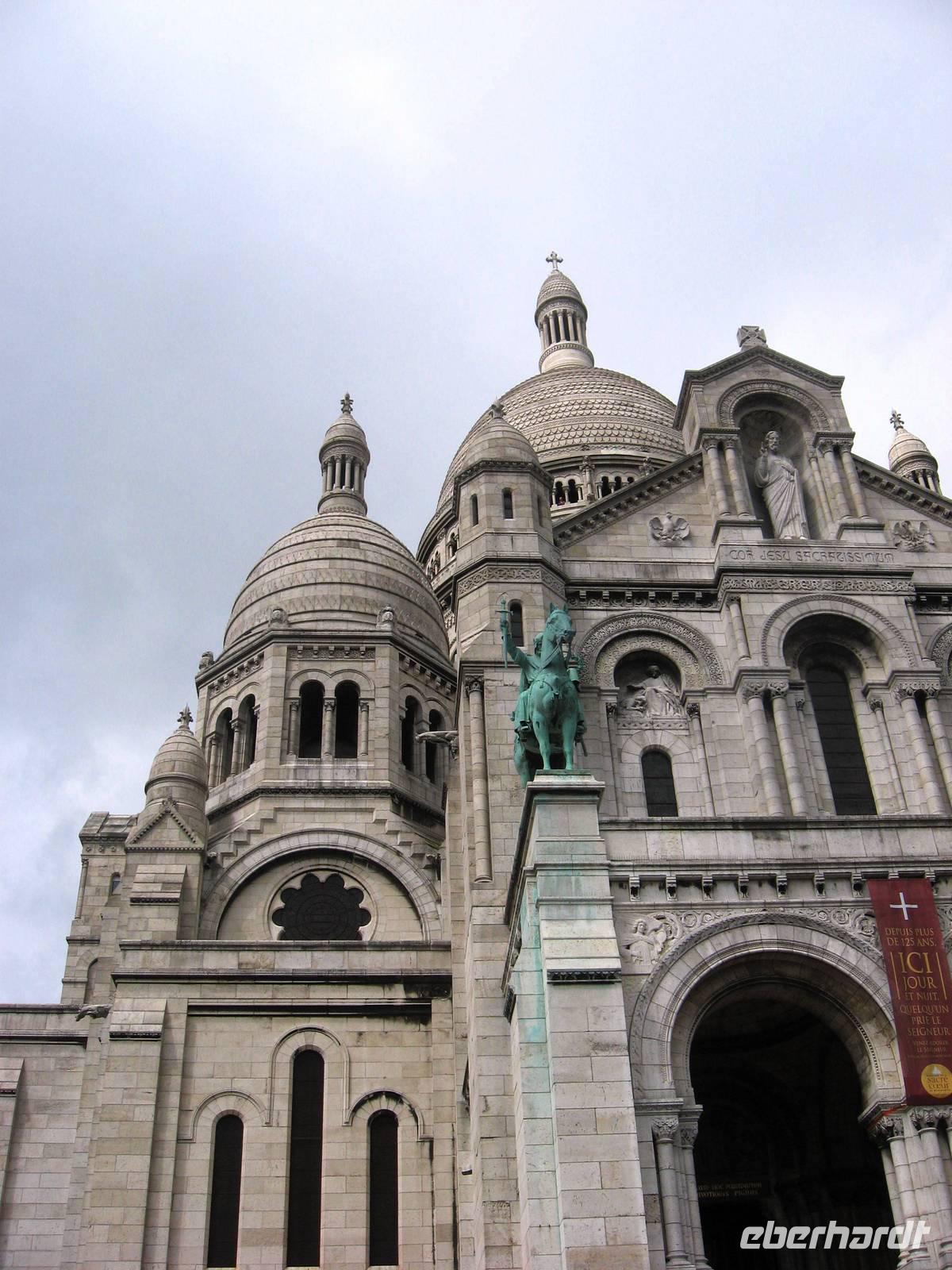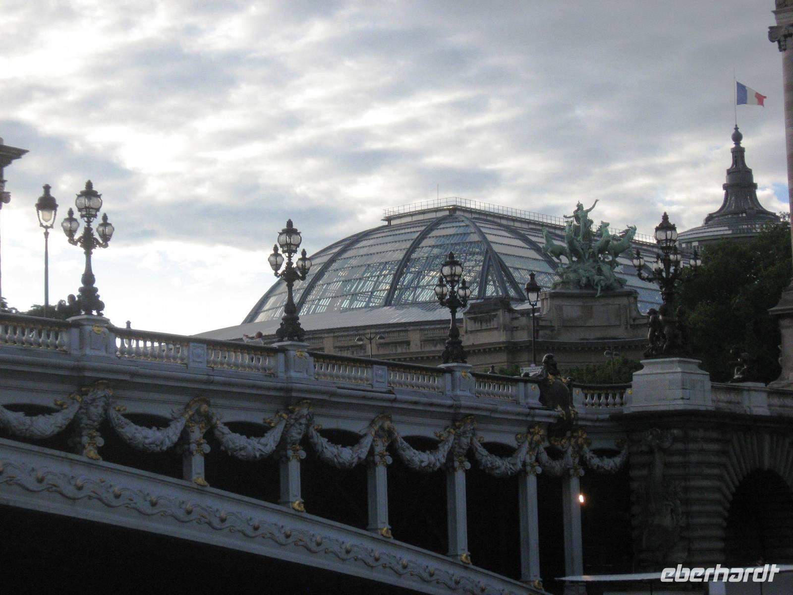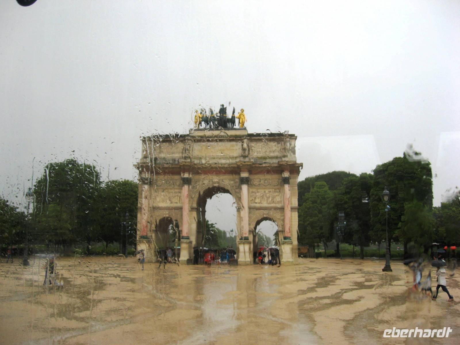 Nach unserem Frühstück treffen wir uns mit Stadtführer Francois im Bus zu unserer ausführlichen Stadtrundfahrt durch Paris. Wir fahren am Trocadéro-Platz vorbei (von hier aus hat man einen schönen Blick auf den Eiffelturm) bis zum 50 m hohen Arc de Triomphe, dann auf die Champs Elysées, die schon für den morgigen Nationalfeiertag geschmückt sind - deshalb fallen Nobeladressen wie das Restaurant Fouquets, das Lido und Louis Vuitton heute weniger auf - über den Concorde-Platz (mit dem Obelisken) in Richtung Grand Palais (heute Ausstellungsort), dann am Elysée-Palast vorbei, um die Madeleine-Kirche herum, später an der Opéra Garnier vorbei zum Vendôme-Platz, Adresse des Ritz-Hotels, in dem u. a. Coco Chanel und Ernest Hemingway zeitweise gewohnt haben. Weiter geht es in Richtung Montmartre-Viertel, wir fahren vorbei an der legendären Mühle Moulin Rouge und am Pigalle, dann zurück in Richtung Seine vorbei an der Comédie Francaise, dem Theaterhaus, das für Molière gebaut worden ist, in den Hof des Louvre hinein - hier: neben den Gebäuden des Louvre selbst die moderne Glas-Pyramide, der Arc du Carrousel, der Tuileriengarten -, dann weiter über die Ile de la Cité (mit Notre-Dame) hinüber ins Quartier Latin, am Panthéon vorbei, ins Montparnasse-Viertel und zurück auf die rechte Seine-Seite zur Place de la Bastille, wo vor nahezu 225 Jahren die Französische Revolution mit dem Sturm auf das Bastille-Gefängnis begann. Später zurück zum Schiff, wo wir das feine Mittagessen genießen, bevor Michael nachmittags noch einmal unseren Bus in Richtung Montmartre-Viertel lenkt. Wir spazieren und fahren (mit der funiculaire) hoch zur Sacré-Coeur-Basilika. Auf dem Vorplatz, in der Basilika und überhaupt im ganzen Viertel ist sehr viel Betrieb. Das große Herz-Jesu-Mosaik und die Stimmung nehmen gefangen. Dann spazieren wir weiter bis zum Tertre-Platz: viele Cafés, noch mehr Künstler und ihre Werke, ein reges Treiben; leider fängt es an zu regnen und hört eigentlich erst wieder auf, nachdem wir im Bus auf dem Weg zurück zum Schiff sind.