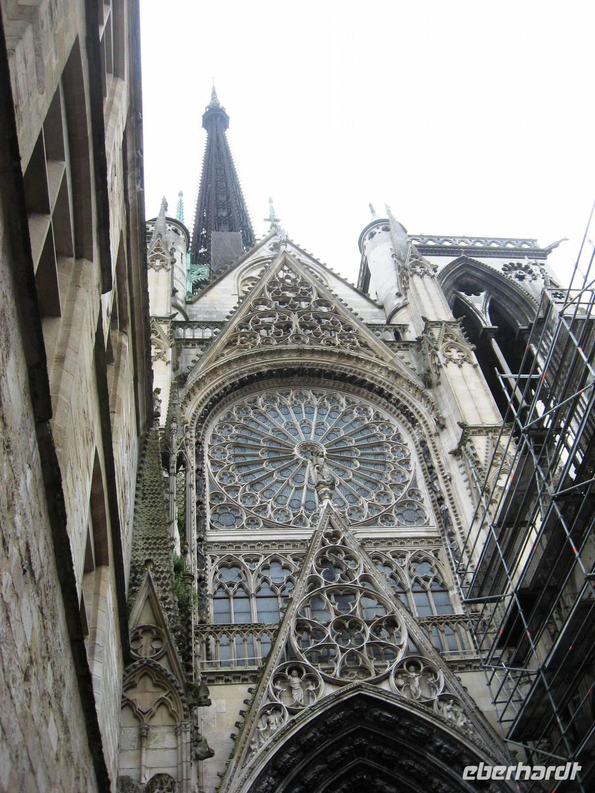 In der Kathedrale nehmen wir uns Zeit, um die schönen Glasfenster der Kathedrale, insbesondere die Glasarbeiten der Rosetten und die Chagall- und Knoebel-Fenster in der Apsis zu betrachten. Die Chagall-Fenster sind von 1974 und die Fenster des Düsseldorfer Künstlers Imi Knoebel sind vor wenigen Jahren nach seinen Entwürfen von spezialisierten Werkstätten in Reims und Paris gefertigt worden. Die Vielfalt der baulichen und figürlichen Gestaltung innen wie außen und die Größe des Bauwerks beeindrucken uns alle.