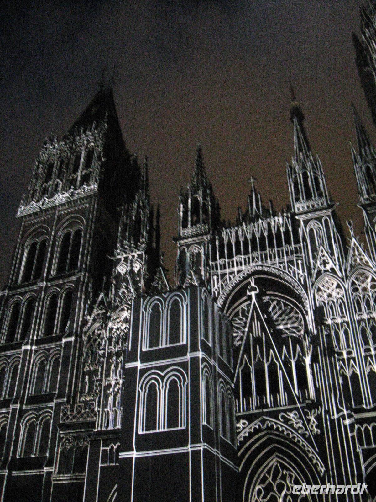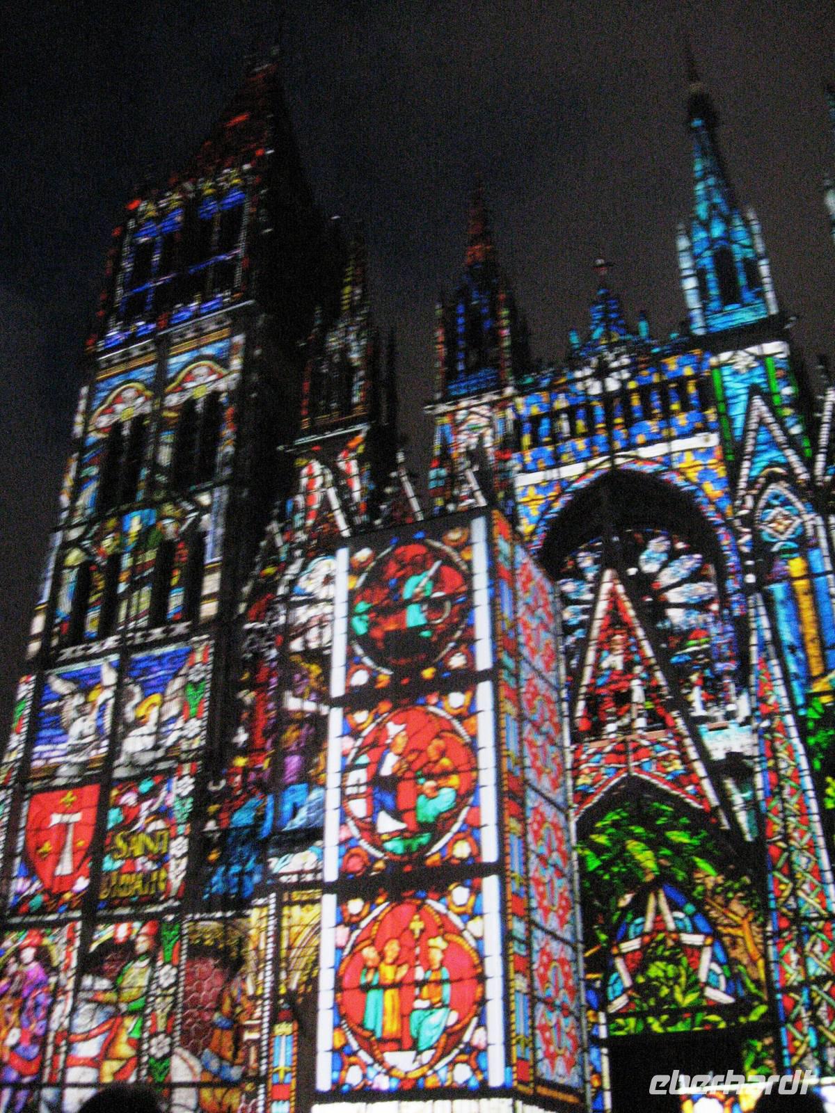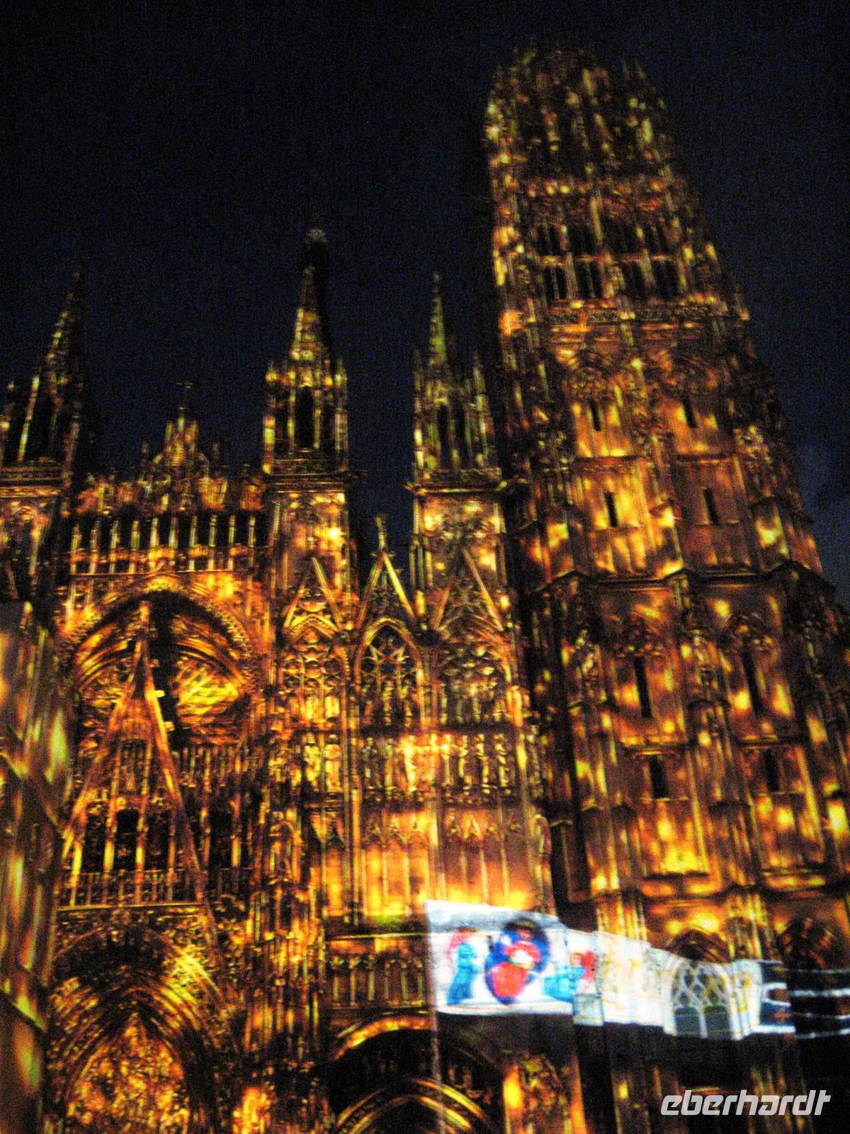 Nach dem Mittagessen legen wir in Rouen an, der Stadt der 100 Kirchtürme, wie Victor Hugo schwärmte. Rouen ist die Hauptstadt der oberen Normandie. Am Anleger treffen wir uns mit unserer Stadtführerin und gehen mit ihr zuerst zur Kathedrale, über die sie uns viel zu erzählen hat. Die Kathedrale ist eine Marienkirche, Grabstätte der normannischen Herzöge und wurde im zweiten Weltkrieg im April 1944 von 7 Bomben getroffen. Ein Laternenturm gibt zusätzliches Licht in den Bau. Schließlich verlassen wir die Kathedrale und spazieren weiter an der schön geschmückten Kirche St. Maclou vorbei und gelangen zum Aître St. Maclou, einem ehemaligen Pestfriedhof, in dem heute die Kunsthochschule von Rouen untergebracht ist. Weiter spazieren wir durch schöne Fachwerkstraßen und -gassen und kommen schließlich zur Hauptstraße, der rue de l'horloge, die von der Kathedrale zum Alten Markt führt und in der eine wunderschöne, große Turmuhr steht. Von hier weiter zum Alten Markt, auf dem Jeanne d'Arc hingerichtet worden ist. In der großen Kirche aus den 70er Jahren des 20. Jahrhunderts denken wir an ihre Geschichte und verabschieden uns dann von unserer Stadtführerin. Es bleibt noch Zeit für weitere Entdeckungen und Einkäufe bis zum Abendessen. Um 22:00 Uhr beginnt das WM-Halbfinalspiel Deutschland : Brasilien. Aus dem Salon der MS Renoir ist schnell eine deutsche Fanmeile geworden..., trotzdem sind wir relativ viele, die um 22:40 Uhr wieder in Richtung Kathedrale prozessieren, um die kunstvolle Illumination der Kathedrale anzusehen, bevor wir uns - zurück auf dem Schiff - wieder dem Fußball zuwenden...