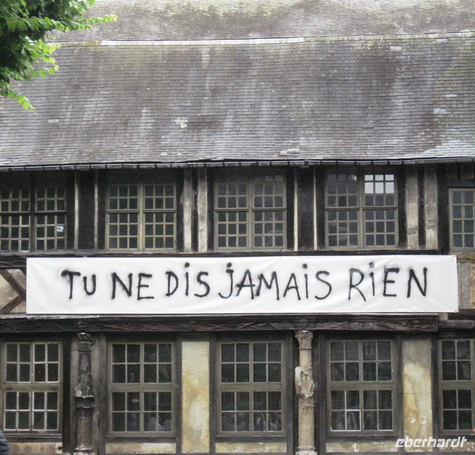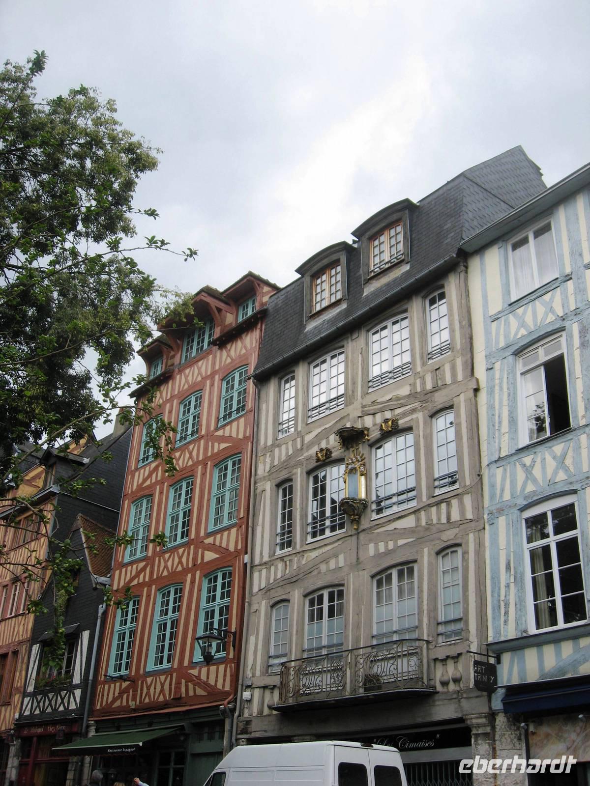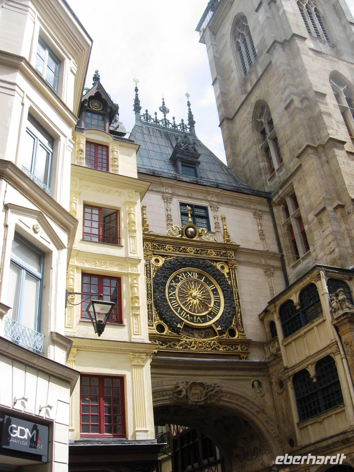 Nach dem Mittagessen legen wir in Rouen an, der Stadt der 100 Kirchtürme, wie Victor Hugo schwärmte. Rouen ist die Hauptstadt der oberen Normandie. Am Anleger treffen wir uns mit unserer Stadtführerin und gehen mit ihr zuerst zur Kathedrale, über die sie uns viel zu erzählen hat. Die Kathedrale ist eine Marienkirche, Grabstätte der normannischen Herzöge und wurde im zweiten Weltkrieg im April 1944 von 7 Bomben getroffen. Ein Laternenturm gibt zusätzliches Licht in den Bau. Schließlich verlassen wir die Kathedrale und spazieren weiter an der schön geschmückten Kirche St. Maclou vorbei und gelangen zum Aître St. Maclou, einem ehemaligen Pestfriedhof, in dem heute die Kunsthochschule von Rouen untergebracht ist. Weiter spazieren wir durch schöne Fachwerkstraßen und -gassen und kommen schließlich zur Hauptstraße, der rue de l'horloge, die von der Kathedrale zum Alten Markt führt und in der eine wunderschöne, große Turmuhr steht. Von hier weiter zum Alten Markt, auf dem Jeanne d'Arc hingerichtet worden ist. In der großen Kirche aus den 70er Jahren des 20. Jahrhunderts denken wir an ihre Geschichte und verabschieden uns dann von unserer Stadtführerin. Es bleibt noch Zeit für weitere Entdeckungen und Einkäufe bis zum Abendessen. Um 22:00 Uhr beginnt das WM-Halbfinalspiel Deutschland : Brasilien. Aus dem Salon der MS Renoir ist schnell eine deutsche Fanmeile geworden..., trotzdem sind wir relativ viele, die um 22:40 Uhr wieder in Richtung Kathedrale prozessieren, um die kunstvolle Illumination der Kathedrale anzusehen, bevor wir uns - zurück auf dem Schiff - wieder dem Fußball zuwenden...