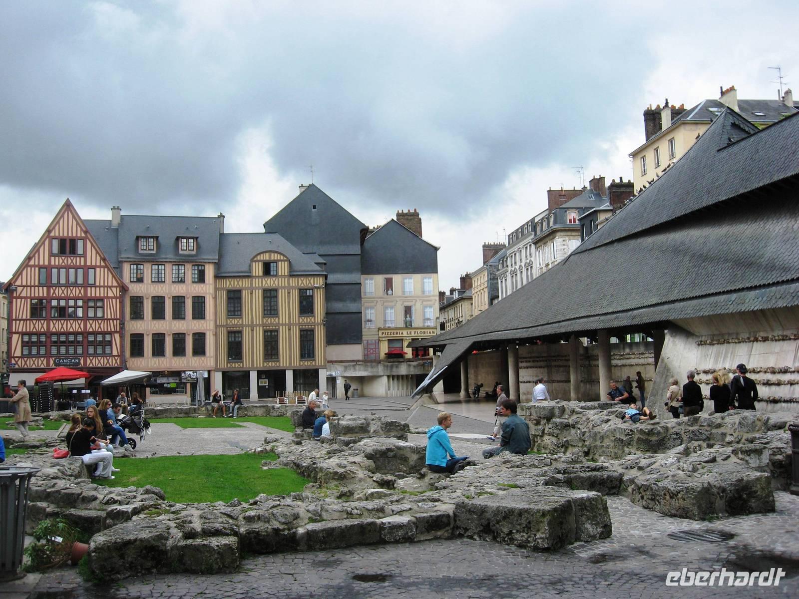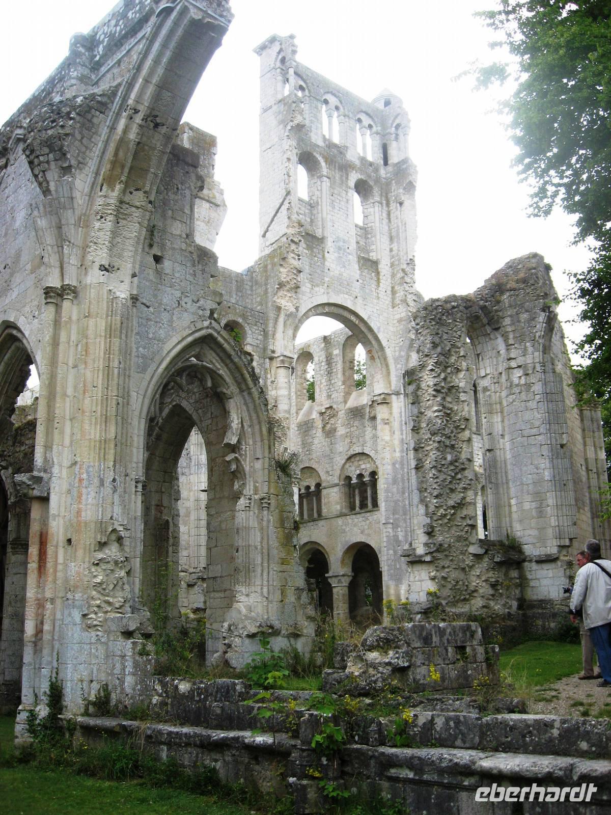 Nach dem Mittagessen fahren wir zu den schönsten Ruinen Frankreichs, den 46 m hohen Türmen, Mauern und Steinen der Abtei Jumièges, die sehr malerisch in einer Seine-Fluss-Schleife liegen. Die Abtei hat eine lange, wechselvolle Geschichte hinter sich. Sie wurde im 7. Jahrhundert gegründet und erlebte schon bald eine erste Blüte. Nachdem die Normandie durch den Vertrag von Clair-sur-Epte 911 an die Wikinger gefallen war, wurde die Abtei in noch größerem Umfang wiederaufgebaut und erlangte als Benediktinerabtei eine neue geistliche und wirtschaftliche Bedeutung. In den revolutionären Umbrüchen des 18. und 19. Jahrhunderts wurde ein Großteil der Gebäudesubstanz verkauft, bevor ein Pariser Börsenmakler das Anwesen erwarb. Im 20. Jahrhundert übernahm der französische Staat die ehemalige Abtei. Heute ist sie nicht nur ein beliebtes Ziel für Besucher, die sich für die Geschichte des Ortes interessieren, es finden hier auch viele Aufführungen und Ausstellungen statt. Mit einer schönen Spazierfahrt entlang der Seine beenden wir unseren Busausflug und gehen entweder einen Kaffee trinken, Einkäufe machen, an der Uferpromenade spazieren, die Autos zählen, die auf der kleinen rot-weißen Autofähre von hüben nach drüben fahren oder wir gehen in Duclair spazieren, schauen uns die sehr sehenswerte kleine Kirche an und das Rathaus.