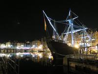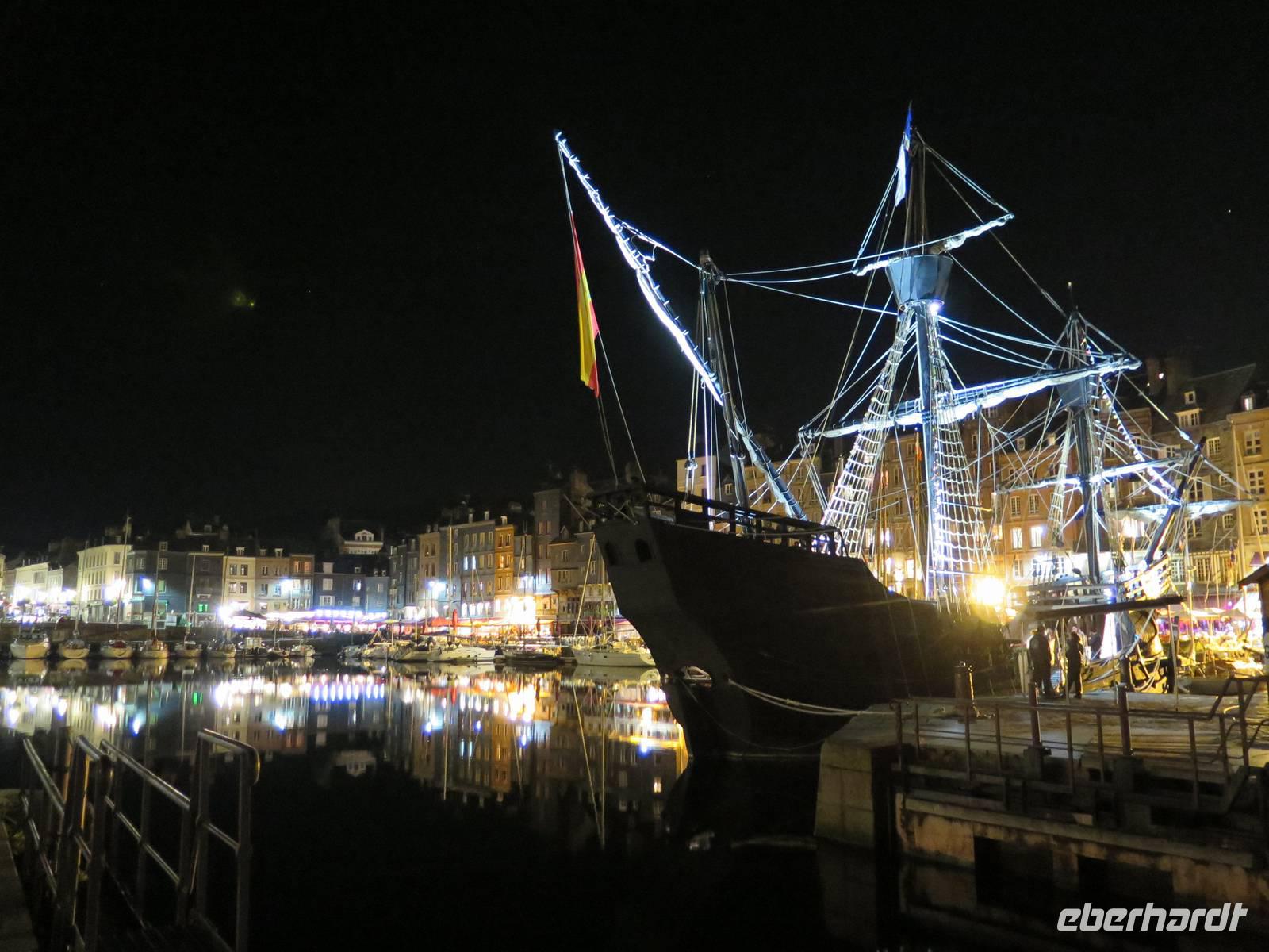 Wir fahren weiter auf der Seine entlang. Nach dem Mittag erreichen wir Duclair. Von hier aus starten wir mit dem Bus zu einem Ausflug nach Jumieges. Hier steht eine Abtei, die bis zu den Religionskriegen in Frankreich zu einem der größten Klöster zählte. Bei strahlendem Sonnenschein sind wir in den Ruinen unterwegs. Wir brauchen schon ein bisschen Fantasie, um uns die wechselvolle Geschichte des Klosters vorzustellen. Gegründet, niedergebrannt, wieder aufgebaut, geplündert, verwüstet, verlassen. Heute Eigentum des Staates und friedlich. Ein Stopp auf den Sitzplätzen in der Klosteranlage lohnt sich auch wegen der Stille hier. Dann sehen wir uns in Caudebac-en-Caux die Kirche aus dem 15. Jahrhundert an. Auf dem Weg zurück unterfahren wir zum zweiten Mal an diesem Tag die Pont de Brotonne. Eine der drei Seine-Brücken, die unseren Weg kreuzen. Spätabends dann die Pont de Tancarville, die längste Hängebrücke Frankreichs. Und noch später die blau erleuchtete Pont de Normandie, die zweite Schrägseilbrücke auf unserem Weg. Und die mit der größten Spannweite Europas. In der Nacht legen wir in Honfleur an.