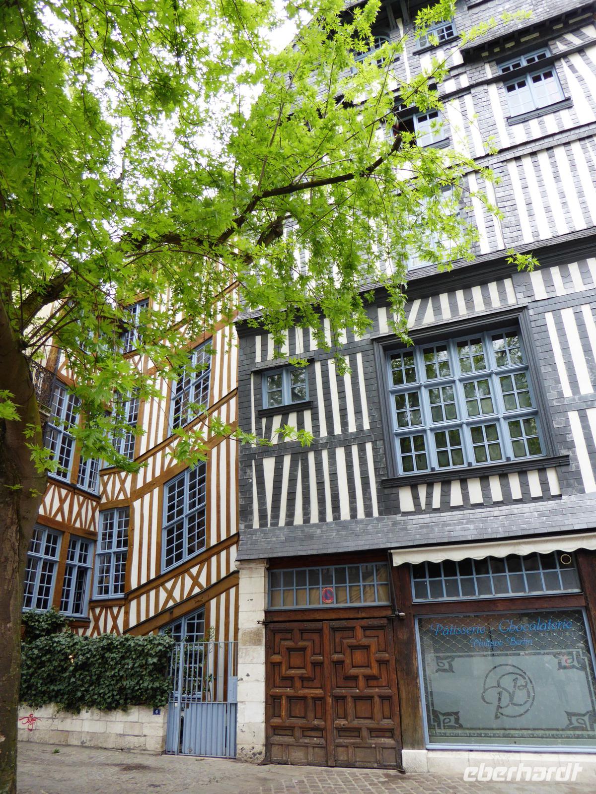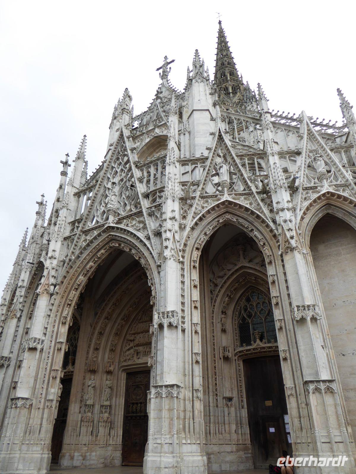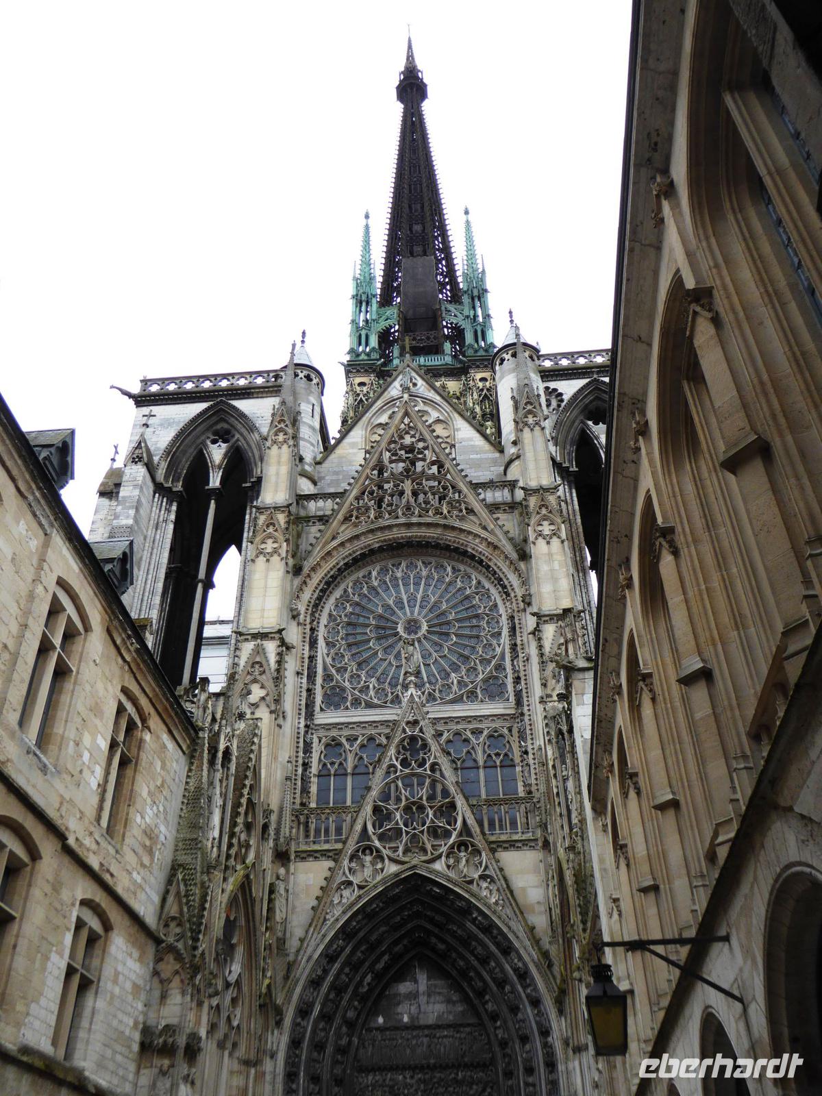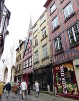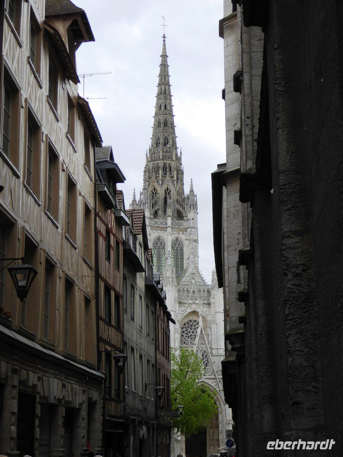 Wir gelangen zur Kathedrale. So viele Male ist sie von Claude Monet zu verschiedenen Tages- und Lichtzeiten im Bild festgehalten worden. Hier ist die Grabstätte der normannischen Herzöge. Überall wunderschöner Gebäudeschmuck. Die Restauration einer der beiden Türme ist vor nicht allzu langer Zeit zu Ende gebracht worden und so können wir die schöne Komplettansicht der Front genießen. In der Kathedrale konnten auch sehr alte, wertvolle Kirchenfenster wieder eingesetzt werden. Durch den Laternenturm kommt zusätzliches Licht in den Kirchenraum.Unser Spaziergang führt uns durch schöne mit Fachwerkhäusern bestandene Gassen zur Hauptstraße, der rue de l'horloge, und dann, nach ausführlicher Betrachtung der wunderschönen Turmuhr zum Alten Markt. Hier wurde Jeanne d'Arc hingerichtet. Wir setzen uns in den modernen Bau aus den 1970er Jahren, freuen uns an den schönen alten Kirchenfenstern, die diesem modernen Bau Glanz geben und erfahren vieles über das Leben der Johanna von Orléans.