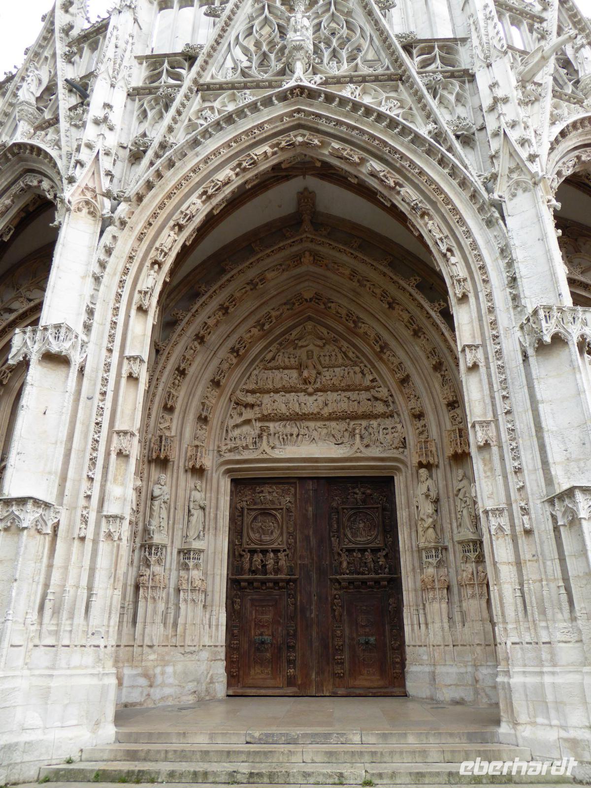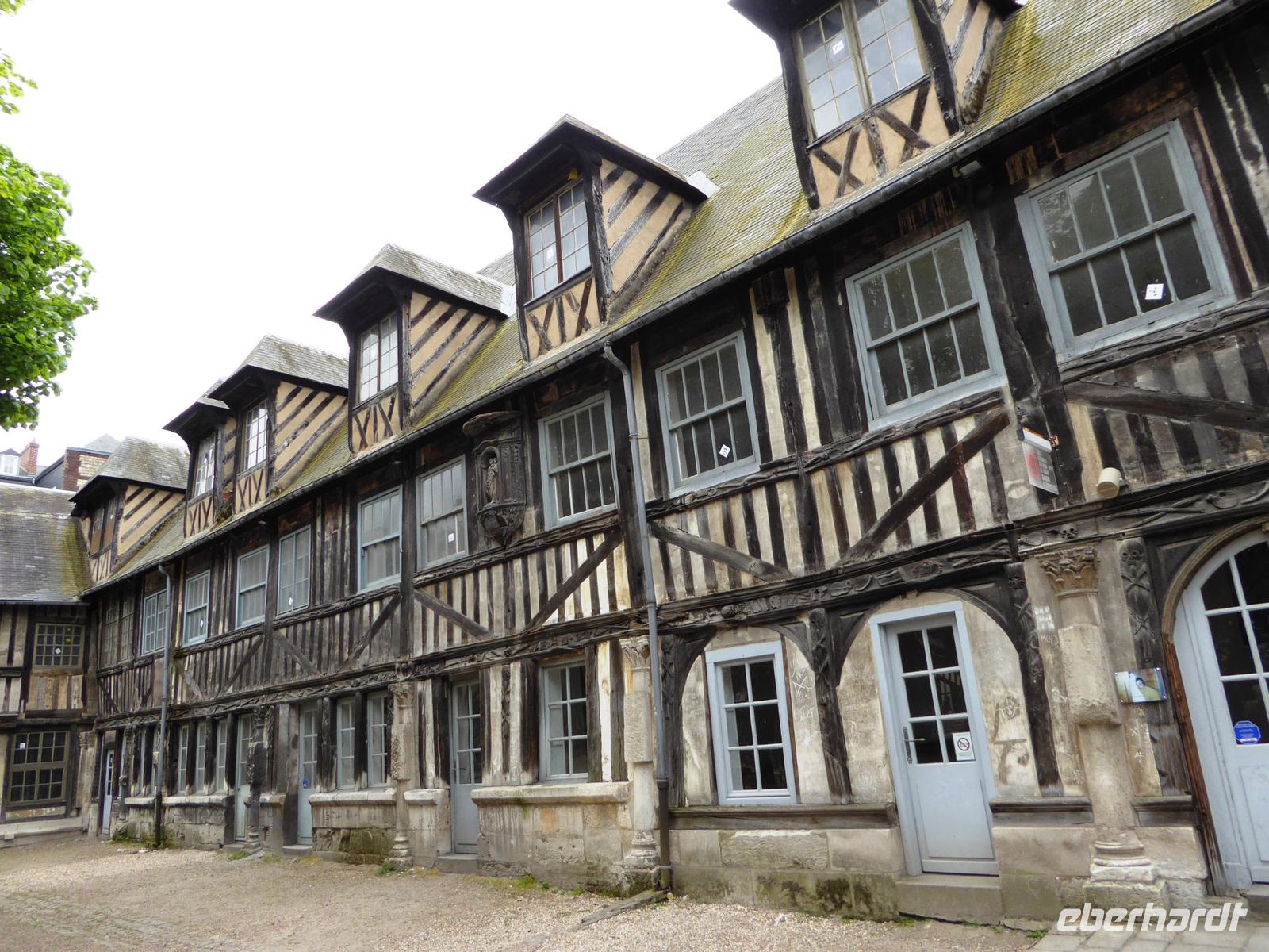 Am Anleger treffen wir uns mit unserer Stadtführerin und gehen mit ihr zuerst zur Kirche St. Maclou, an der uns der wunderschöne Gebäudeschmuck auffällt. Unser Weg führt uns dann zum Aître St. Maclou, einem früheren Pestfriedhof, die Schnitzereien rund um den Gebäudeblock in dessen Hof wir uns befinden, haben den Tod zum Thema.