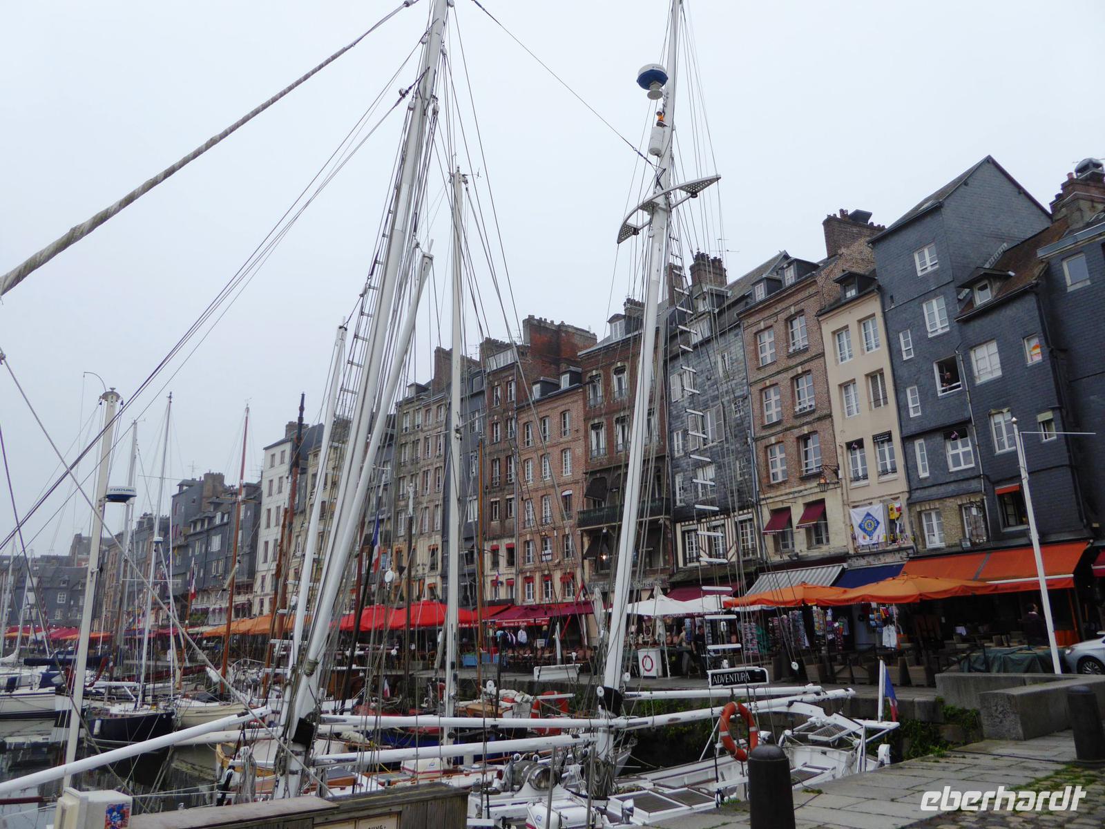 Wir wachen in Honfleur auf. Unser Schiff liegt günstig im Zentrum, in einem der kleinen Hafenbecken. Zu Fuß sind es nach dem Frühstück nur einige Minuten, vorbei an der Fischhalle und kleinen Ständen mit fangfrischem Fisch, bis zum berühmten alten Hafenbecken mit den schmalen, hohen Häusern, der gerade in Restaurierung befindlichen alten Kommandantur und der sehr kleinen alten Kirche direkt am Hafenbecken, die heute als Marine-Museum genutzt wird.