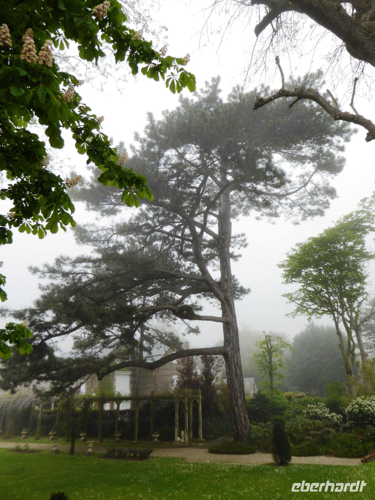 Statt der berühmten hohen Felsen links und rechts des Kieselstrandes sehen wir heute ...leider Nebel. Einige Gäste gehen dennoch ein Stückchen auf die links gelegene ca. 75 m hoheFalaise d'Aval hoch, um einen besseren Eindruck zu gewinnen