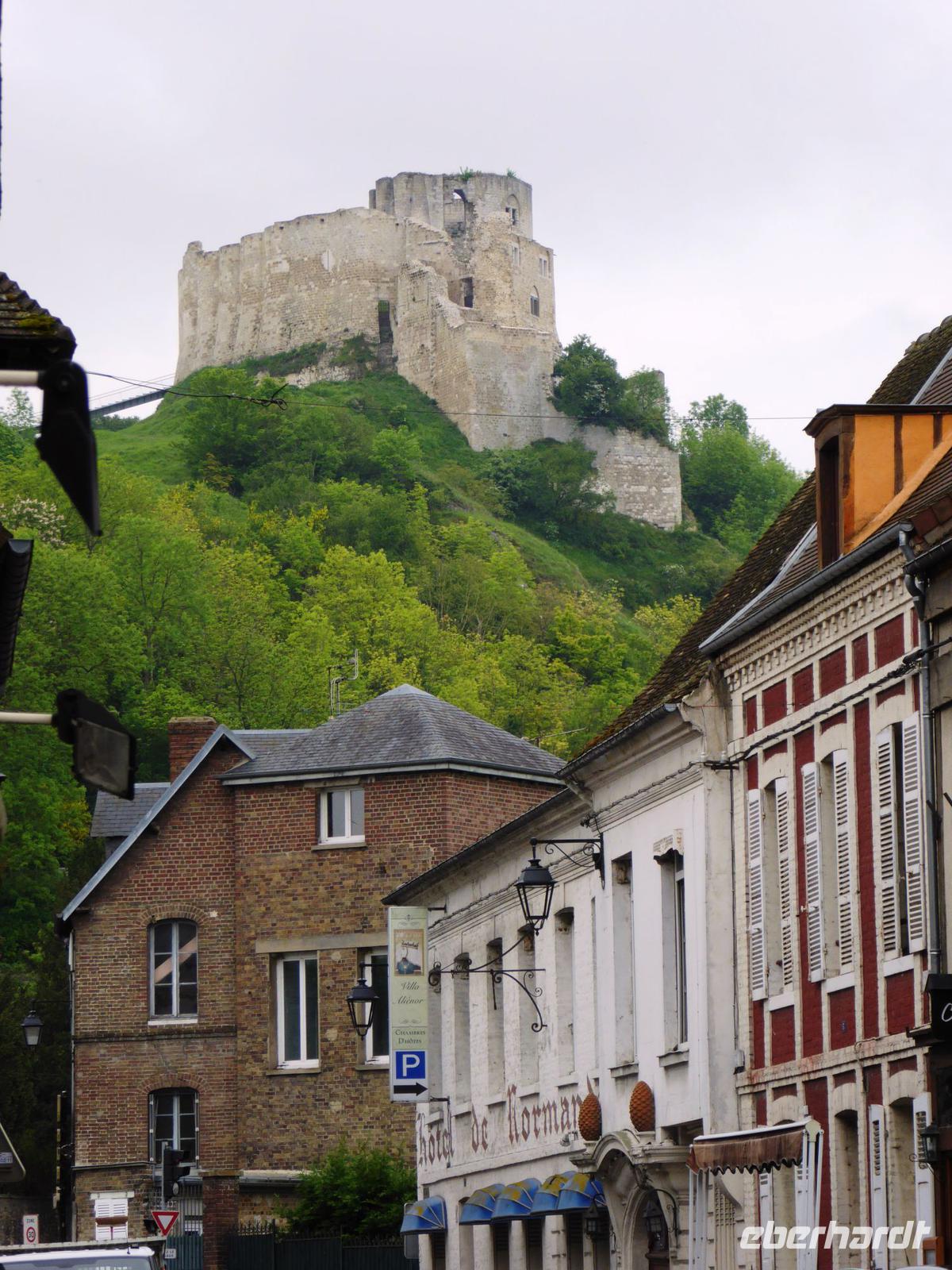 Nach unserem Mittagessen machen wir einen Ausflug zum Château Gaillard. Diese mächtige Burg ist im 12. Jahrhundert in - so will es die Geschichte - nur einem Jahr, gebaut worden. Richard Löwenherz, Herzog der Normandie, wollte sein Herzogtum vor Angreifern schützen. Noch heute kann man an den Ruinen die frühere Größe dieses Bauwerks ablesen. Wenn auch viele Steine später anderswo als Baumaterial genutzt worden sind, so kann man doch noch heute die einstige Mächtigkeit dieses Gebäudes erleben. Die Mauern des Donjons z. B. waren z. T. 5 m dick. Von hier aus hatte man die alle Angreifer im Blick.