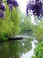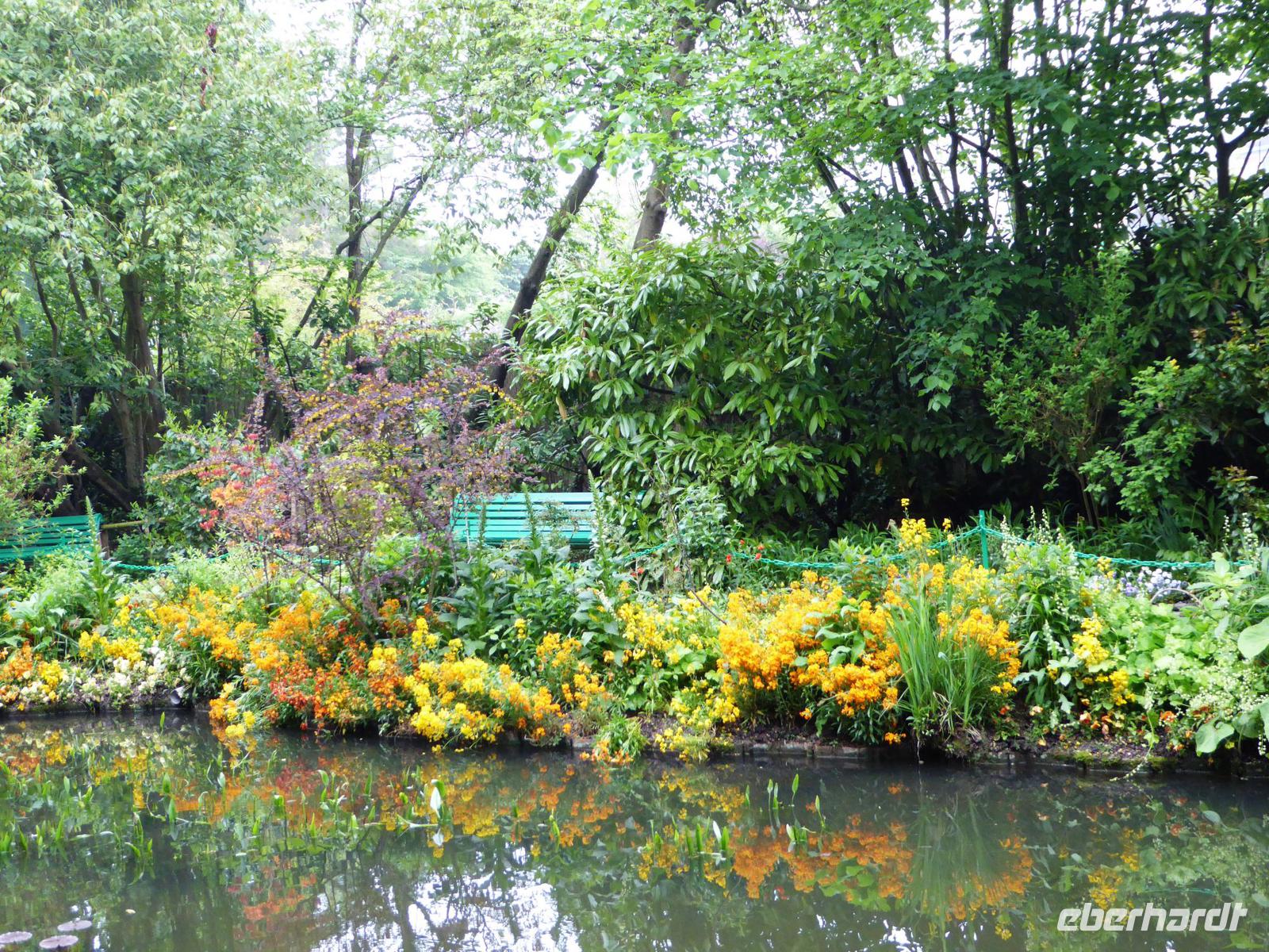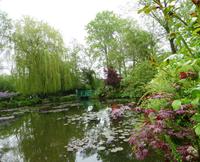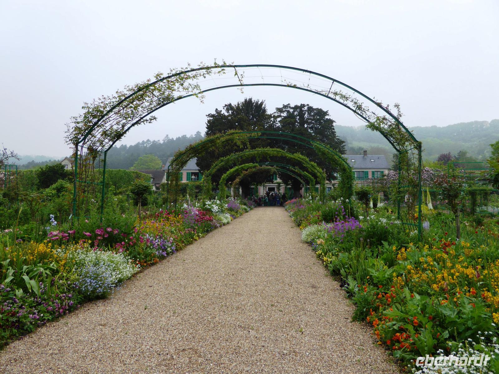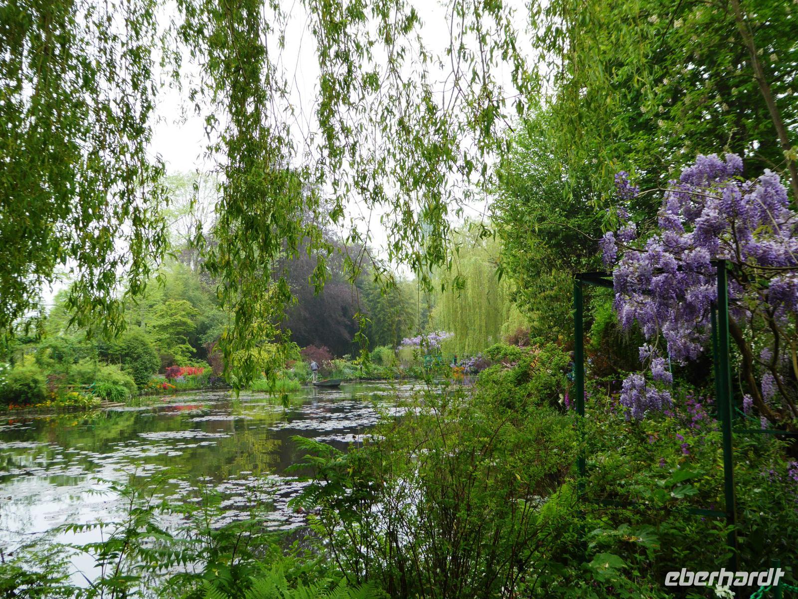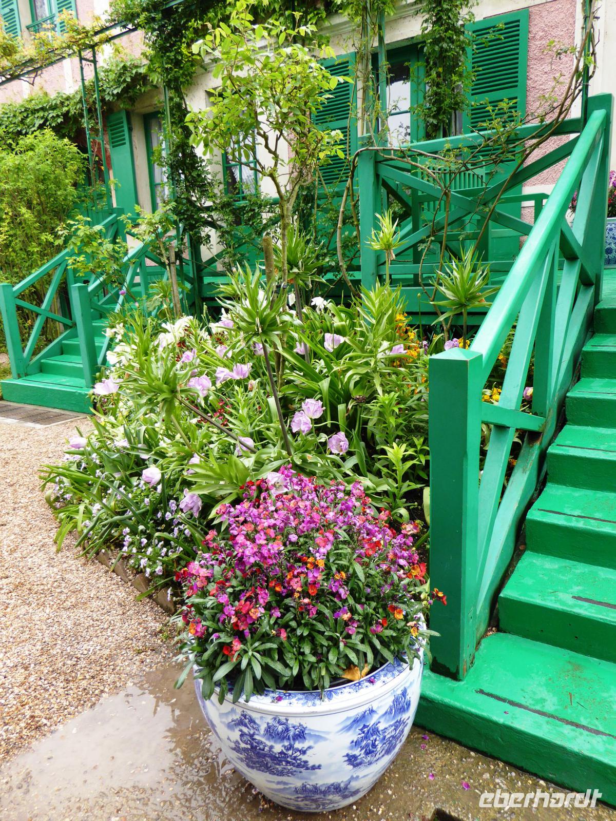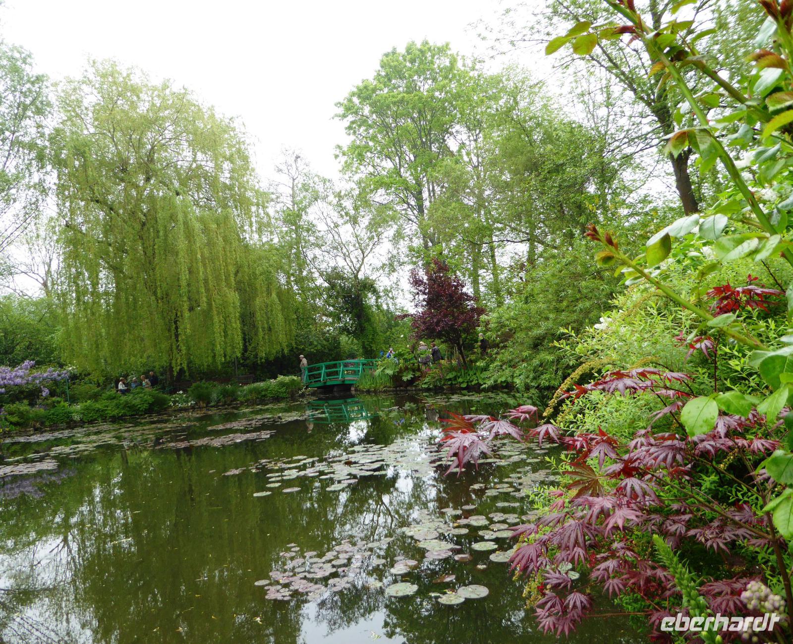Es ist nur ein kurzer Weg über die Brücke und dann in das nächste Dort, das aus seiner friedlichen Abgeschiedenheit schon Ende des 19. Jahrhunderts herausgeholt worden ist, als Claude Monet mit Hilfe der Unterstützung seines Freundes, des Kunsthändlers Paul Durand-Ruel, das kleine Haus, das sogenannte Clos Normand mit einem kleinen Garten, für sich und seine Familie kaufte. Mit den Jahren verschönerte er es; auch kaufte er Grundstück dazu, um den Garten zu vergrößern. Nach einem langen Kampf erhielt er die Genehmigung, Wasser aus einem Zufluss der nahegelegenen Epte abzuzweigen und legte einen großen Seerosenteich an. Hier entstanden seine berühmten großen Seerosenbilder. Im Wohnhaus ist das kleine Atelier zu besichtigen, im Anbau das große, helle Seerosenatelier. Als Besucher können wir uns gut vorstellen, wie er hier mit seiner Familie gelebt und gearbeitet hat, Freunde empfangen hat. Außer den Ateliers besichtigen wir auch die vielen kleineren und größeren Zimmer, das Esszimmer und die wunderschöne Küche.