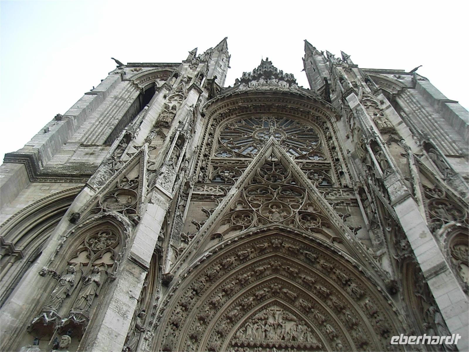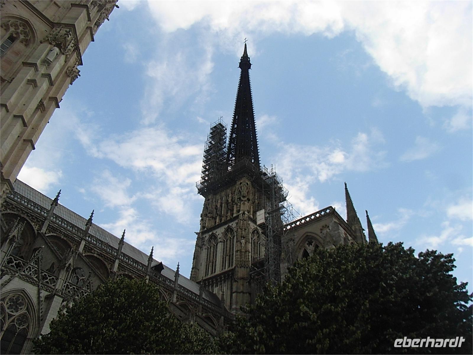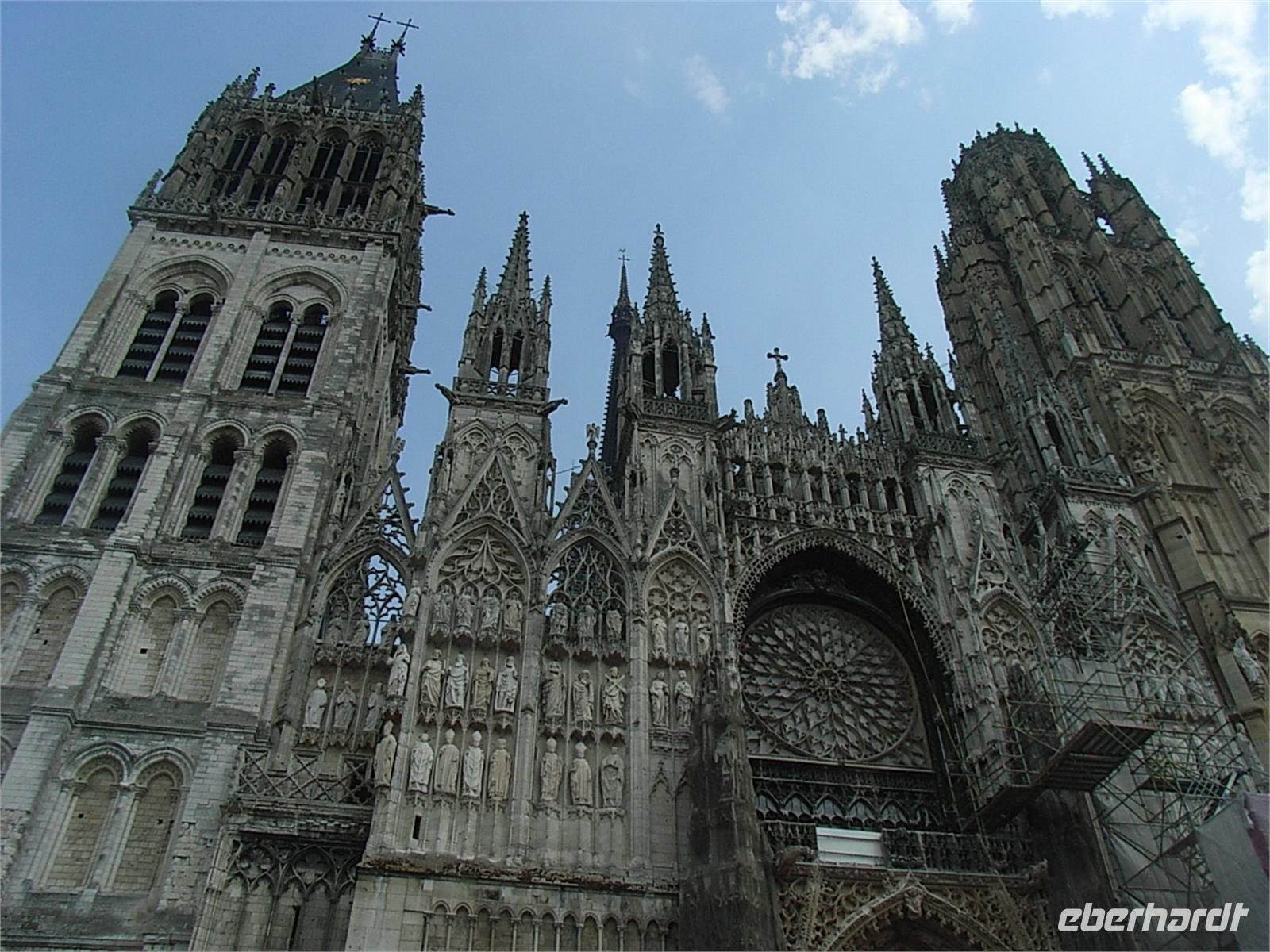 Heute führt uns unser Ausflug nach dem Mittagessen nach Rouen. Wir bestaunen die mächtige Kathedrale Notre-Dame, die Kirche St-Maclou und das alte St-Maclou mit seinem Innenhof, der im Mittelalter als Friedhof und Beinhaus diente. Die geschnitzen Totentanzmotive im alten Fachwerkgemäuer deuten noch auf diese Bestimmung hin. Heute dient diese interessante Anlage als regionale Kunstschule. Wir bummeln weiter durch verwinkelte Gassen mit teils schiefen und ebenso verwinkelten Fachwerkhäusern. Auf unserem Weg zum alten Marktplatz, auf dem Jeanne d’Arc im Jahre 1431 nach ihrem Prozess hier in Rouen auf dem Scheiterhaufen verbrannt wurde, durchqueren wir in der