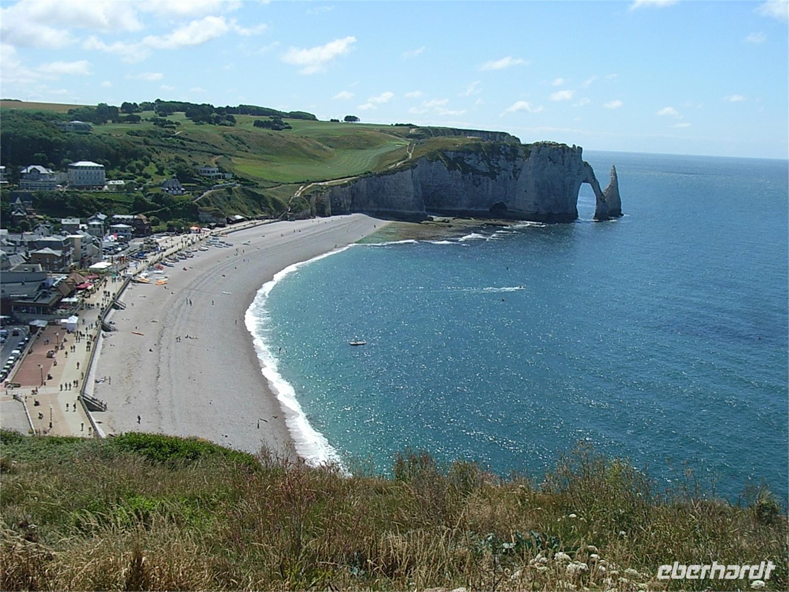 Am Nachmittag beginnt unser Ausflug nach Étretat. Alle 4 Busse mit den Passagieren unseres Gastschiffes fahren gemeinsam. Durch eine herrliche Landschaft erreichen wir den Küstenort am Ärmelkanal Étretat. Monet malte hier sein berühmtes Bild mit den Fischerbooten. Die hübsche Uferpromenade lädt uns ein zum Verweilen in einem netten Café oder zu einer Wanderung. Wir müssen uns nur noch für eine Richtung entscheiden. Entweder in Richtung Falaise d’Amont, das sich östlich von Étretat befindet, rechts hinauf zur kleinen Kapelle oder nach links Richtung Falaise d’Aval mit der Porte d’Aval, die an einen Elefantenrüssel erinnert, der neben der sogenannten Felsnadel ins Wasser taucht. Der verträumte Fischerort ist bezaubernd schön und möchte ein mondäner Badeort werden. Es wird gebaut und über dem Ort erhebt sich bereits ein chices Hotel mit einer angrenzenden Golfanlage, die auf Sportbegeisterte wartet. Segeln, Windsurfen, Schwimmen und Baden gehören