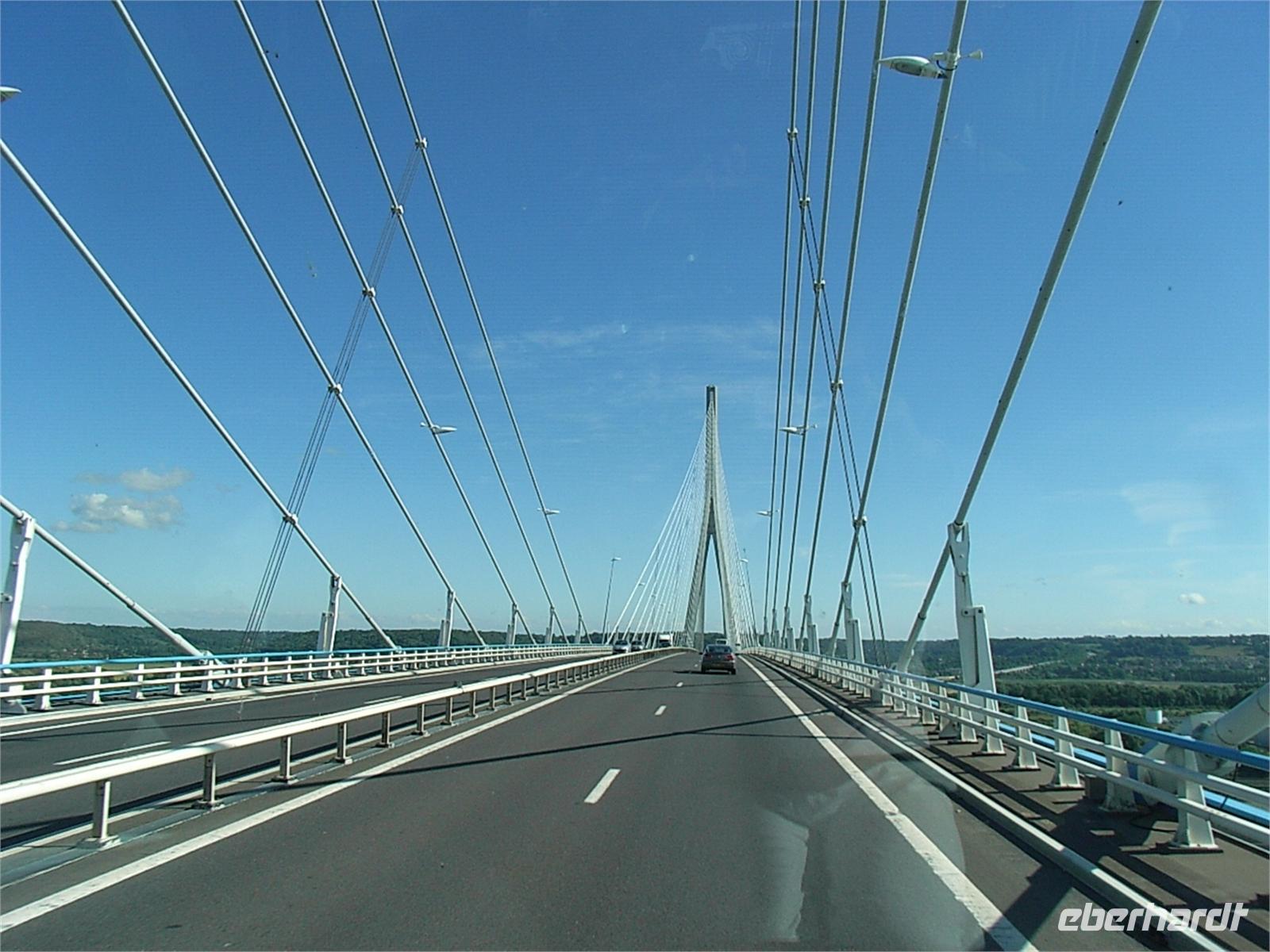 natürlich dazu. Nach ausreichender Freizeit fahren wir wieder im Konvoi zurück. Unsere Fahrer haben für uns einen interessanten Haltepunkt ausgemacht, von dem aus wir auf die Hafenanlagen von Le Havre blicken können, aber auch auf die Pont de Normandie, die uns mehr in ihren Bann zieht. Sie ist ein technisches Meisterwerk, das den Rekord der Spanndrahtbrückenlänge überschritten hat. Ihre Abspannseile haben eine Länge von 865 m und sie hält Windspitzen bis zu mehr als 300 km/h stand, manche behaupten sogar bis zu 440 km/h. Sie wird dem zukünftigen Europa ermöglichen, den Süden und den Norden zu verbinden, ohne Paris durchfahren zu müssen.