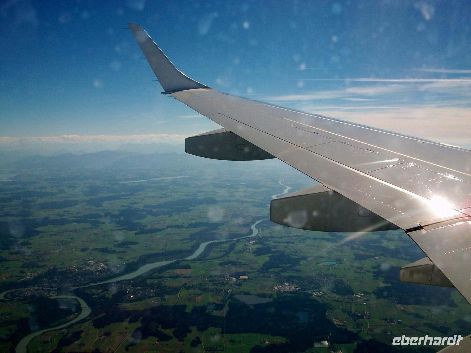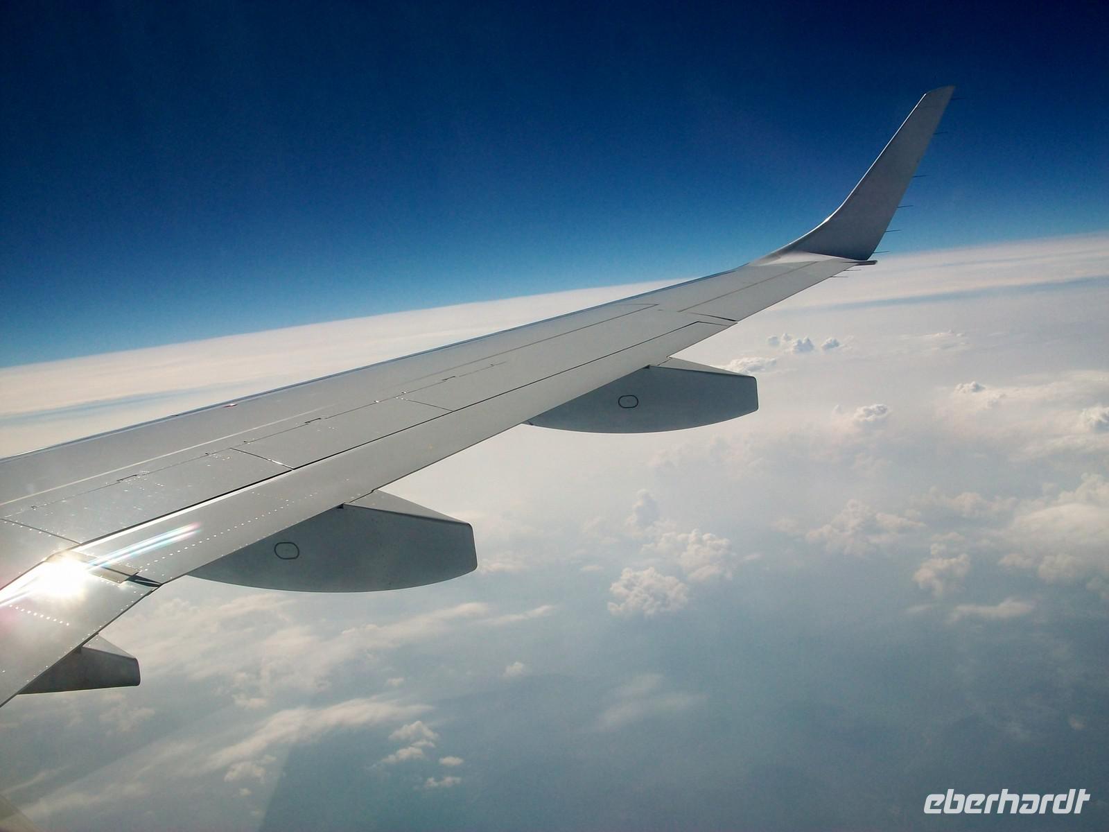 Kurz vor halb zehn rollt die Maschine zur Startbahn, dort beschleunigt sie schnell so dass wir in die weichen Sessel gedrückt werden und dann hebt sie ab. Mit einem großen Bogen umfliegt die Maschine Dresden, links sehe ich die Erhebungen von Wachwitz und den Fernsehturm, aber es bleibt wenig Zeit bis wir die Wolkendecke durchstoßen haben. Hier, über den Wolken, empfängt uns strahlender Sonnenschein und unser Flugzeug beschreibt einen weiteren Bogen nach Süden.
