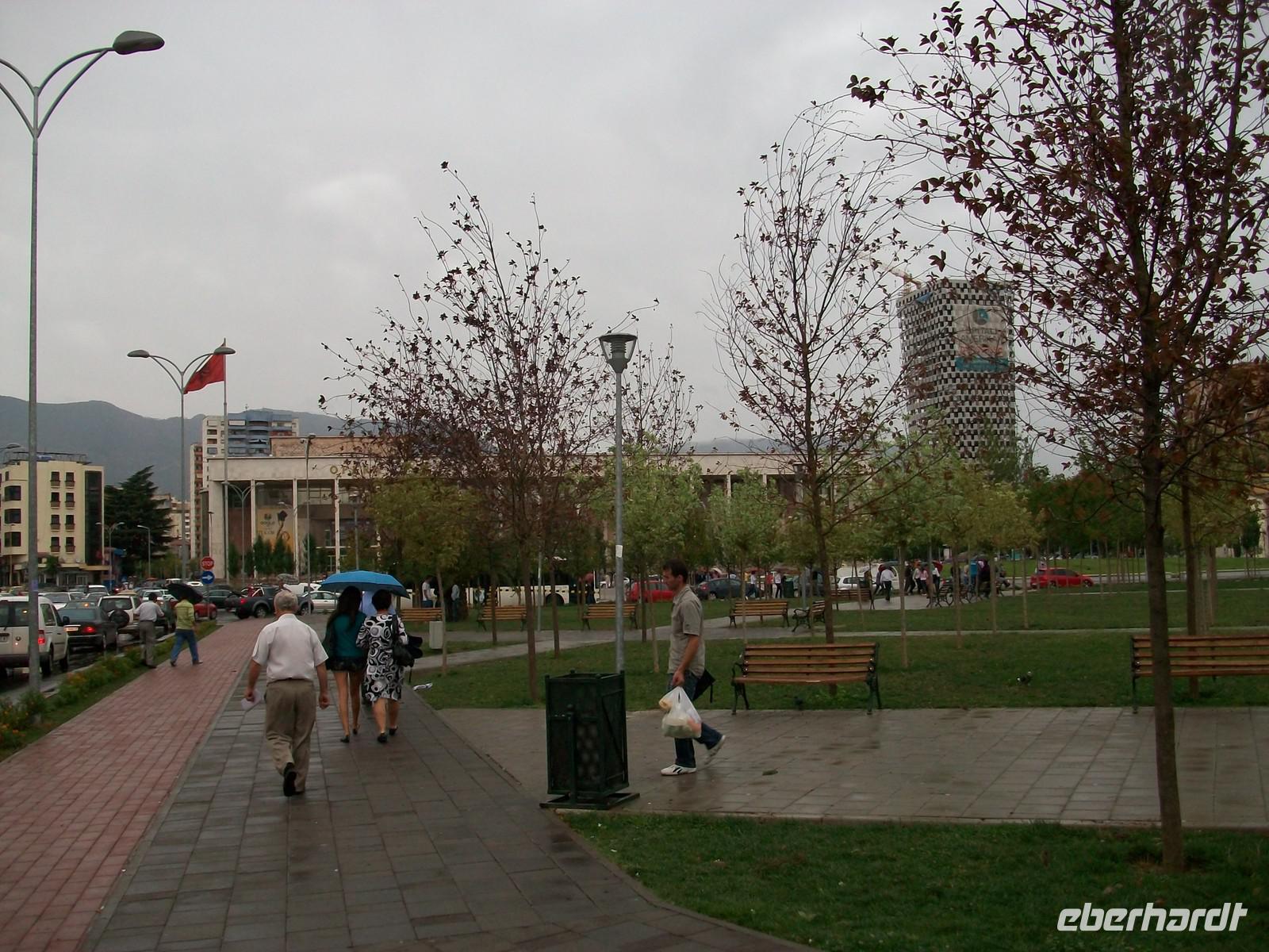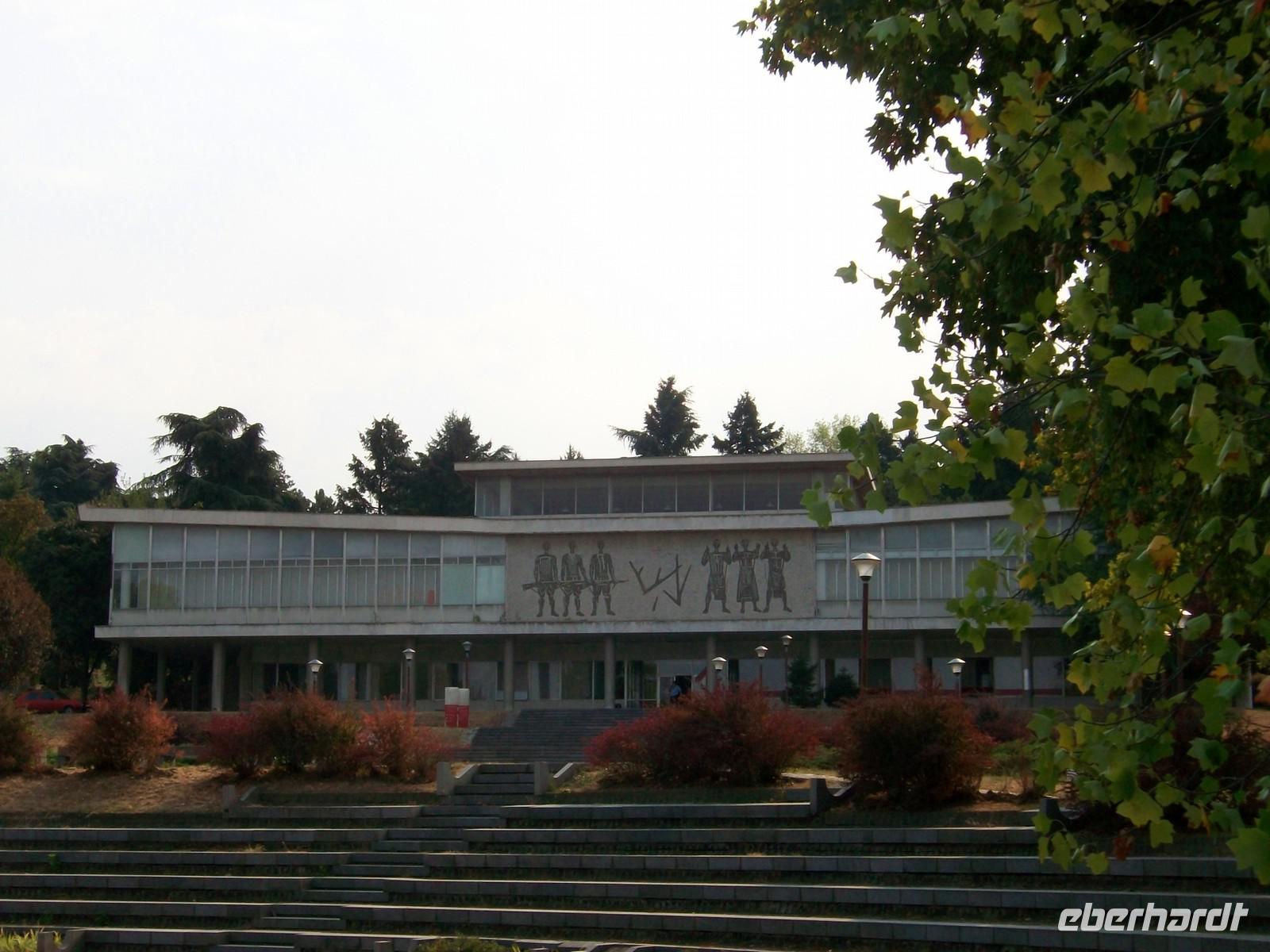 Die Altbausubstanz von Skopje ist bei dem verheerenden Erdbeben von 1963 fast völlig verschwunden; mächtige und nicht immer schöne Zweckbauten brachte den Obdachlosen dieser geschundenen Stadt aber wieder ein Zuhause. Wer diese Geschichte kennt wird auch nicht darüber enttäuscht sein dass dieses Stadtbild der neueren Häuser nicht als schön zu bezeichnen ist. Am Vardarufer entsteht viel Neues, es ist sehr gigantisch wird aber in den nächsten Jahren dennoch die Besucher anlocken, das Stadtbild der Zukunft ist hier noch im Entstehen. Am ehemaligen Bahnhof der heute ein Museum ist, Züge verkehren hier heute nicht mehr, beenden wir die Führung. Die Bahnhofsuhr ist zum Zeitpunkt des Erdbebens stehen geblieben, die Zeiger hat man gelassen, auch die Fassade des Bauwerks zur Mahnung an spätere Generationen.