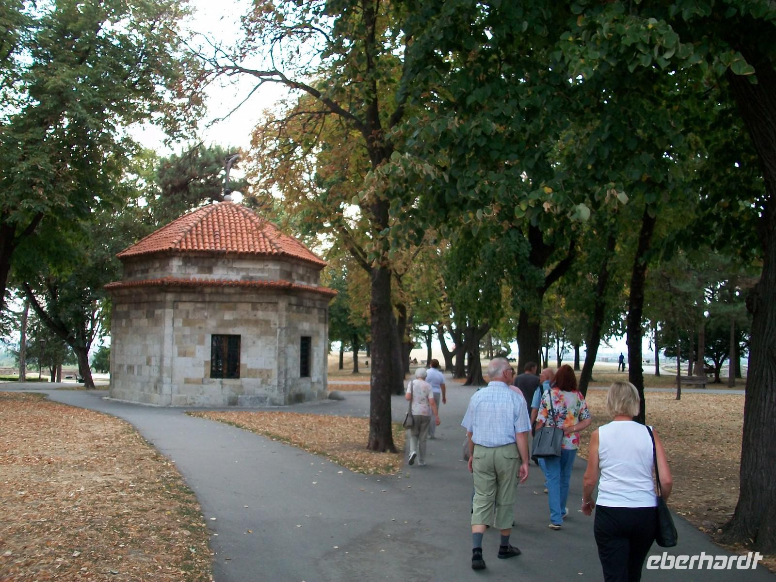 Dann fahren wir durch Südserbien, auf den Feldern sind fleißige Menschen dabei rotleuchtende Paprika zu ernten die dann gleich auf offene Wagen verladen werden. Hier in diesem Teil Serbiens ist die Kosovarische Grenze nicht weit, in der Vergangenheit gab es auch immer mal kleinere Konflikte von denen der Tourist allerdings nichts mitbekommt. Ebene Flächen wechseln sich mit Gebirgsregionen ab und kurz nach 13.00 Uhr erreichen wir den Ort Niš. Zuerst besuchen wir den Schädelturm, ein perfides Zeugnis aus der Osmanischen Zeit, heute für die Serben Nationalheiligtum. Diese Grausamkeiten sind für den Balkan sehr typisch, gehört aber zu jener Geschichte die dem aufmerksamen Touristen nicht gleichgültig sein kann. Dann geht es zur direkten Innenstadt, hier führt uns Bogdanka durch die Festung und später erklärt sie noch einiges vor der Fußgängerzone.